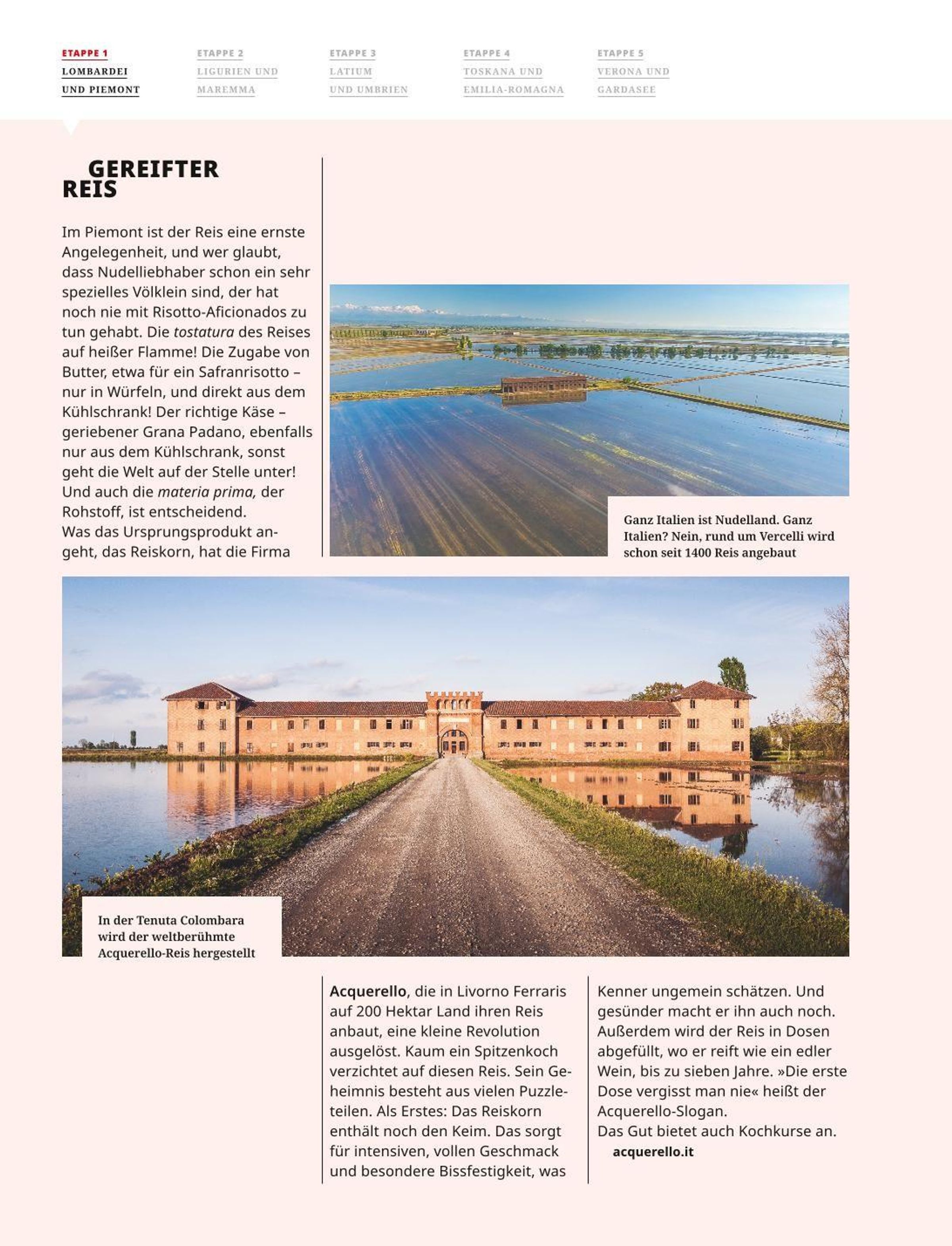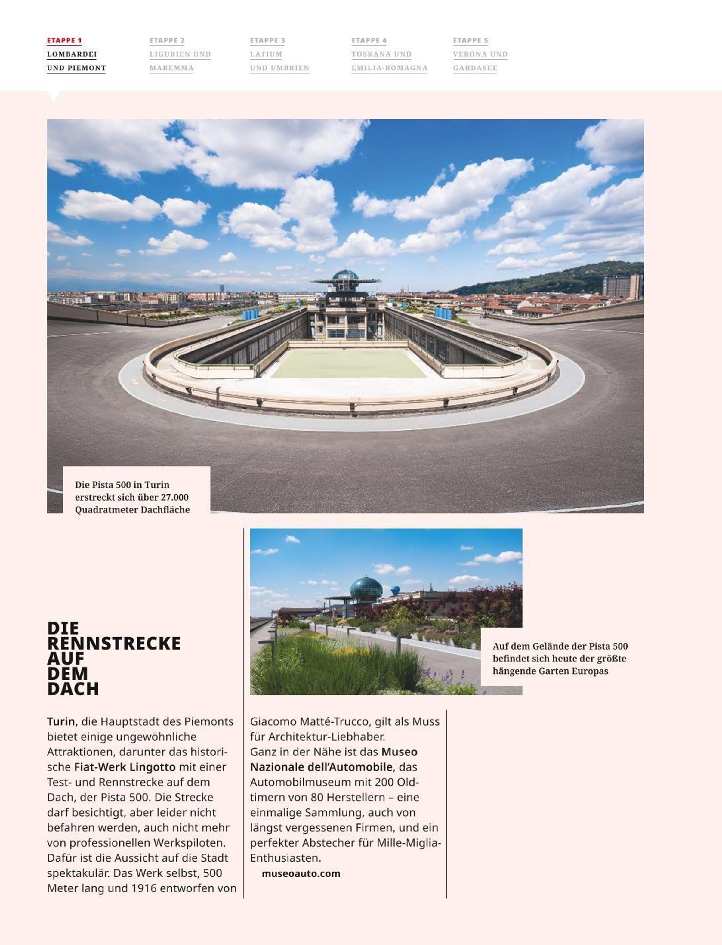 Es ist eine Rundfahrt mit allen Sinnen. Der Duft von Benzin und Öl vermischt sich mit dem Duft von Jasminblüten, Salbei und Rosmarin. Auf den Küstenstraßen fährt uns der Wind durchs Haar und auf den Serpentinen des Apennin genießen wir die weiten Ausblicke. Wir stecken unsere Nase in die Töpfe von Spitzenköchen, wir kosten die Spezialitäten der Region und füllen bei außergewöhnlichen Winzern den Kofferraum. Wir stellen die schönsten Sehenswürdigkeiten und interessantesten Museen links und rechts der Strecke vor und liefern Tipps für ganz besondere Hotels, Restaurants und Produzenten.