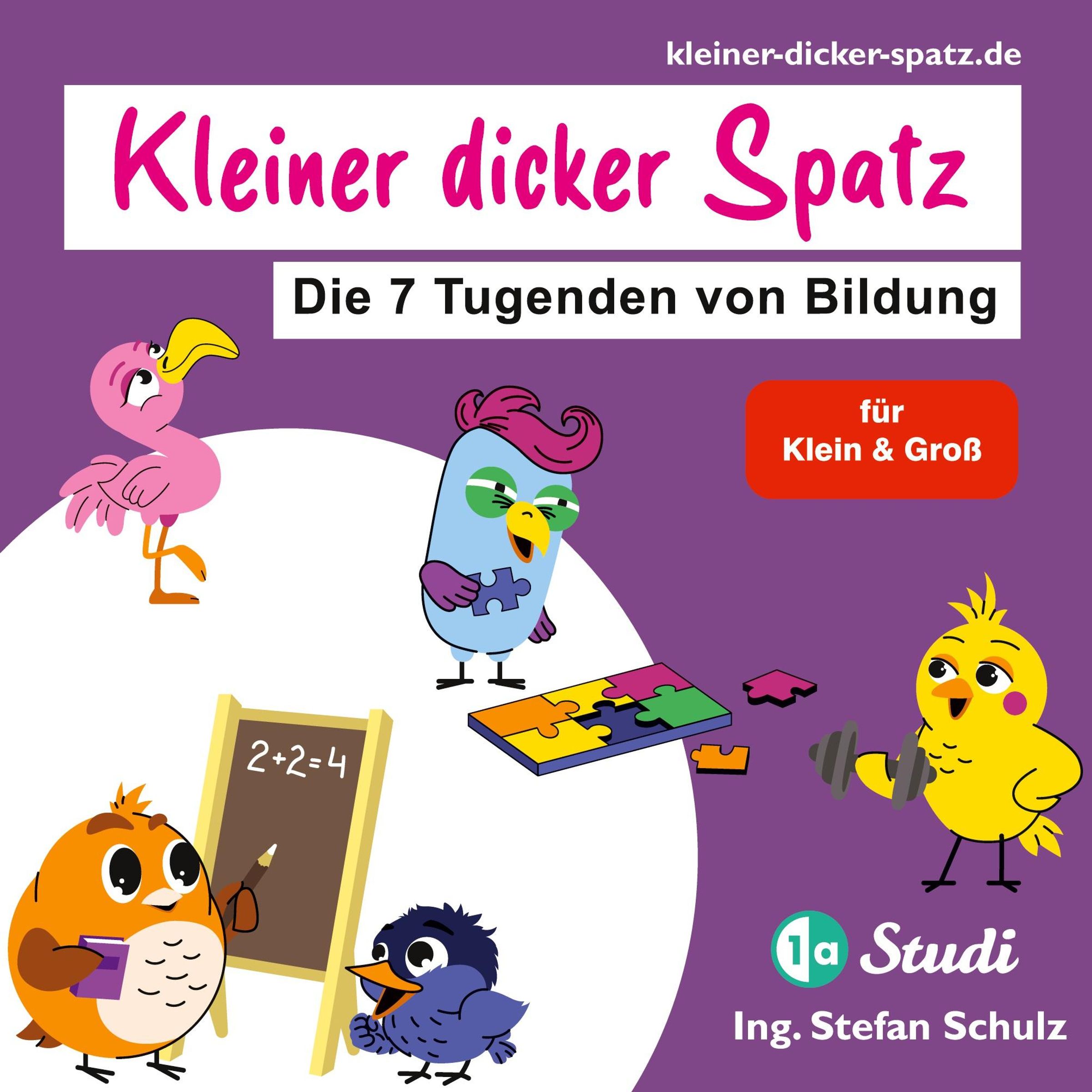 „Kleiner dicker Spatz“, „Die 7 Tugenden von Bildung“, bunte Vögel mit Spielzeug, Tafel und Hantel., Buch