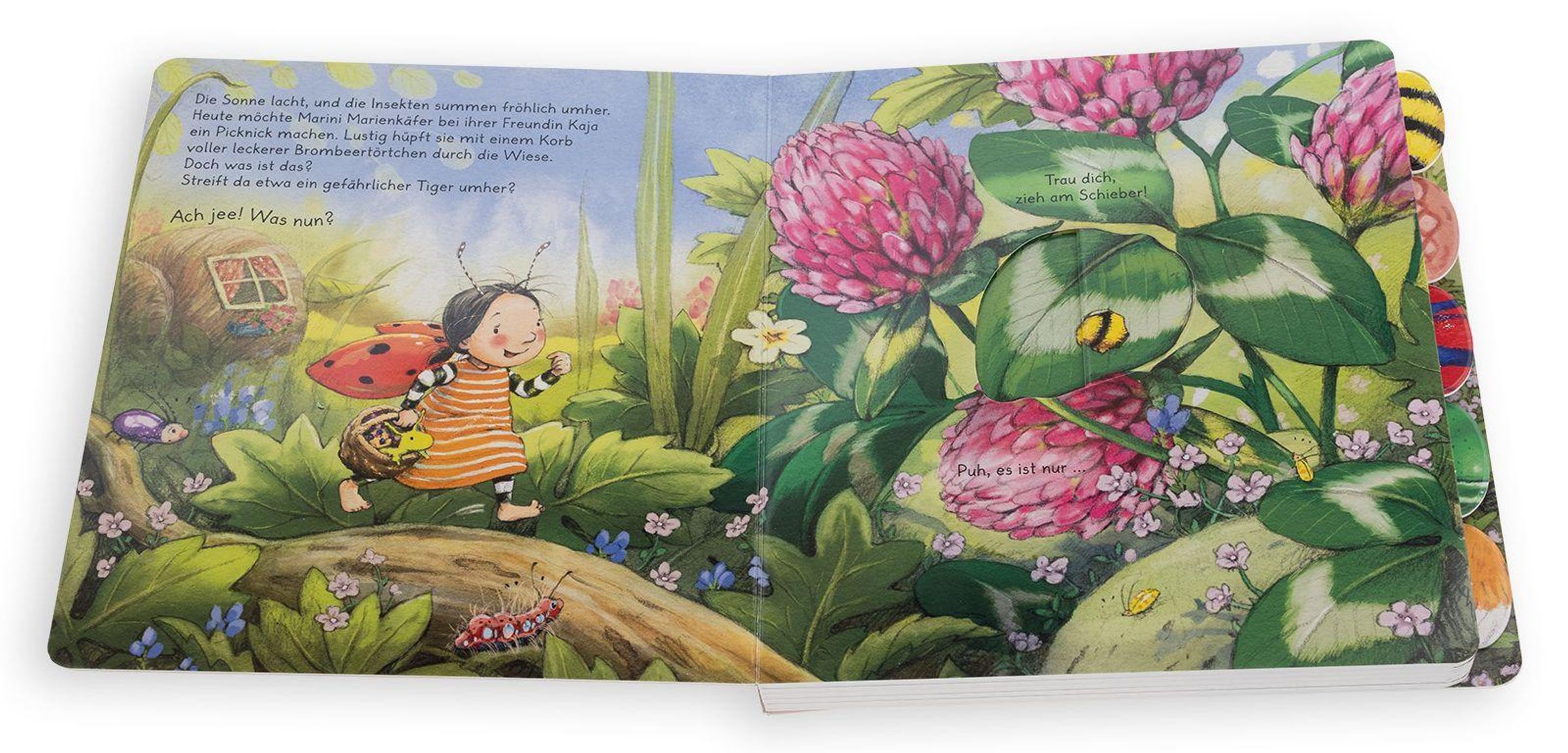 Marini Marienkäfer ist es ganz mulmig zumute: Gibt es hier auf der Wiese etwa wilde Tiere? Durch die Verwandelschiebertechnik zeigt sich, dass ihre Sorge unbegründet ist. Da streift nicht etwa ein wilder Tiger umher, sondern das schwarz-gelb schimmernde Muster hinter den Blättern gehört zu einer freundlichen Biene. Hinter jedem Schieber verbirgt sich etwas ganz Harmloses. Die "gefundenen" Wiesenfreunde begleiten sie nach und nach bis zu ihrer Freundin Kaja, die auf der anderen Seite der Wiese wohnt.