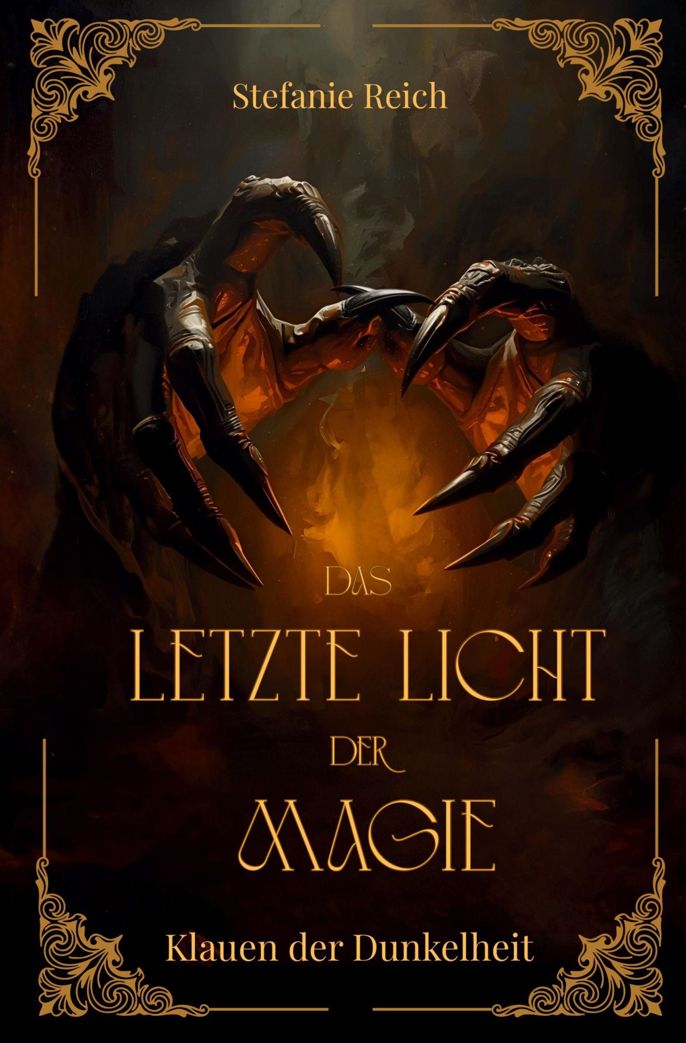 "Stefanie Reich. Das letzte Licht der Magie. Klauen der Dunkelheit." Dunkle, krallenartige Hände umgeben ein leuchtendes Licht., Buch