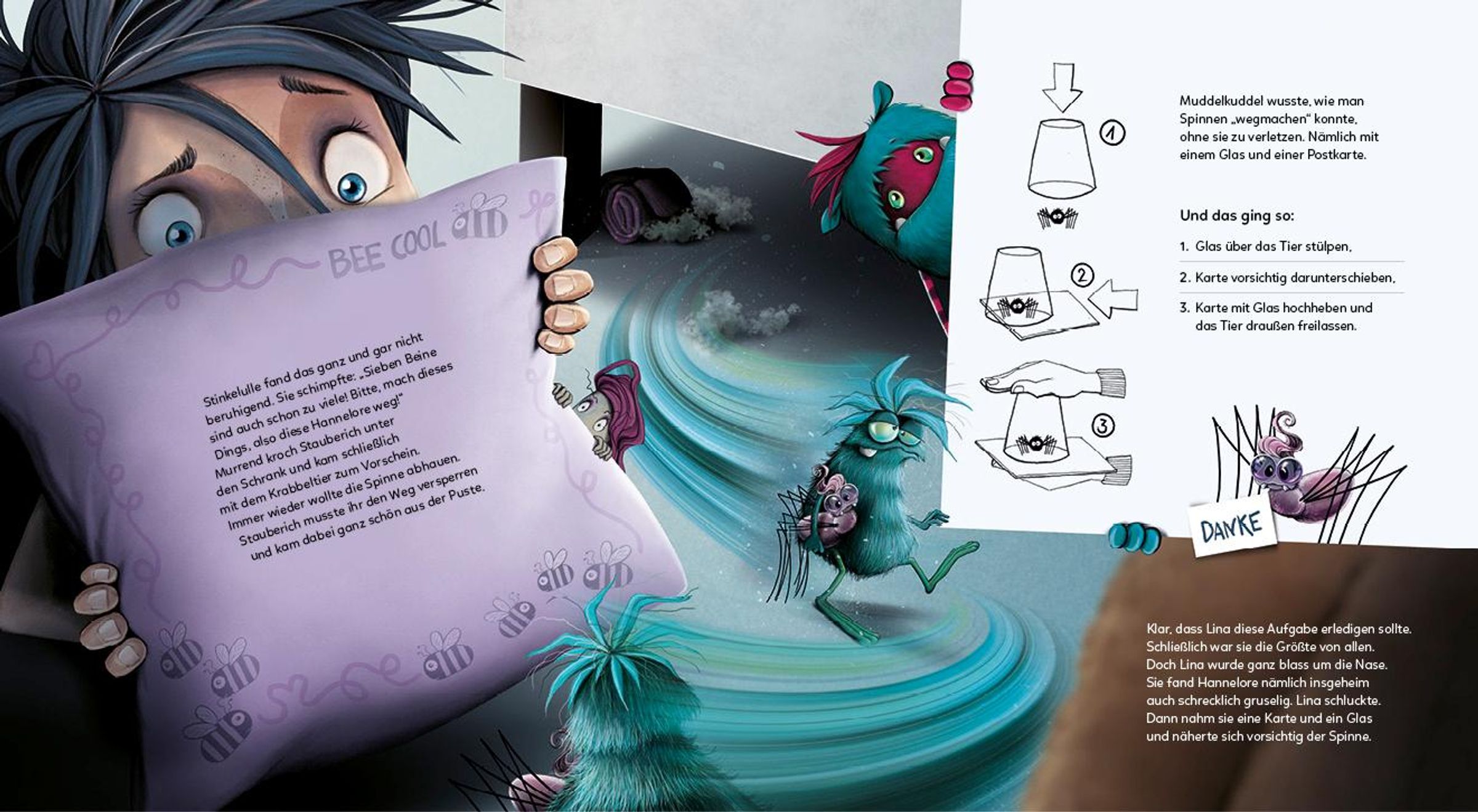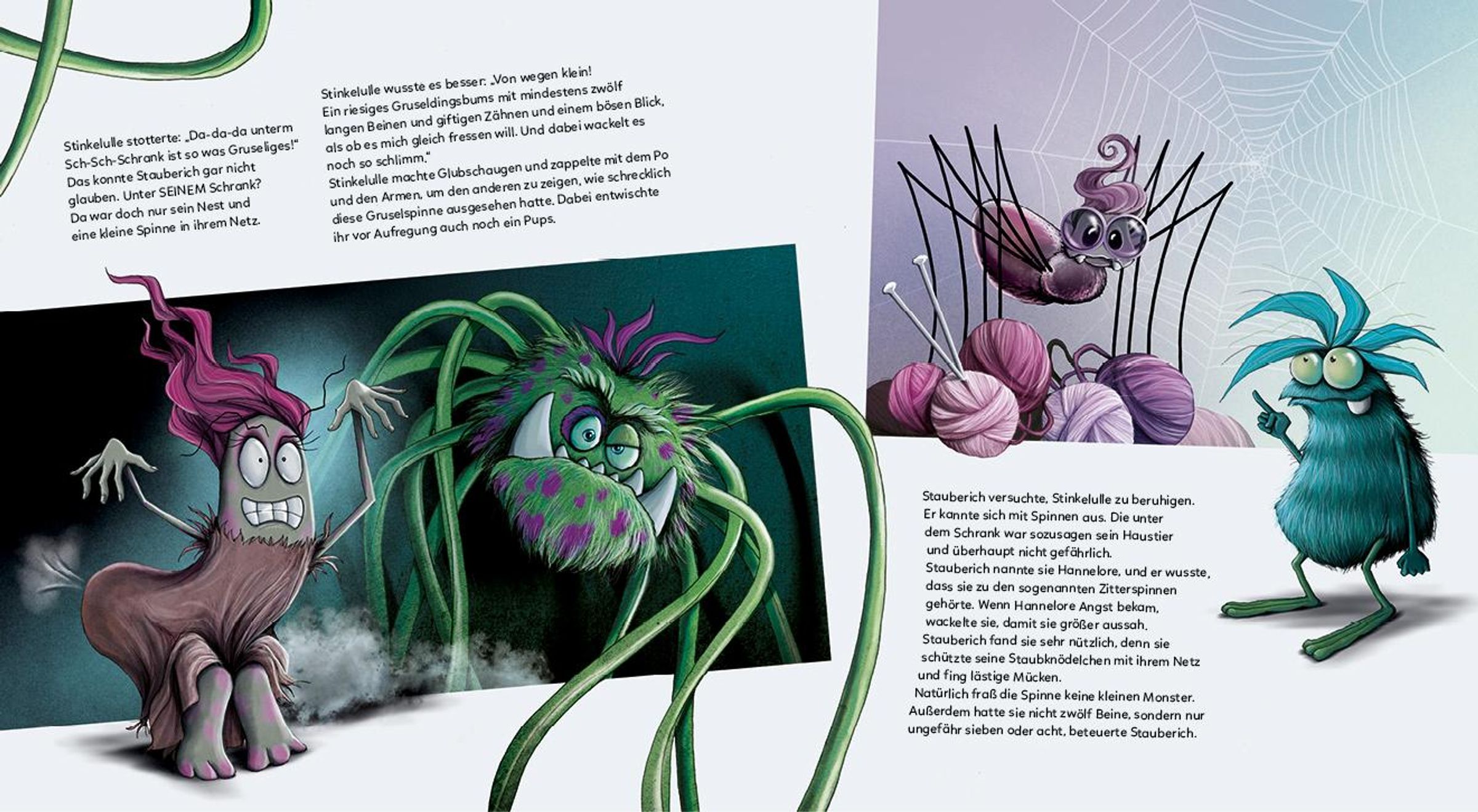 Monster gruselt es vor gar nichts? Von wegen! Als Lina mit ihren drei kleinen Monsterfreunden Muddelkuddel, Stauberich und Stinkelulle in ihrem Zimmer Verstecken spielt, taucht plötzlich ein Riesengruseldingsbums mit mindestens zwölf Beinen auf. Oder ist es doch nur die harmlose Zitterspinne Hannelore?