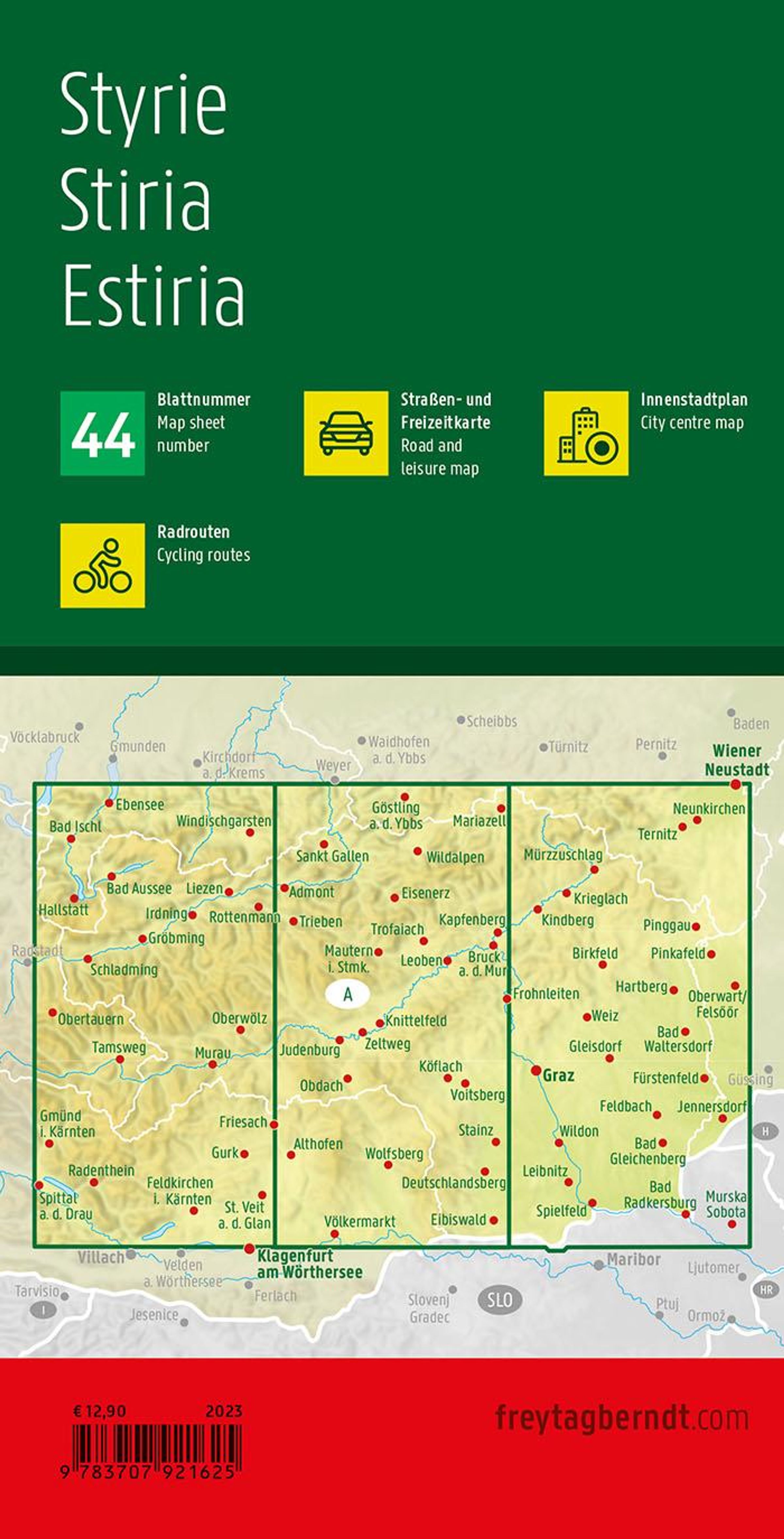 Details: Top 10 Tips Sehenswürdigkeiten, Top Citypläne von 17 steirischen Städten, darunter etwa Graz, Bruck an der Mur, Leoben und Weiz; Radrouten, doppelseitig.