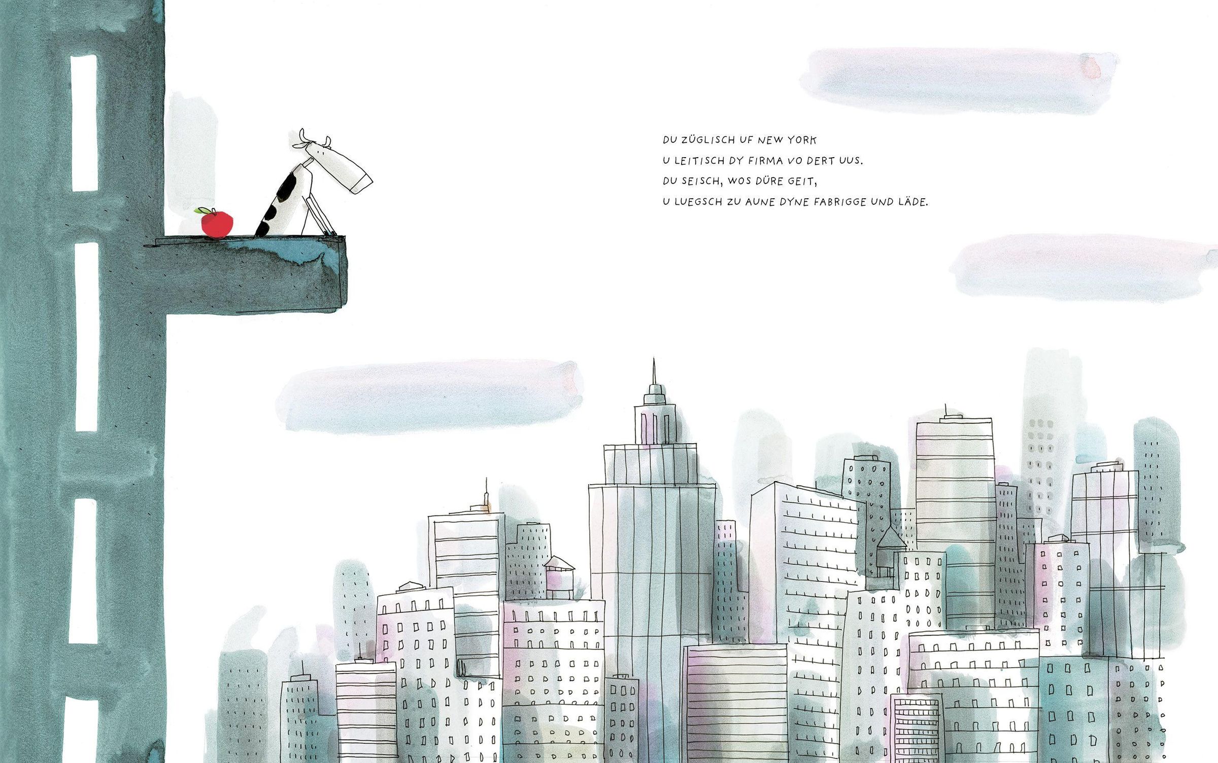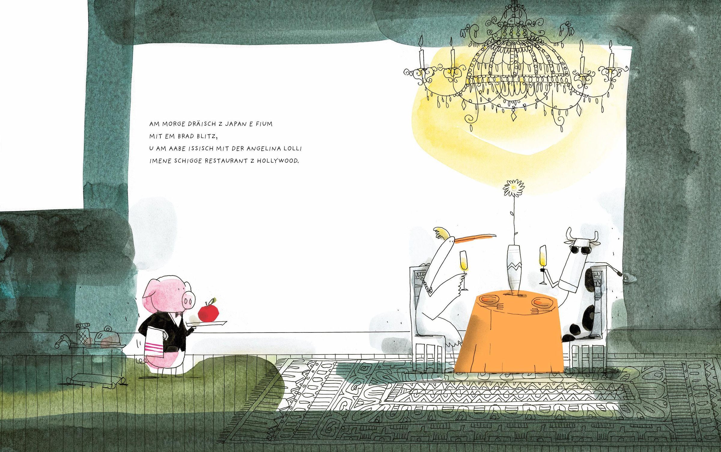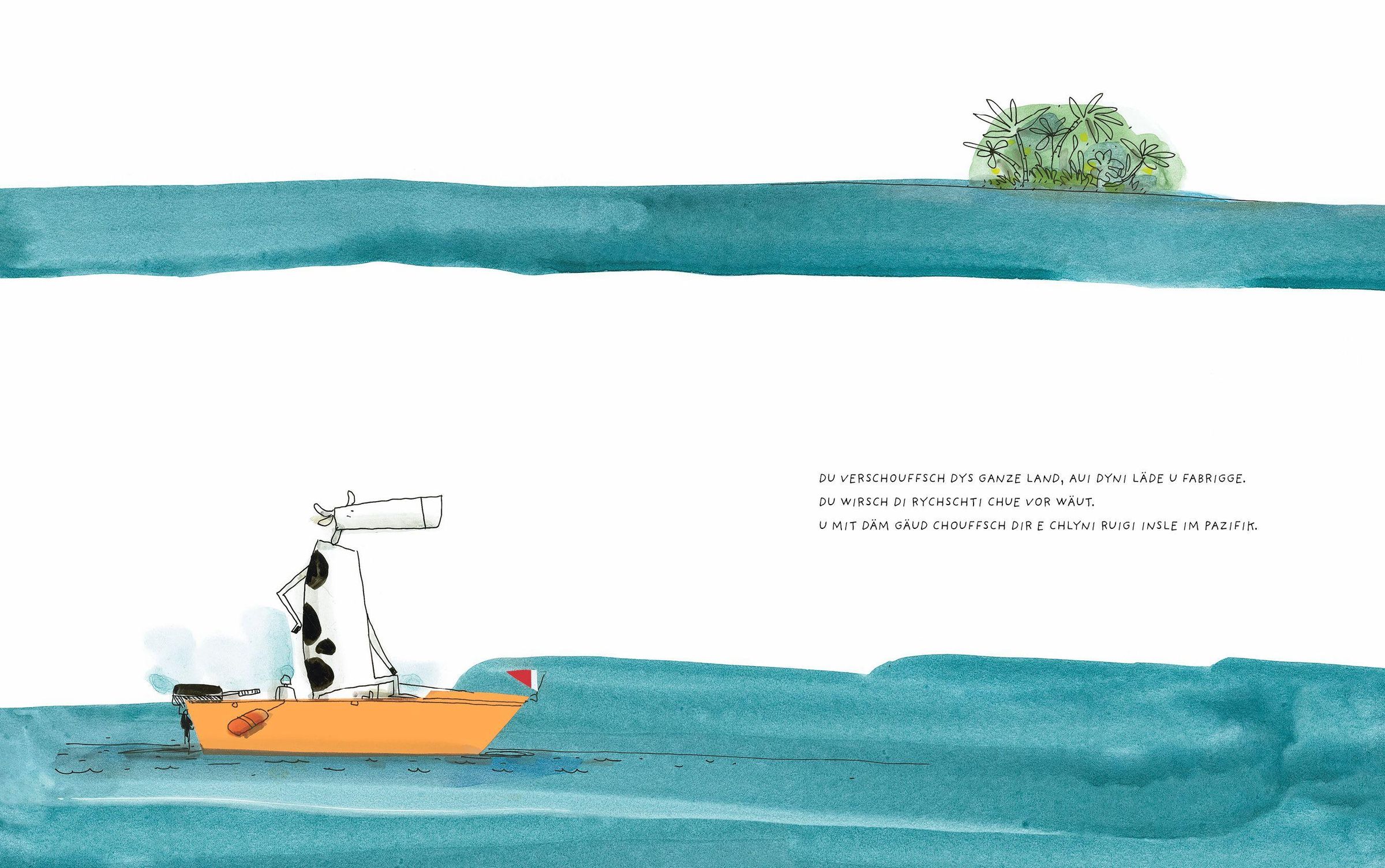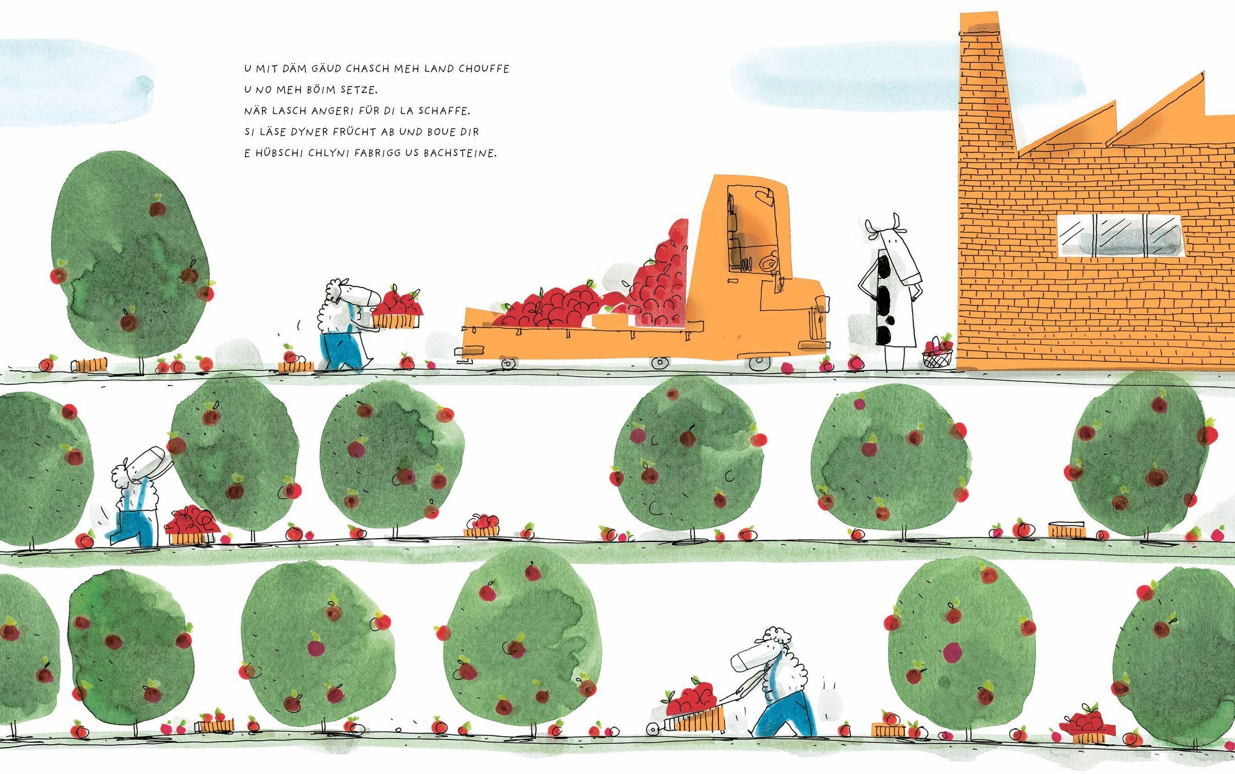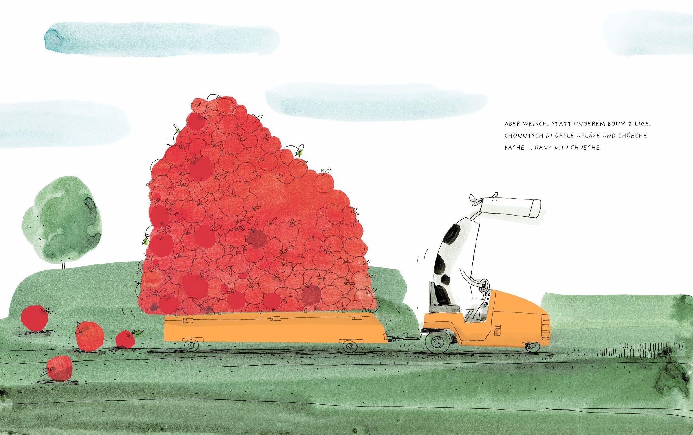 MUNDART-AUSGABE (BÄRNDÜTSCH) E Chue ligt zfride unger ihrem Öpfuboum. E Sou chunt verby u verzeut ere, was sie aus chönnt mache: en Öpfuplantage aalegge, d Frücht in ere Fabrigg verarbeite, viiu Gäud mache u gäng meh Fabrigge uuftue, bis si uf de ganze Wäut berüemt isch u Hollywoodstars wi d Angelina Lolli mit ihre wette Znacht ässe. D Chue findet das aues spannend, het aber en angeri Idee ... E witzigi Fable, won is dra erinneret, dass mir weder rych no wichtig müesse sy, fürs guet z ha. Mängisch längts, amene Summertag zäme unger eme Öpfuboum z lige.