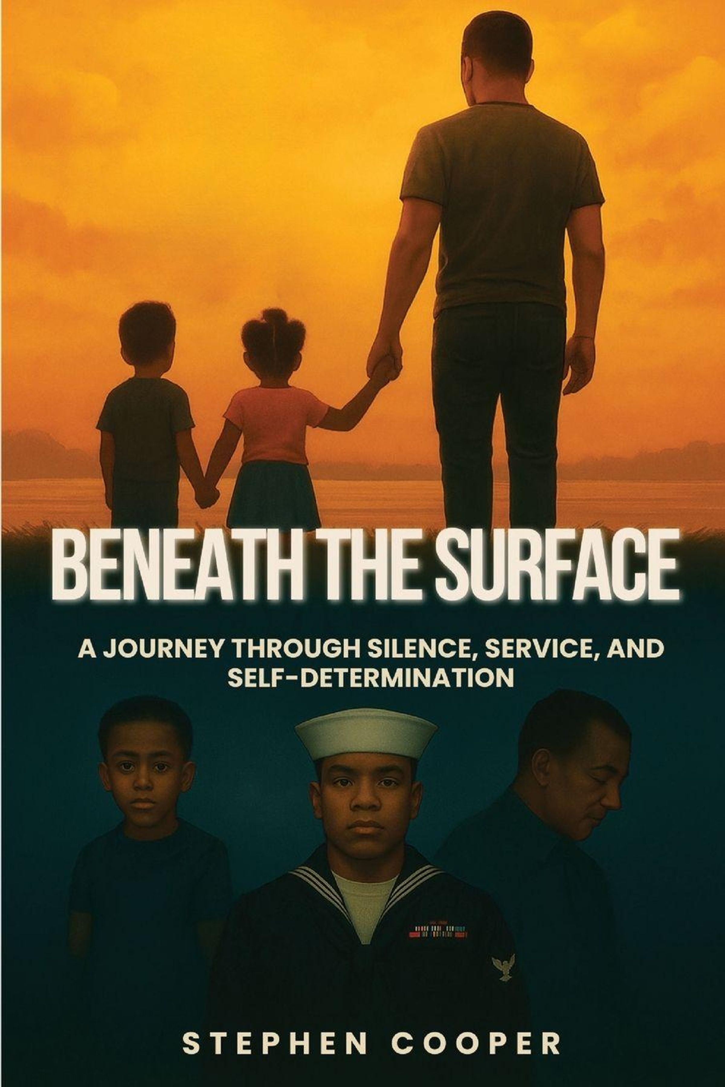 „Beneath the Surface“ – Eine Reise durch Schweigen, Dienst und Selbstbestimmung. Illustration: Mann mit Kindern im Sonnenuntergang., Buch