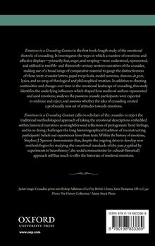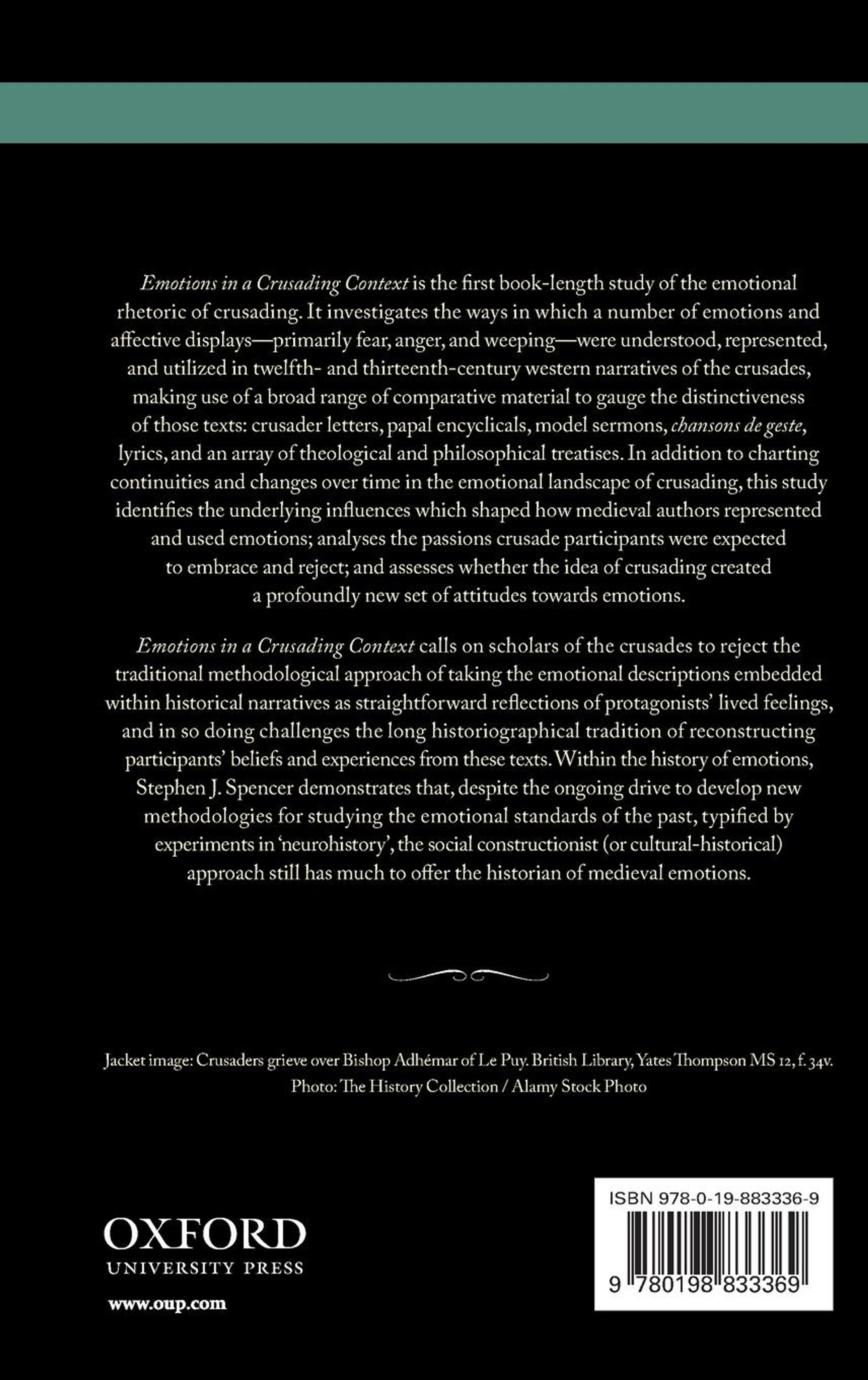 Emotions in a Crusading Context is the first book-length study of the emotional rhetoric of crusading. It investigates the ways in which a number of emotions and affective displays-primarily fear, anger, and weeping-were understood, represented, and utilised in twelfth- and thirteenth-century western narratives of the crusades, making use of a broad range of comparative material to gauge the distinctiveness of those texts: crusader letters, papal encyclicals, model sermons, chansons de geste, lyrics, and an array of theological and philosophical treatises. In addition to charting continuities and changes over time in the emotional landscape of crusading, this study identifies the underlying influences which shaped how medieval authors represented and used emotions; analyzes the passions crusade participants were expected to embrace and reject; and assesses whether the idea of crusading created a profoundly new set of attitudes towards emotions. Emotions in a Crusading Context calls on scholars of the crusades to reject the traditional methodological approach of taking the emotional descriptions embedded within historical narratives as straightforward reflections of protagonists' lived feelings, and in so doing challenges the long historiographical tradition of reconstructing participants' beliefs and experiences from these texts. Within the history of emotions, Stephen J. Spencer demonstrates that, despite the ongoing drive to develop new methodologies for studying the emotional standards of the past, typified by experiments in 'neurohistory', the social constructionist (or cultural-historical) approach still has much to offer the historian of medieval emotions.