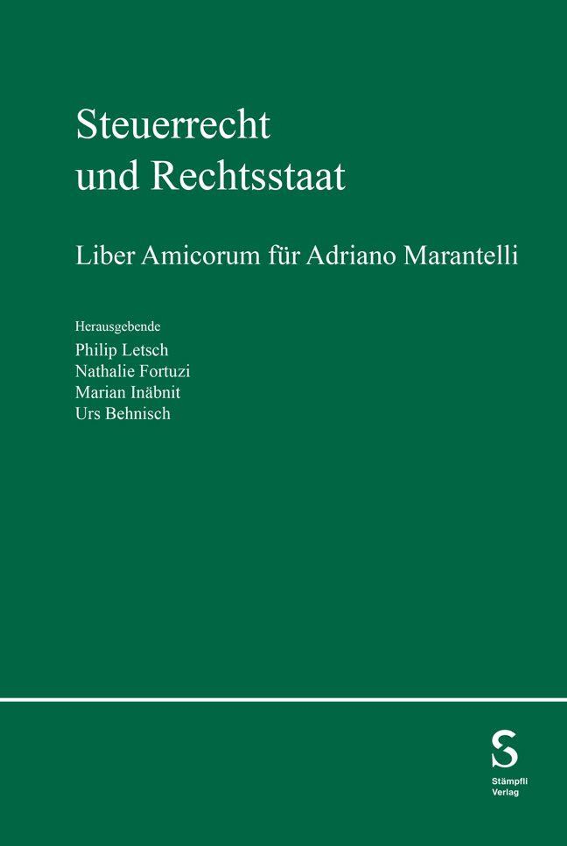 "Steuerrecht und Rechtsstaat. Liber Amicorum für Adriano Marantelli. Herausgebende: Philip Letsch, Nathalie Fortuzi, Marian Inäbnit, Urs Behnisch." Unten rechts ein Logo der Stämpfli Verlag. Hintergrund: dunkelgrün., Buch