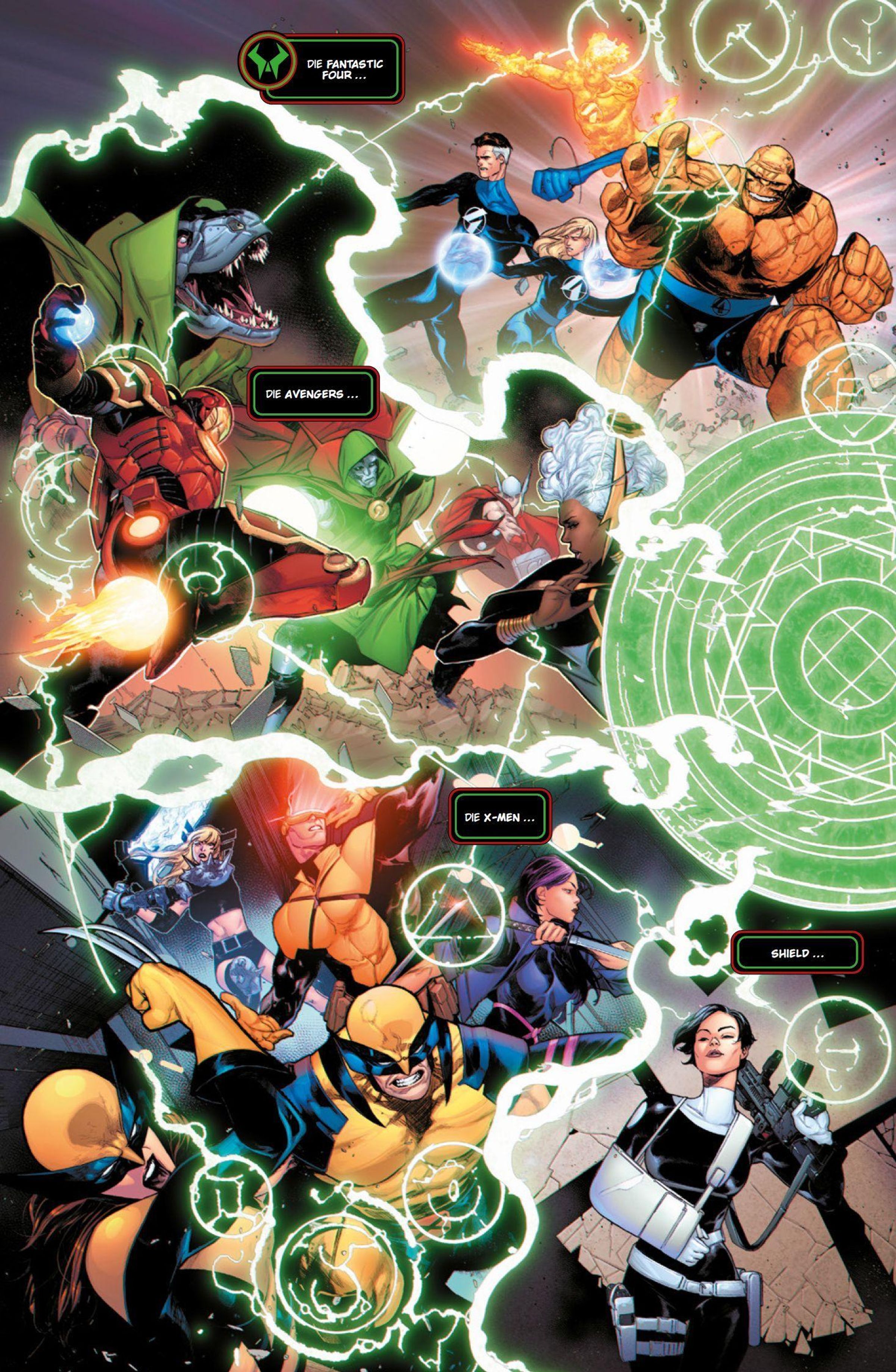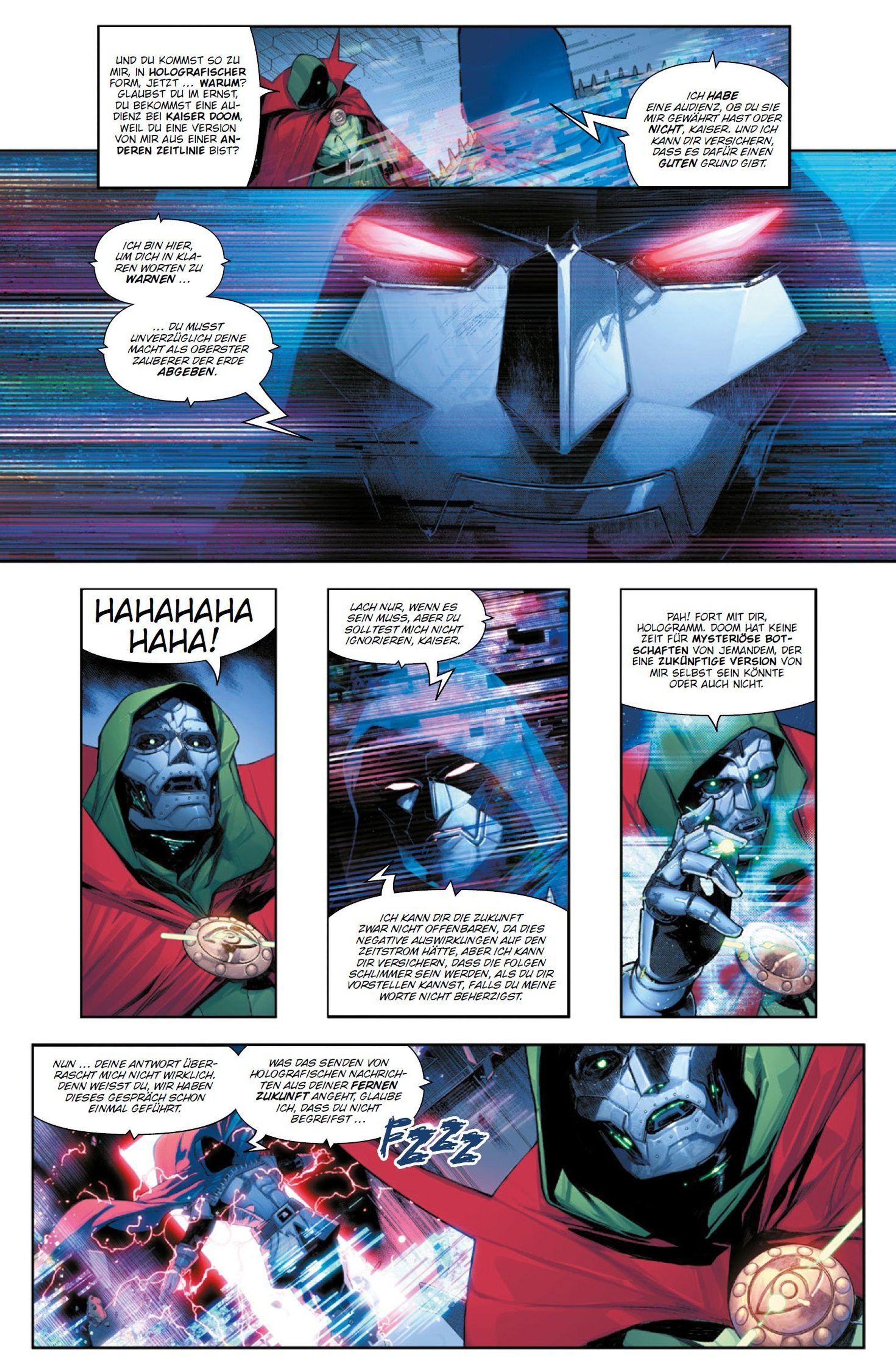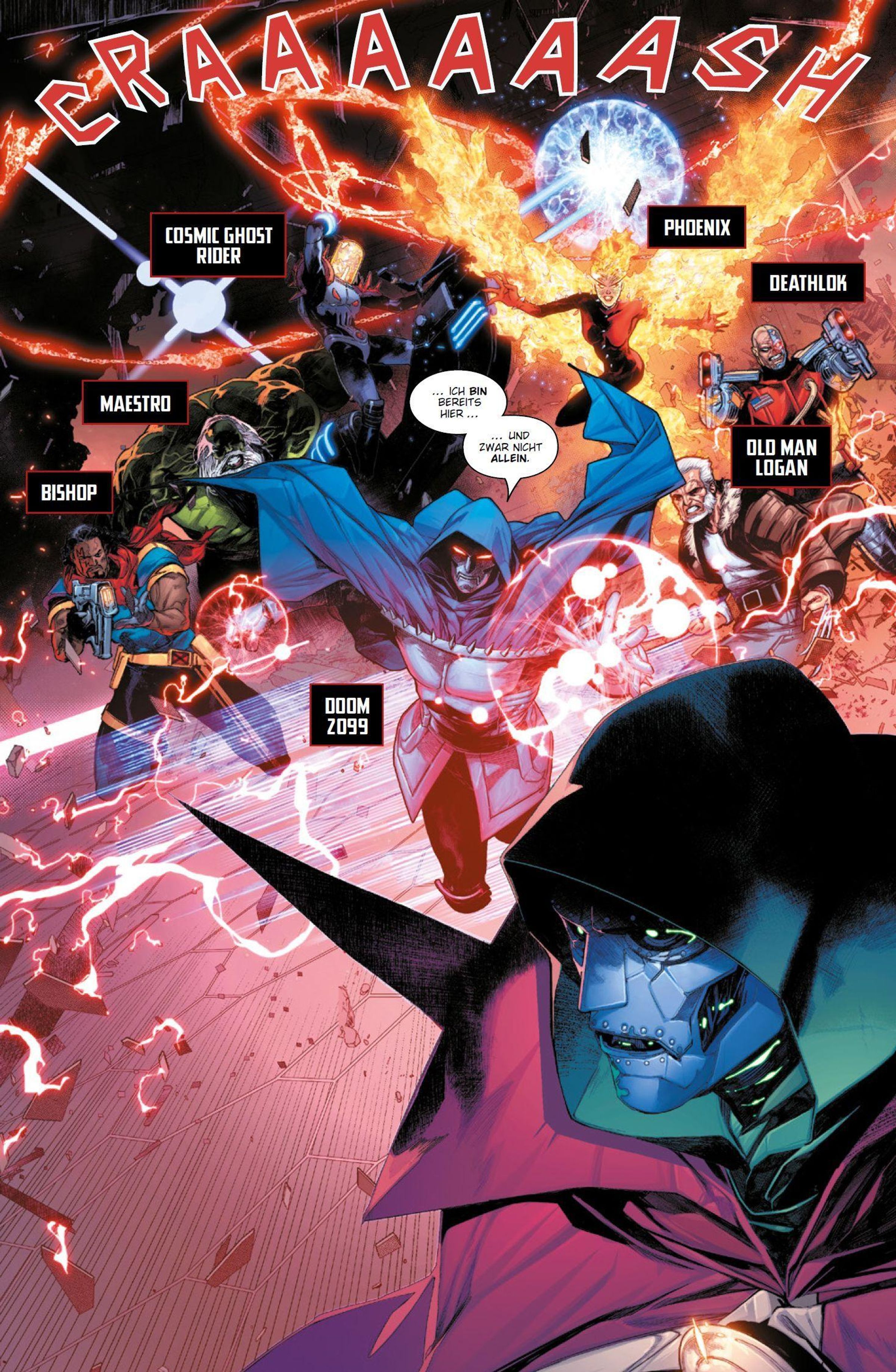 ANGRIFF AUS DER ZUKUNFT! In der Gegenwart herrscht Dr. Doom über die Welt. Doch nun taucht sein futuristisches Gegenstück Doom 2099 auf und verlangt, dass er die Macht des Obersten Zauberers abgibt! Die jungen Helden und Heldinnen von den Runaways werden indes von Doombots attackiert, Red Hulk sitzt nach seiner Flucht aus Latveria als Verräter in einem Knast und die Superior Avengers kämpfen in Wakanda gegen die Annihilation-Welle.