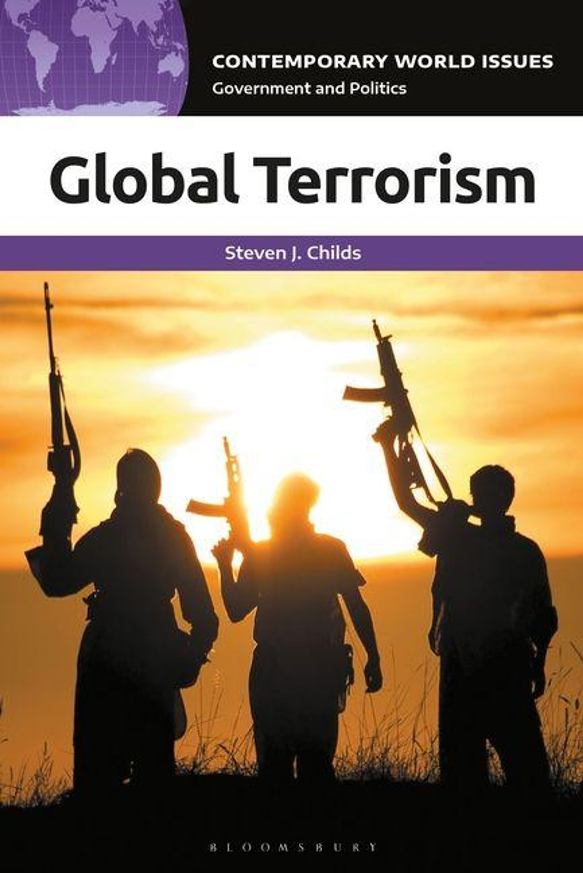 „Global Terrorism“; drei silhouettierte Figuren mit Waffen vor einem orangen Himmel., Buch