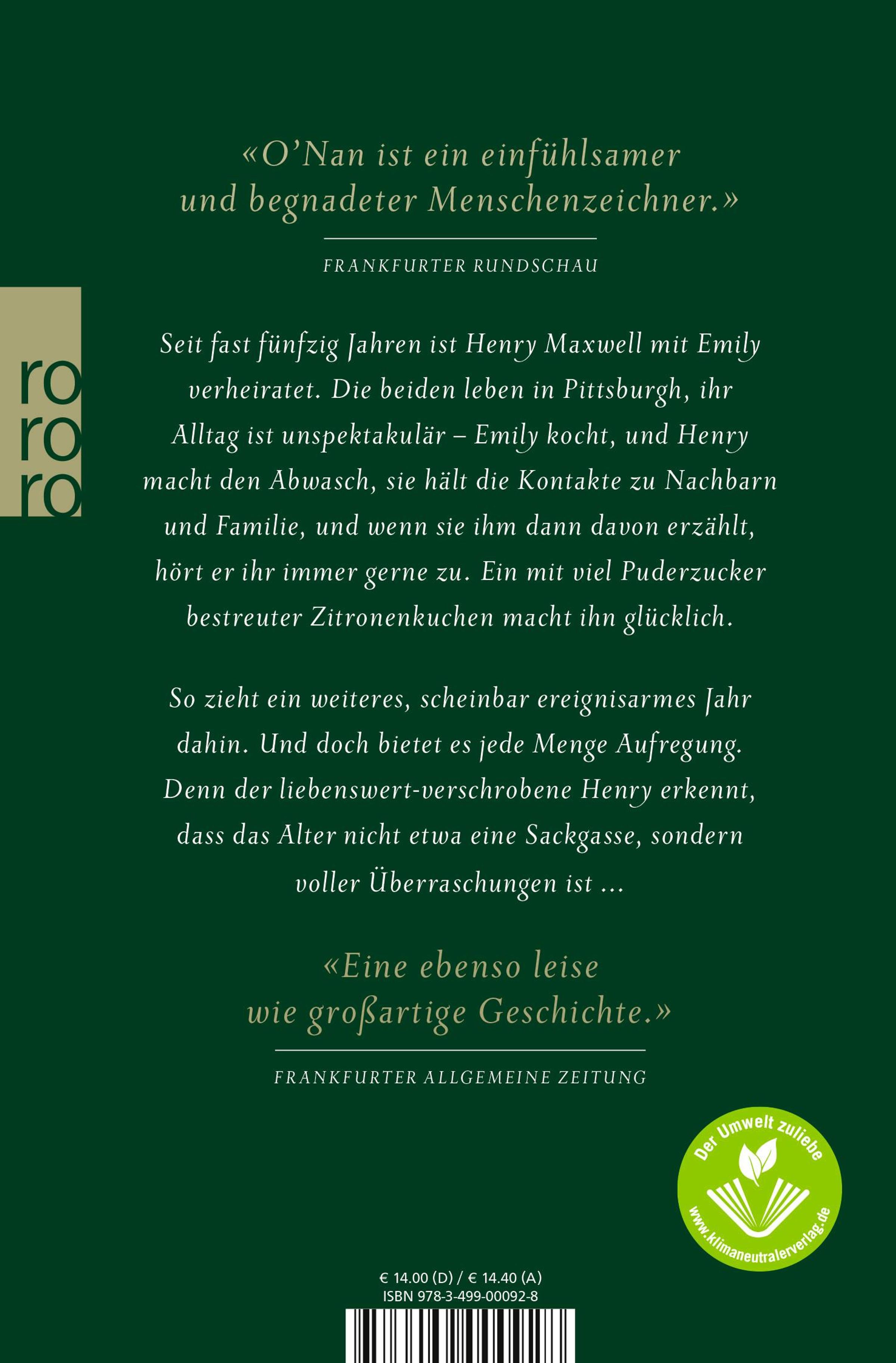 Seit fast fünfzig Jahren ist Henry Maxwell verheiratet - mit Emily, bekannt aus O'Nans hinreißendem Bestseller "Emily, allein". Im neuen Roman steht er im Zentrum, vielmehr die Ehe von Emily und ihm. Die beiden leben in Pittsburgh, Emily kocht, und Henry macht den Abwasch. Sie hält die Kontakte zu Nachbarn und Familie, und wenn sie ihm davon erzählt, hört er ihr immer gerne zu. Er repariert, was im Haus kaputt geht, trifft sich mit Freunden zum Golfen, engagiert sich im Kirchenvorstand und lädt - zu besonderen Anlässen - Emily ins Restaurant ein. Es ist das Porträt eines liebenswert-verschrobenen Mannes, der am Ende seines Lebens erkennt, dass das Alter nicht etwa eine Sackgasse, sondern voller Überraschungen ist.
