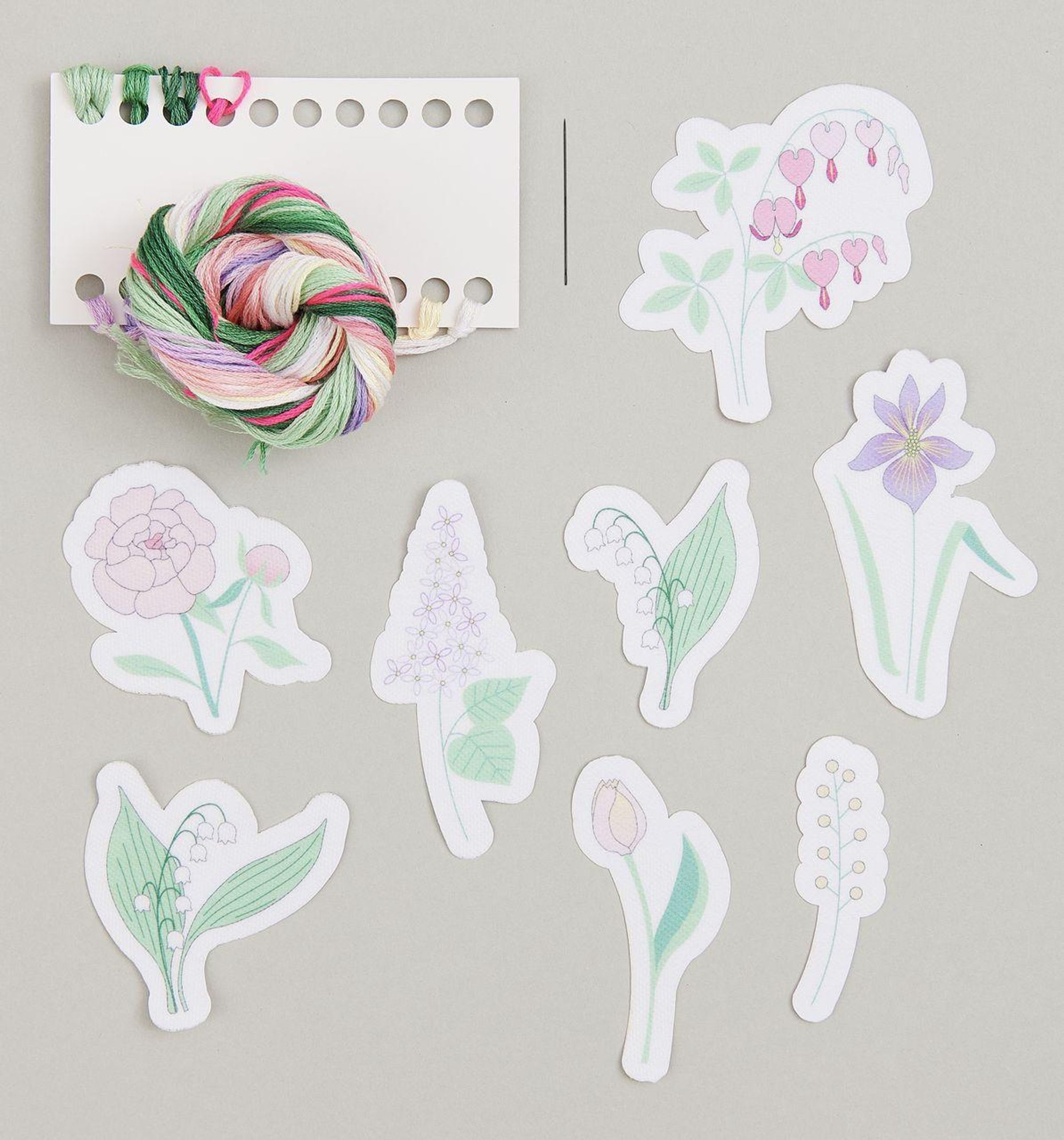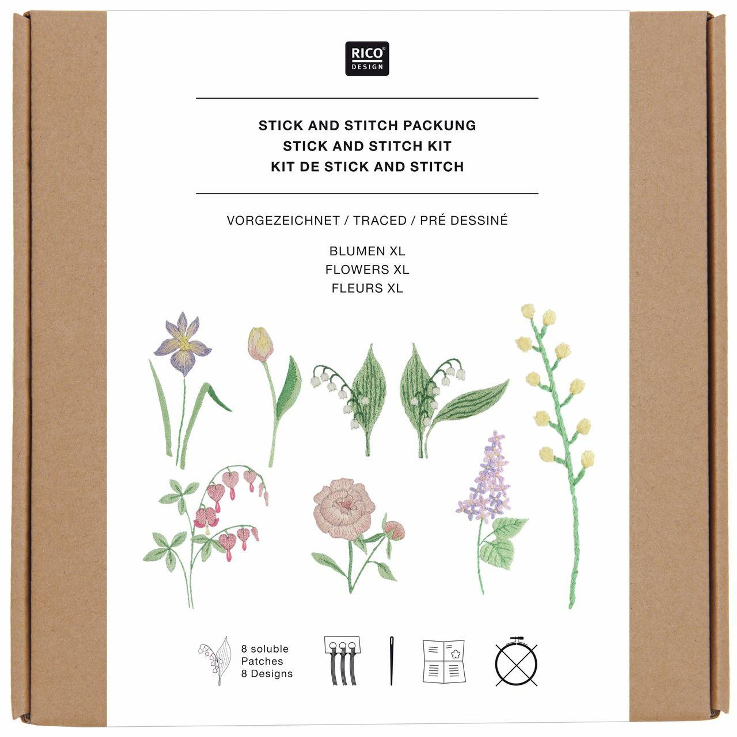 Stick & Stitch Packung, Blumen XL // 8 Stk., 8 Designs // Wasserlösliche Stickvorlage, Stickgarn, Sticknadel und Anleitung