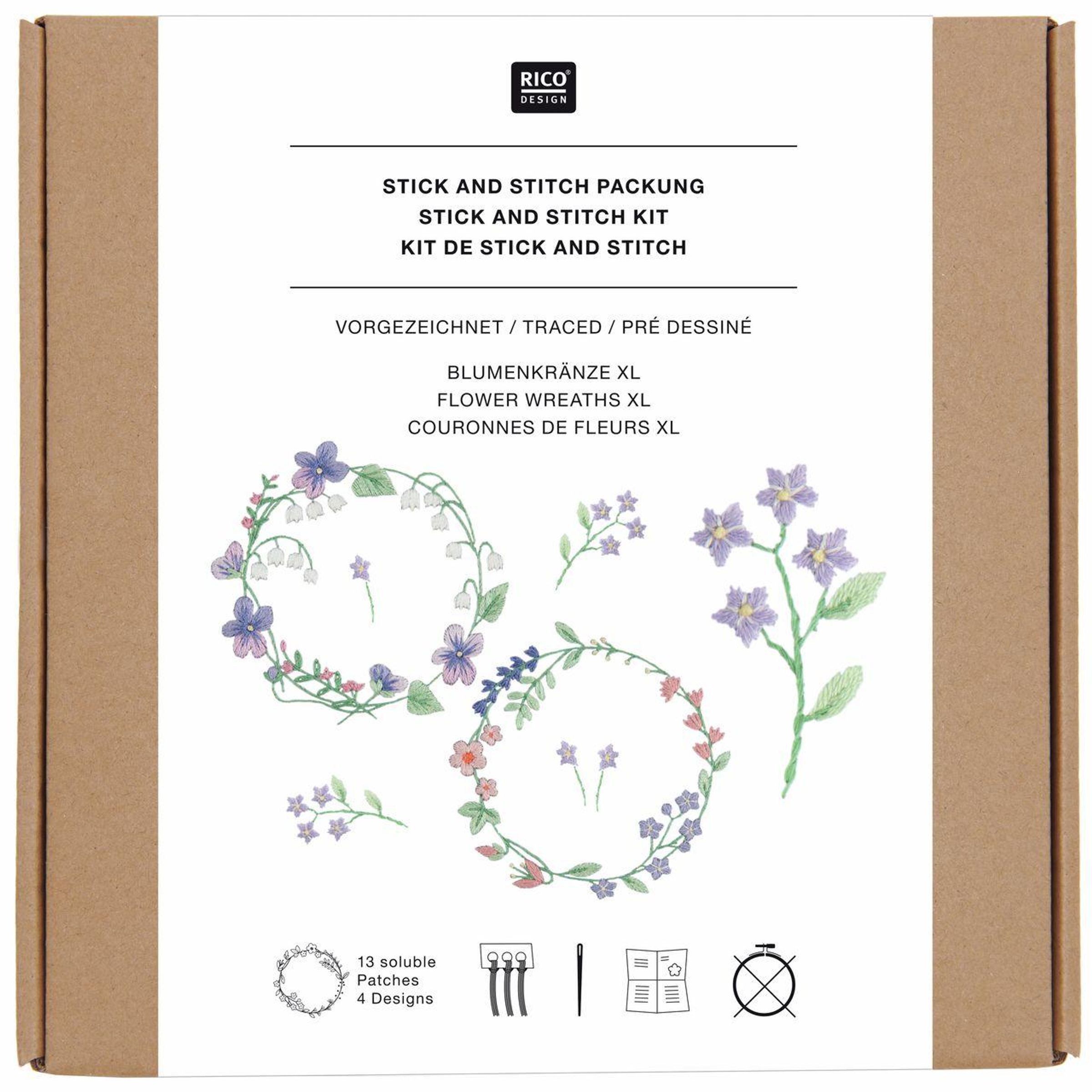 Stick & Stitch Packung, Blumenkränze XL // 13 Stk., 4 Designs // Wasserlösliche Stickvorlage, Stickgarn, Sticknadel und Anleitung