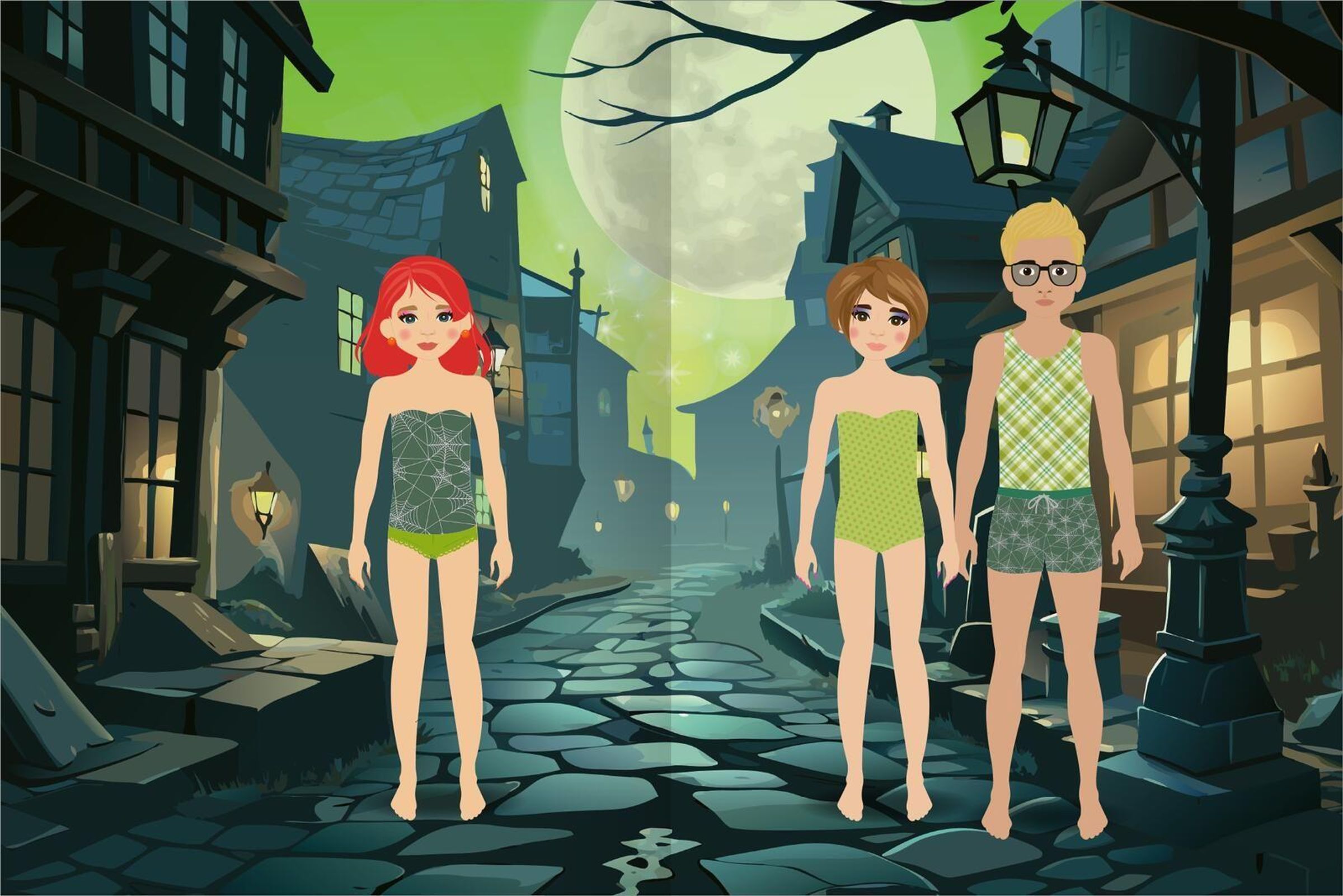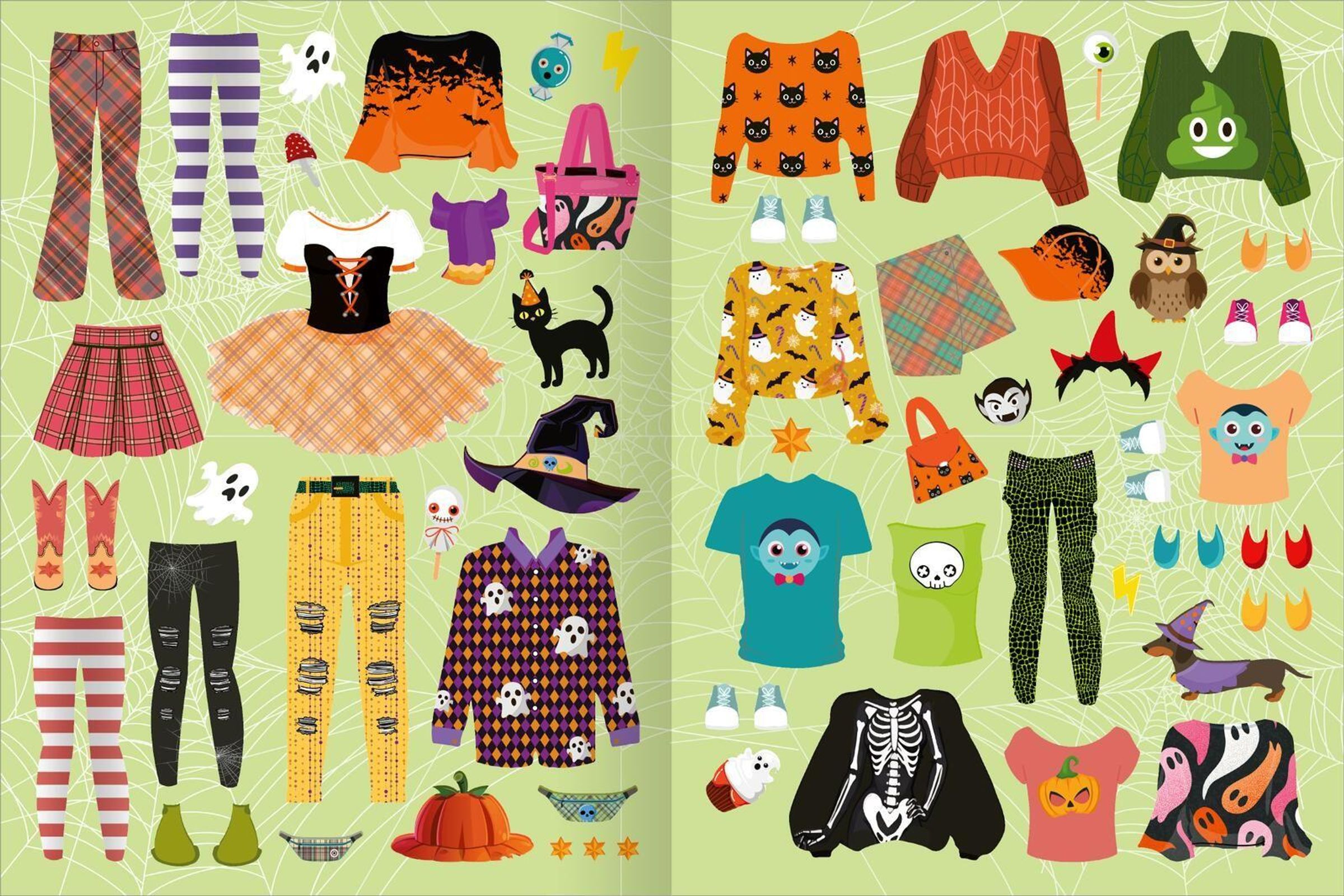 Entwirf traumhafte Styles und verwandle die Anziehpuppen in Halloweenparty-Gäste. Ob auf dem Dachboden oder im Gruselschloss: Mit vielen kunterbunten Kleiderstickern und Accessoires kannst du die Kinder in Szene setzen und ihnen zu einem funkelnden Auftritt verhelfen.