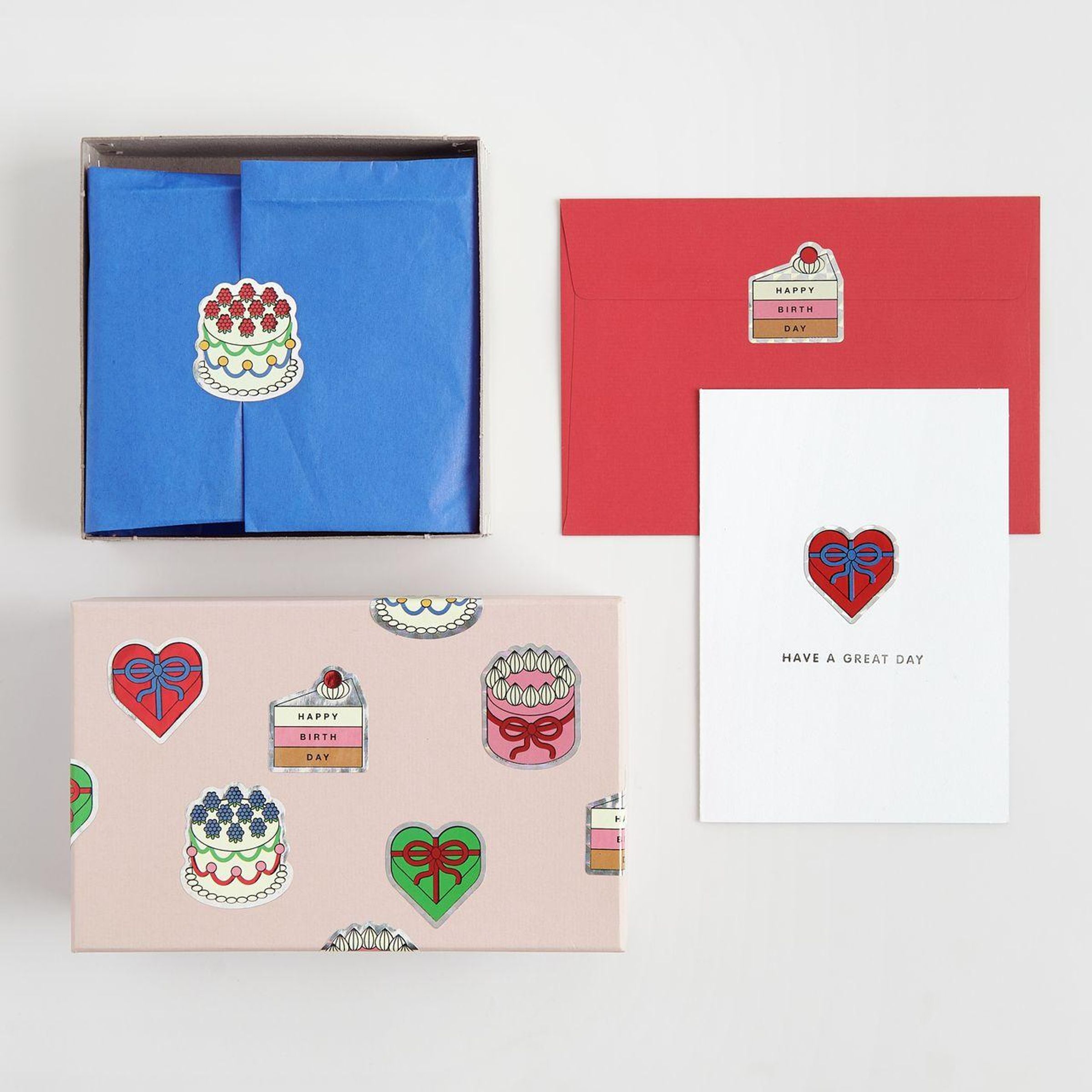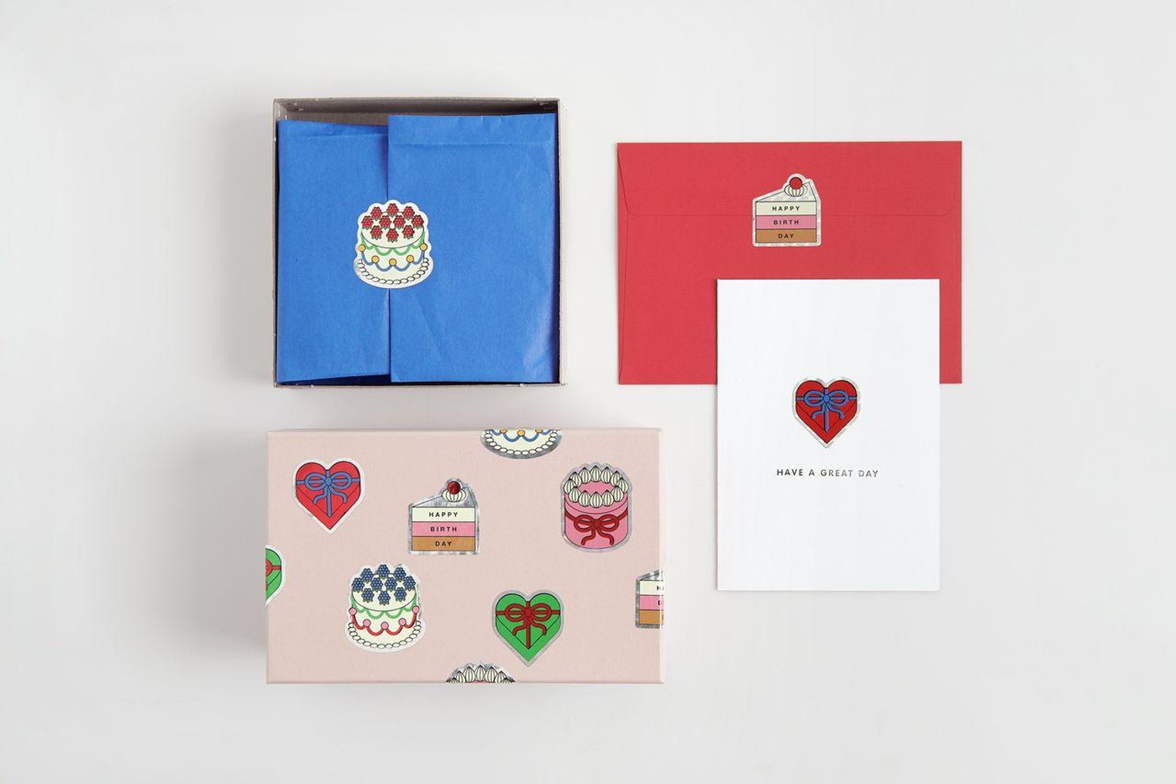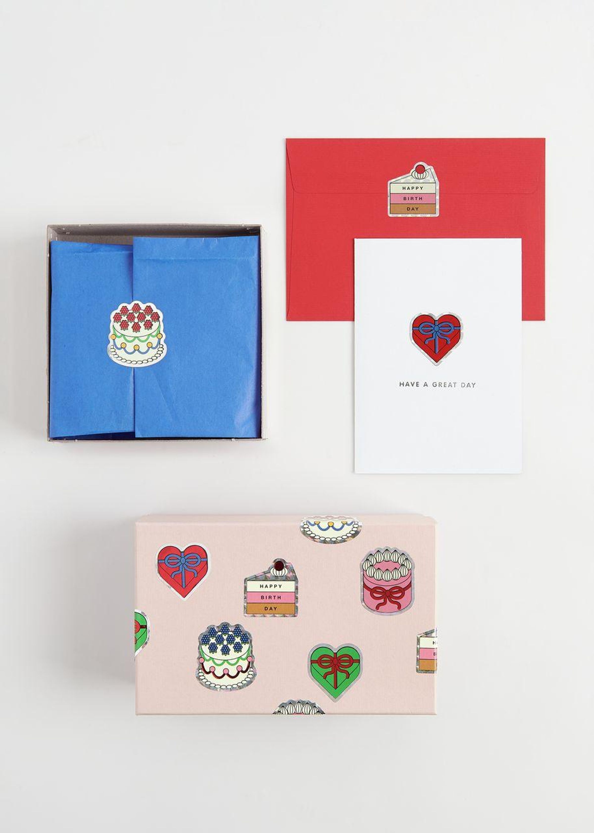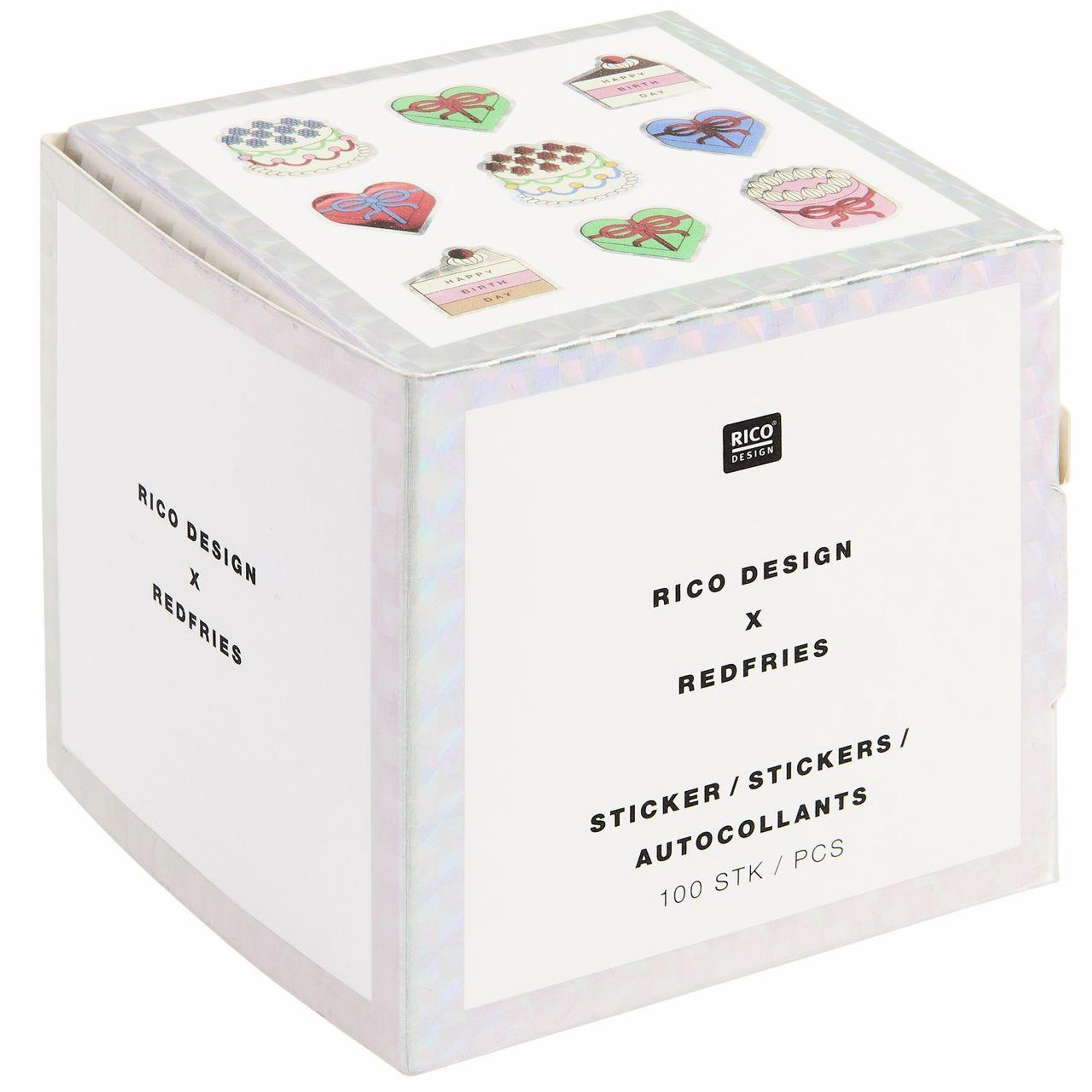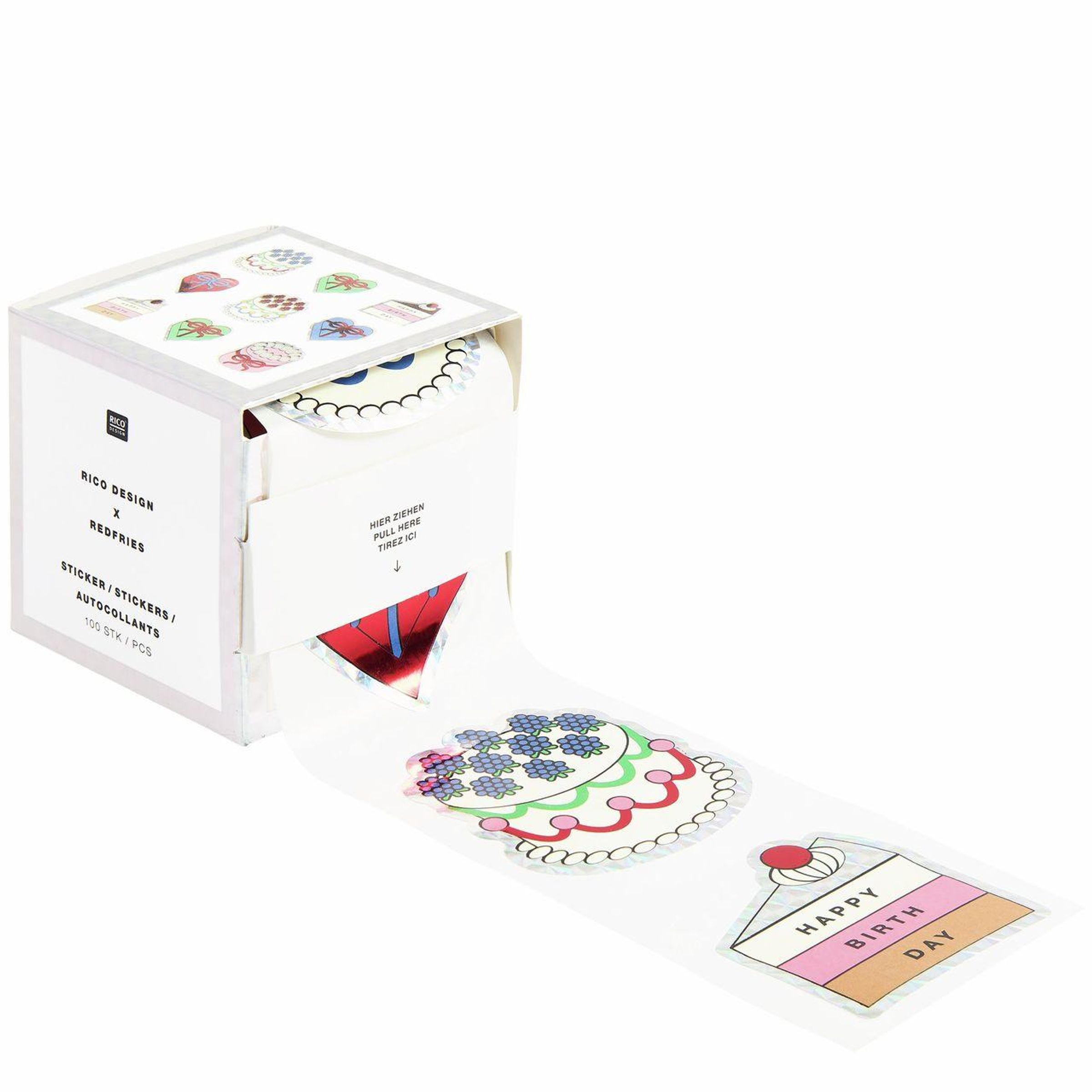 Verpackung mit der Aufschrift "HIER ZIEHEN" und "HAPPY BIRTHDAY", zeigt bunte Kuchen- und Geburtstagssticker., Diverse