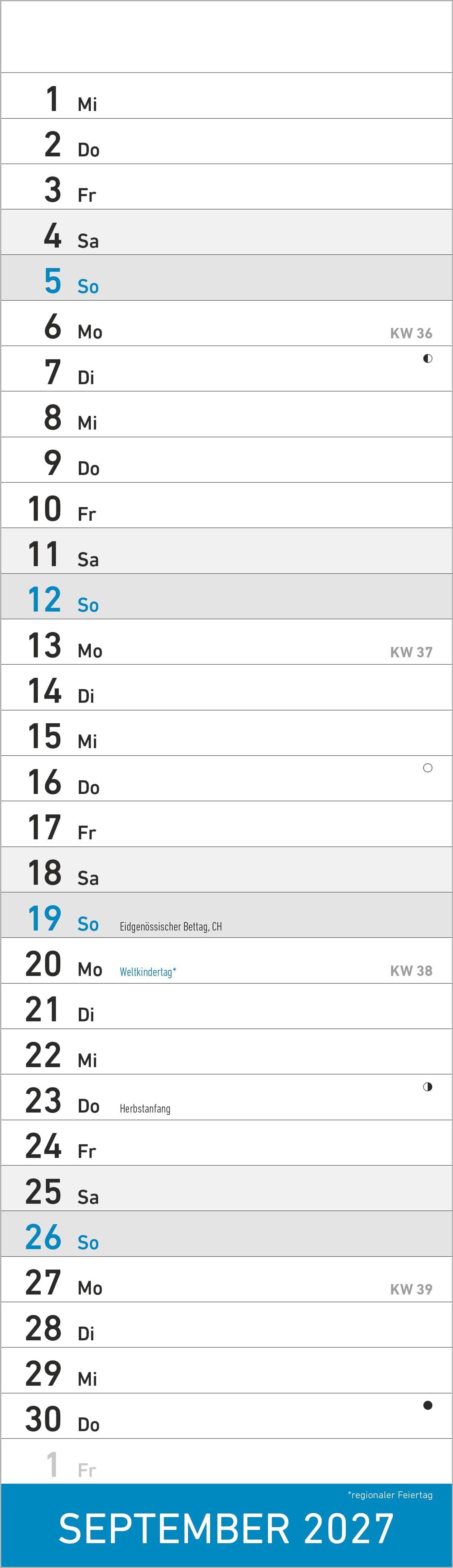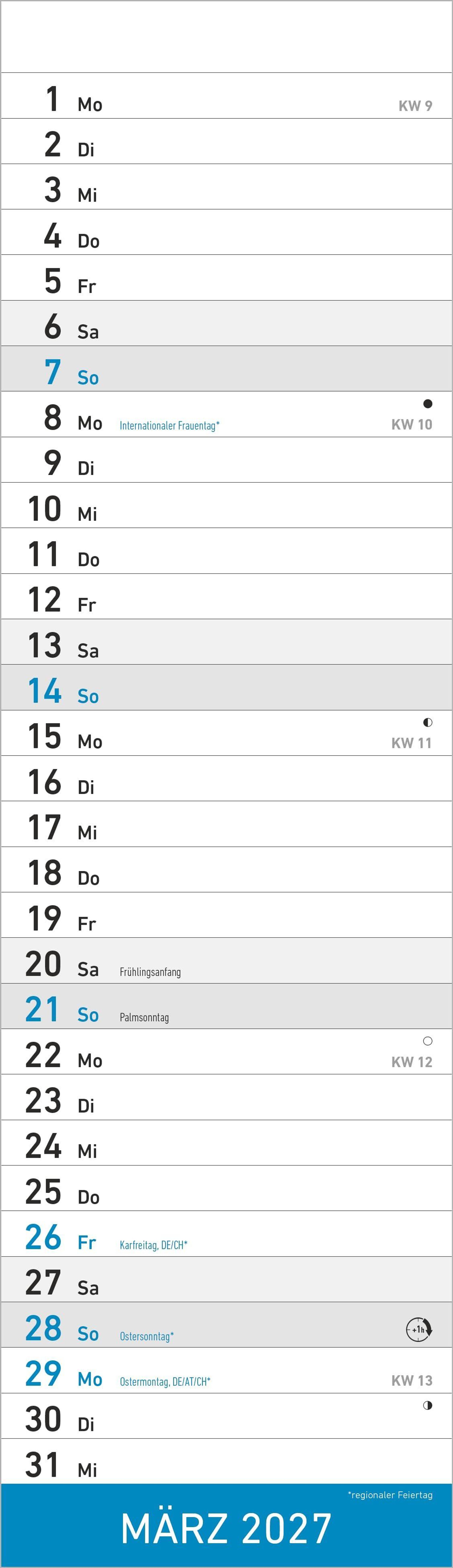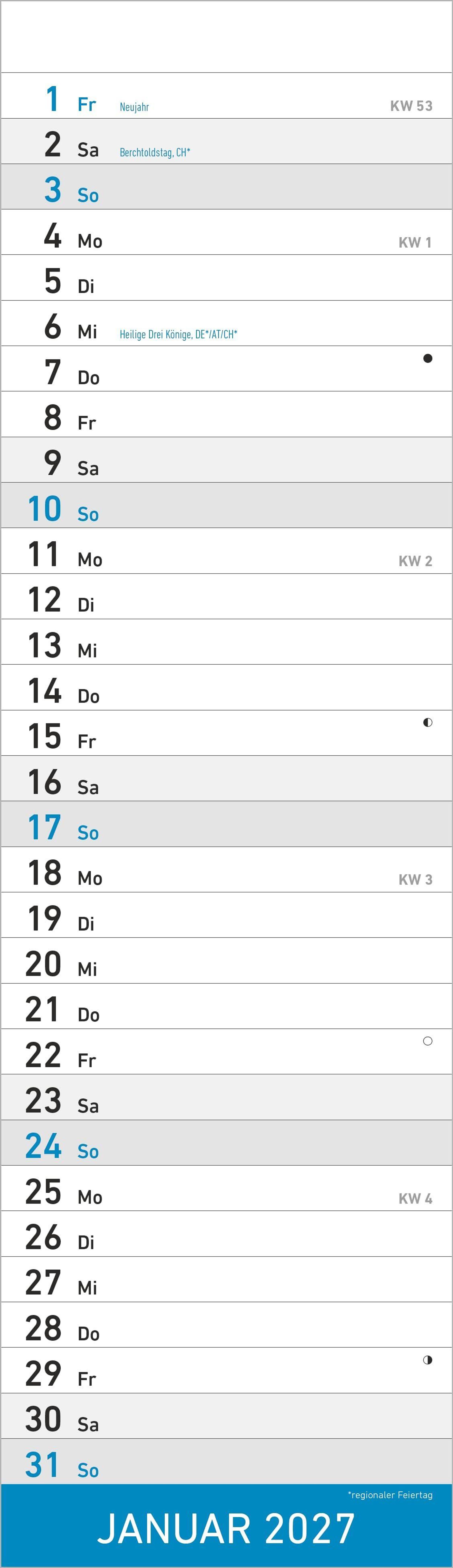 Der Alpha Edition Streifenplaner Mini Blau Kalender 2027 ist die perfekte Lösung für alle, die auch in kleinen Räumen nicht auf eine übersichtliche Terminplanung verzichten möchten. Mit seinem kompakten Format von 9, 5 x 33 cm passt er an nahezu jede Wand und bietet dennoch genügend Platz, um Termine, Geburtstage oder wichtige Notizen einzutragen.