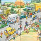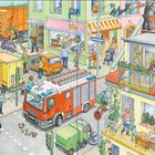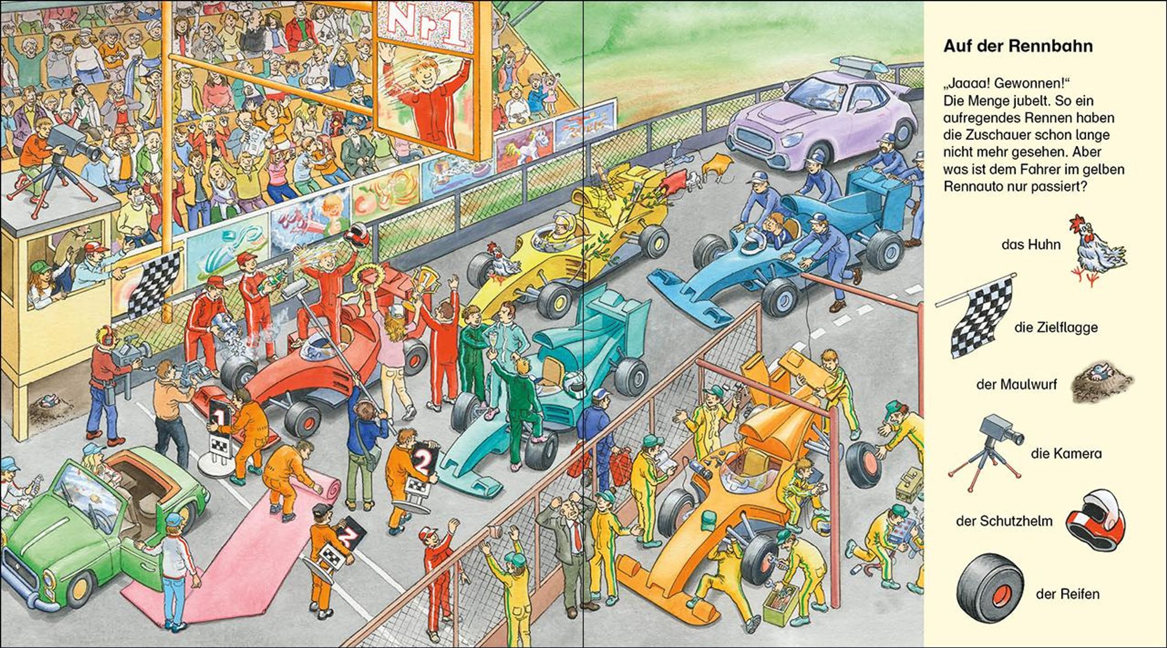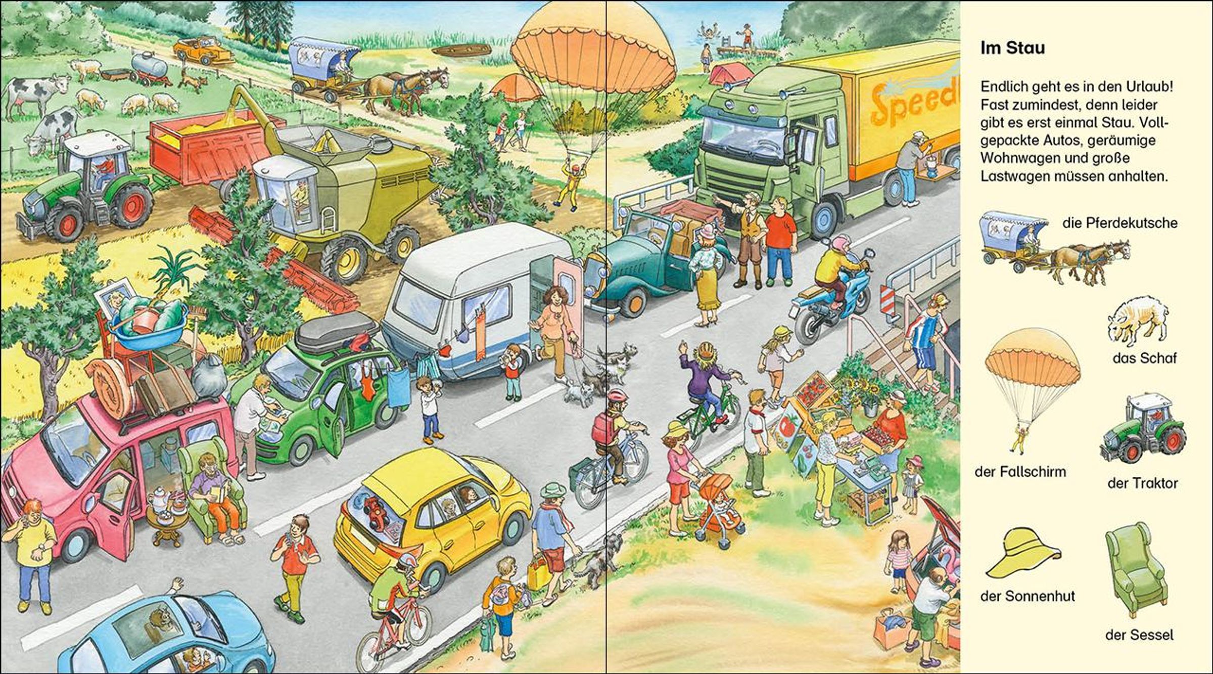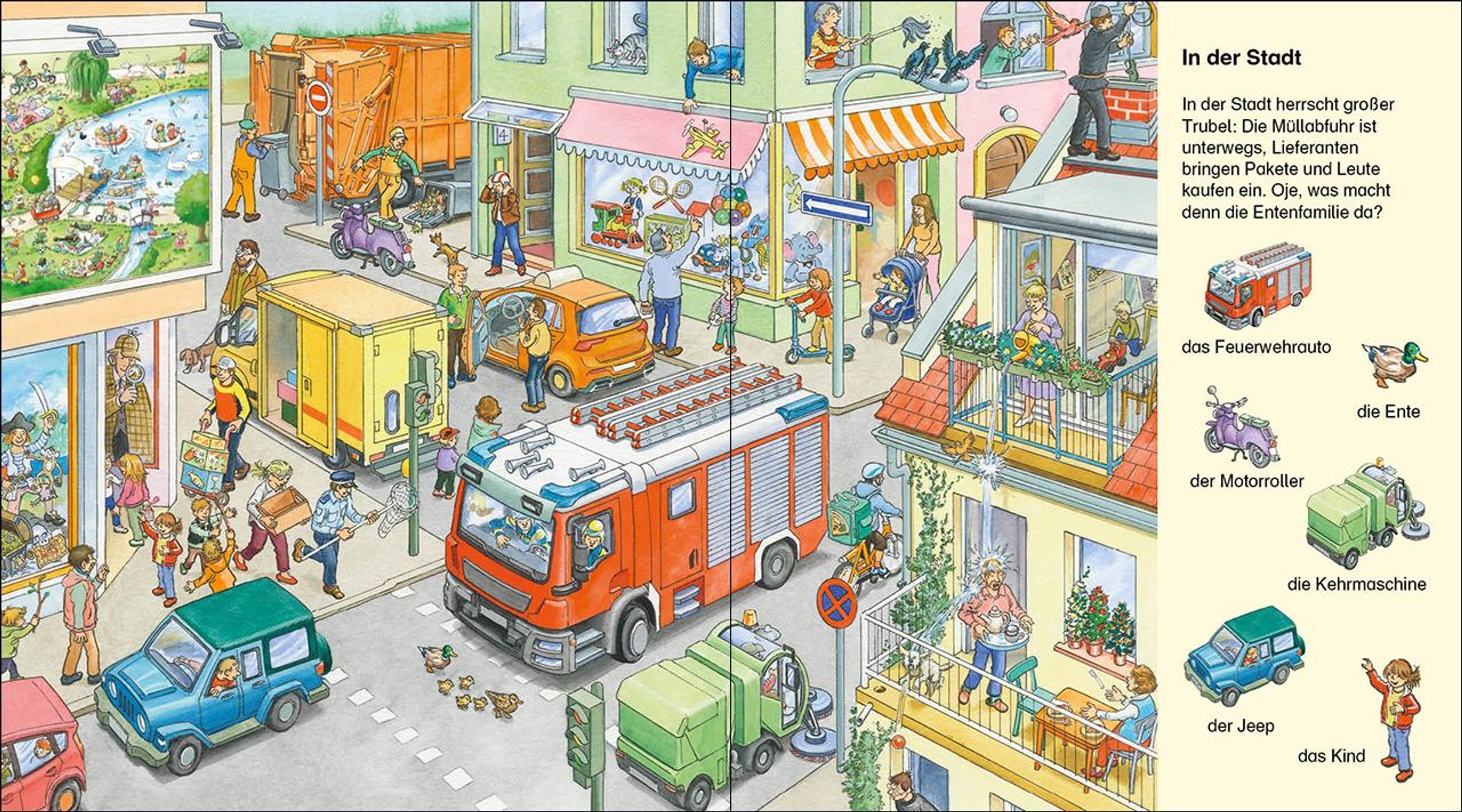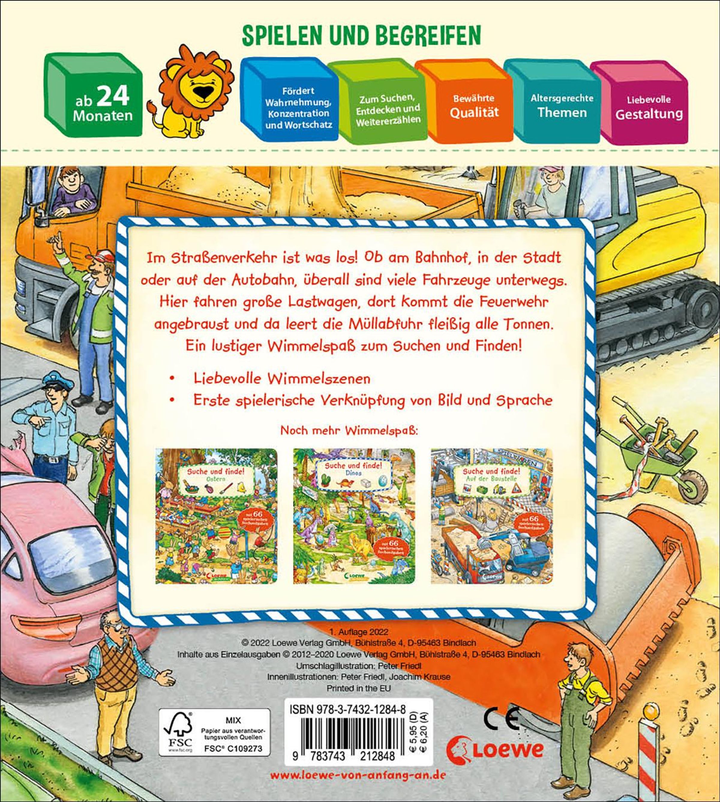 Im Straßenverkehr ist was los! Ob am Bahnhof, in der Stadt oder auf der Autobahn, überall sind viele Fahrzeuge unterwegs. Hier fahren große Lastwagen, dort kommt die Feuerwehr angebraust und da leert die Müllabfuhr fleißig alle Tonnen. Ein lustiger Wimmelspaß zum Suchen und Finden!