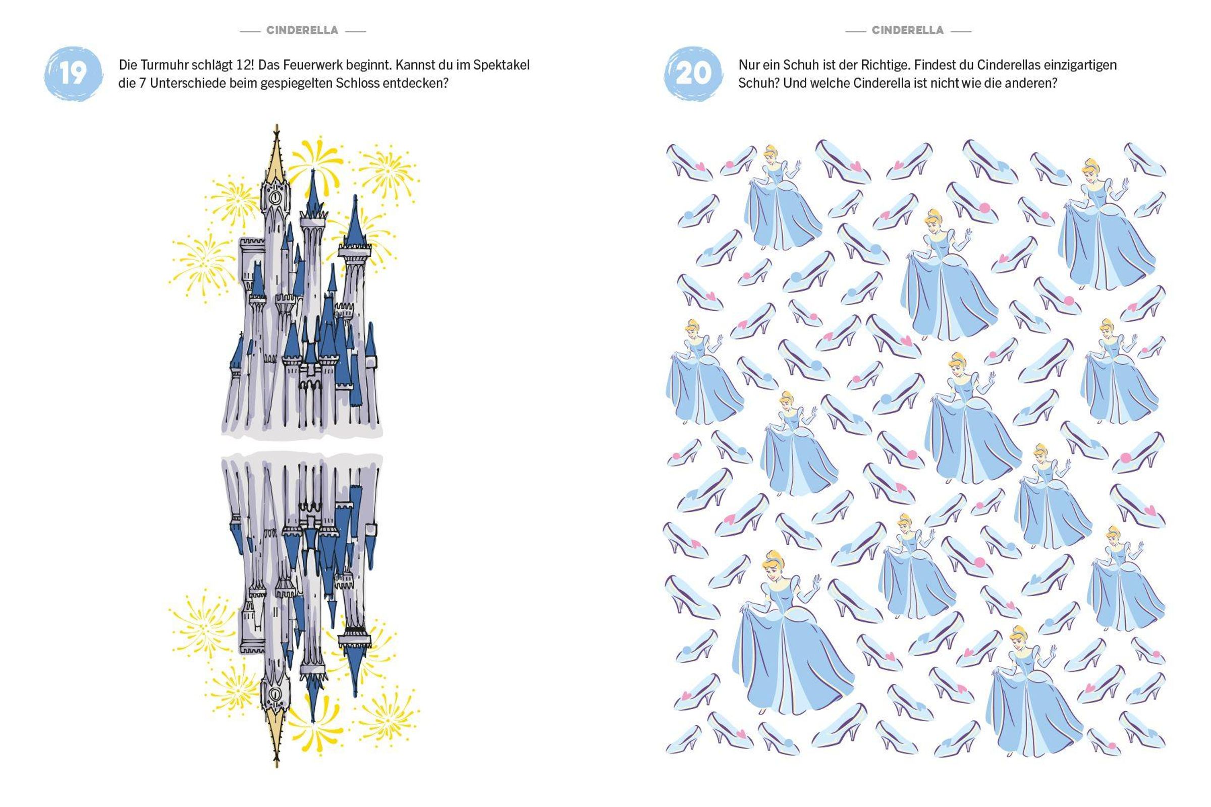 94-mal ist hier dein Adlerauge gefragt: Mache dich auf die Suche nach Alice' Lieblingstasse für eine Teezeit beim Hutmacher und finde die Spielkarten-Soldaten, die der Herzkönigin aus der Reihe tanzen. Entdeckst du Cinderellas verlorenen Schuh und die Unterschiede zwischen den Märchen-Schlössern? Und an welcher Stelle hat sich Winnie Puuh für ein Nickerchen versteckt? Schau ganz genau hin, dann findest du die versteckten Details.