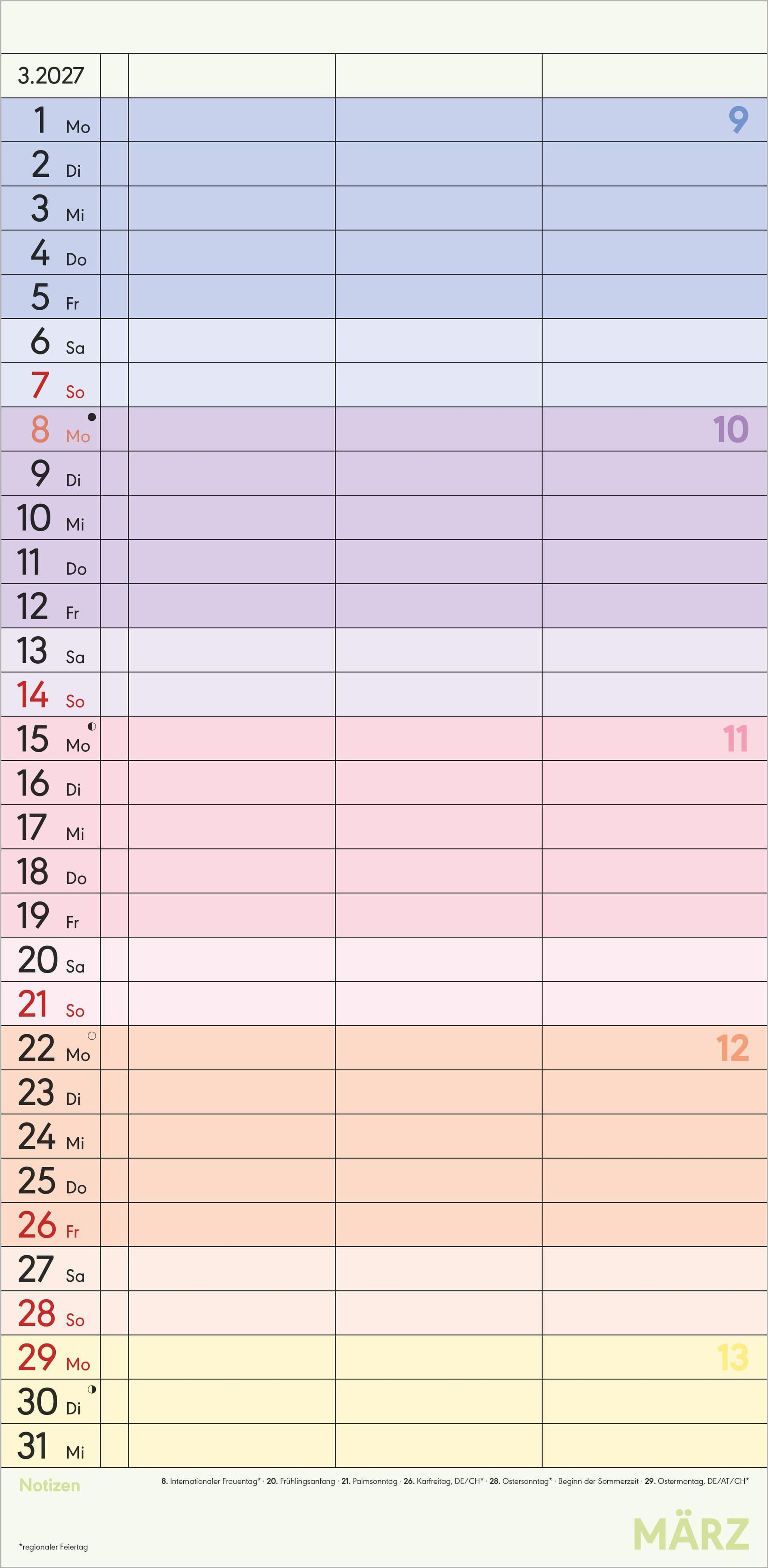 Deutschsprachiges Kalendarium: Mit Feiertagen für DE/AT/CH/FR/IT
