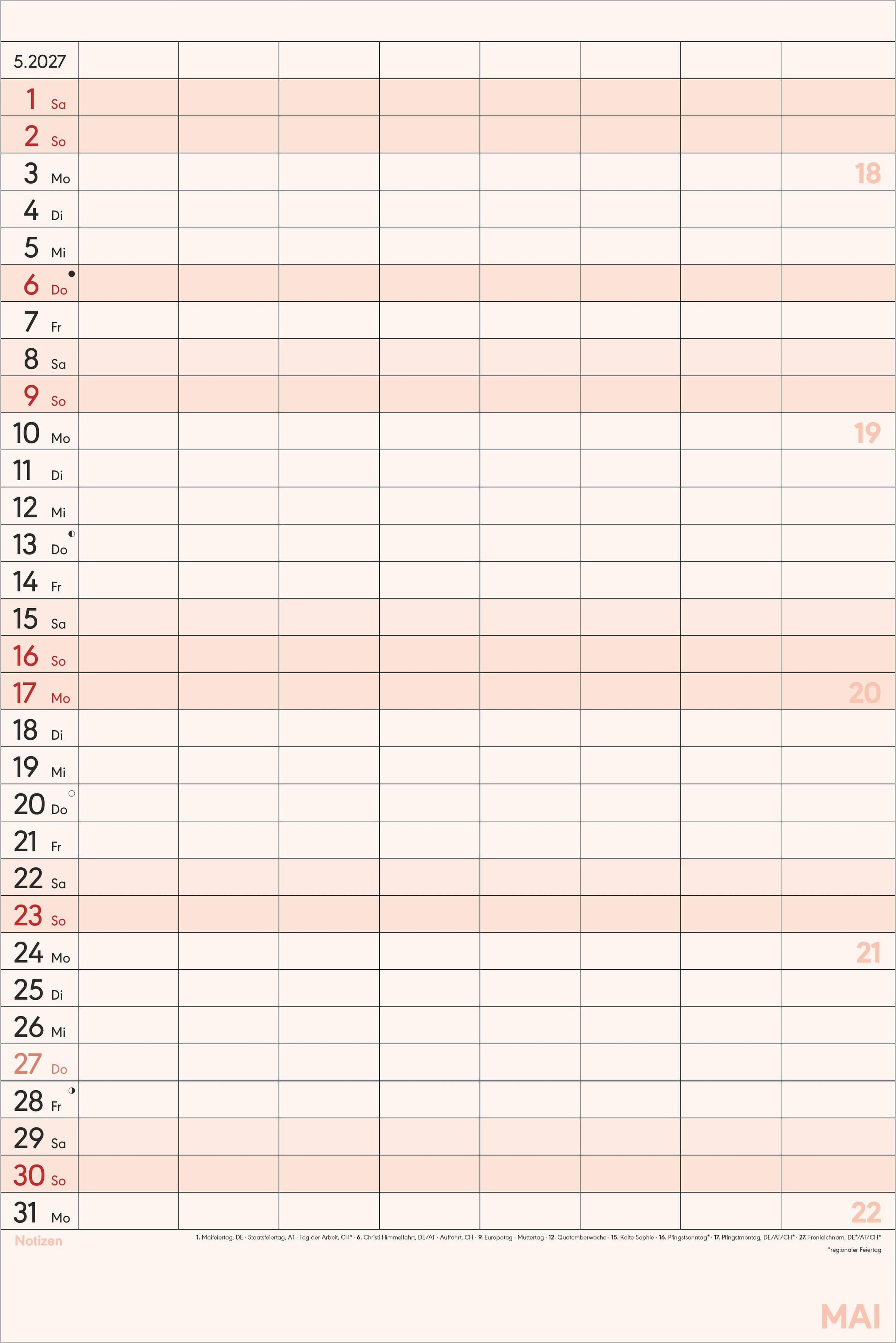 Komplettes Kalendarium: Deutschsprachig mit Feiertagen für DE/AT/CH/FR/IT und Ferienterminen