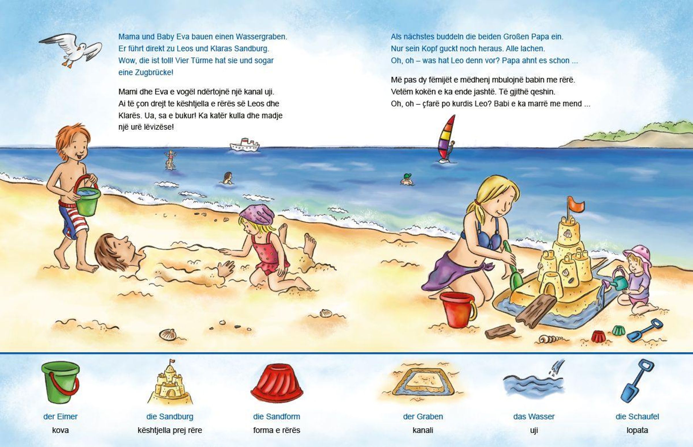 Leo und Klara sind mit ihren Eltern und ihrer kleiner Schwester Eva im Urlaub. Sie spielen am Strand, schwimmen im Meer und besuchen den Hafen. Sandburgbauen, Wassertiere-Suchen, Eis-Essen, unter Wellen tauchen und am Abend Sternegucken. Es gibt so viel zu tun, wenn man Urlaub am Strand macht! Farbenfrohe Illustrationen laden zum Betrachten ein und eine Wort-Bild-Leiste auf jeder Seite greift wichtige Gegenstände erneut auf und fördert gezielt das Suchen, Finden und Benennen. Das Buch ist in weiteren Sprachfassungen - immer in Kombination mit Deutsch - erhältlich.