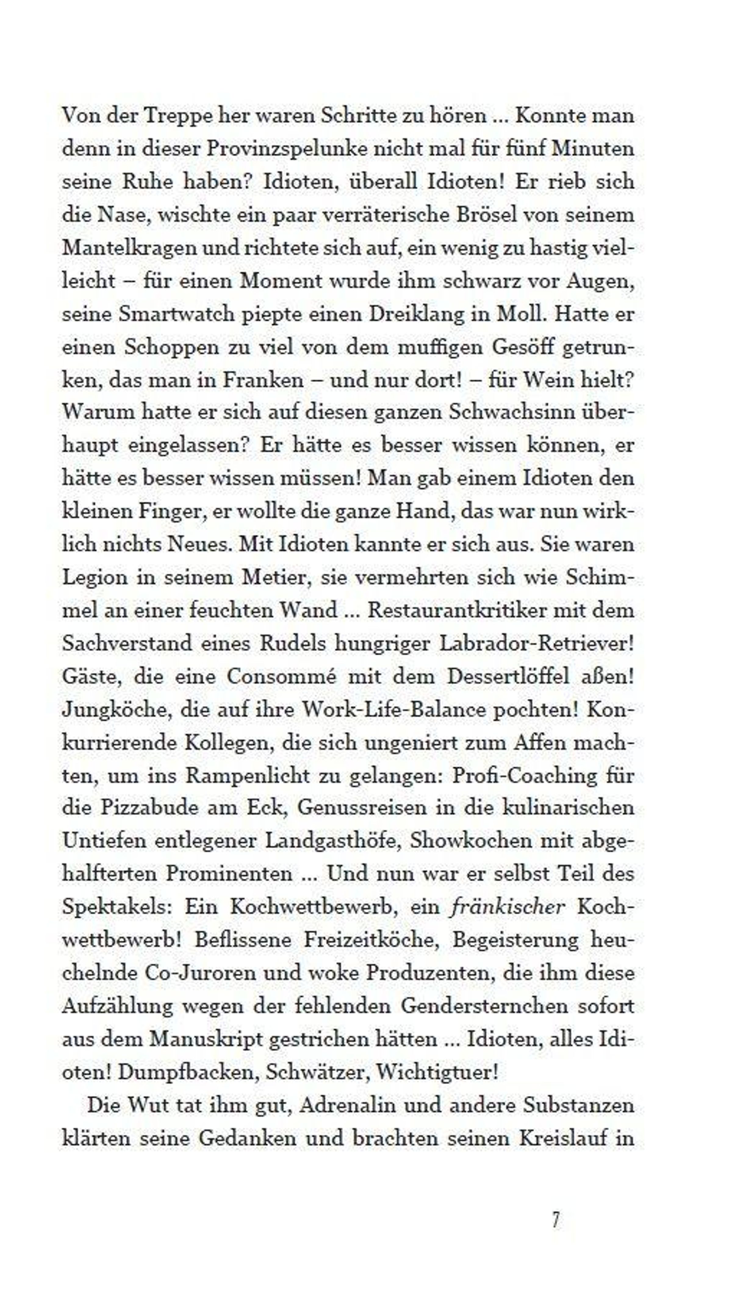 Kriminalhauptkommissar Kastners Kollege Wernreuther hat es in die Endausscheidung des Wettbewerbs >>FrankenKocht!<< geschafft, als sich sein Beikoch beim Snowboarden beide Handgelenke bricht. Kastner springt ein, obwohl sich seine Kochkünste auf Schinkennudeln und Tütensuppen beschränken. Schon am ersten Entscheidungstag des Finales, das in der edelstahlglänzenden Küche des Nobelrestaurants Muskatblüte unter regem Medieninteresse stattfindet, macht sich einer der Juroren mit harscher Kritik unbeliebt, und am nächsten Morgen stolpert Kastner im Kühlraum über dessen froststarre Leiche . Ein tragischer Unfall? Ein eiskalter Mord? Während Wernreuther unverdrossen am ultimativen Weihnachtsmenü feilt, ist Kastner endlich wieder ganz in seinem Element ...