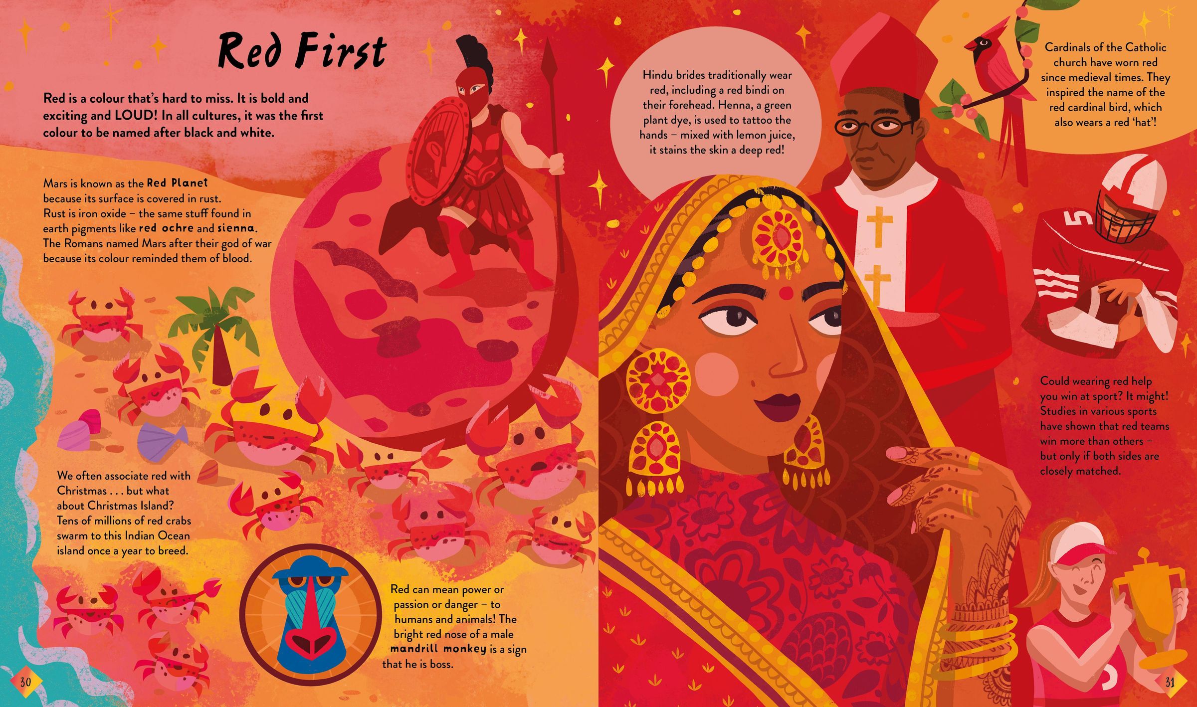 In The Stories and Secrets of Colour , young readers can explore the many meanings behind and uses for colour all over the world, from the Tuareg people of North Africa and their striking blue clothes, to why saffron is so expensive and what makes flamingos pink. Through colour, we discover amazing facts about animals and plants, learn how colours have changed the course of history and find out how different colours affect our moods and health.