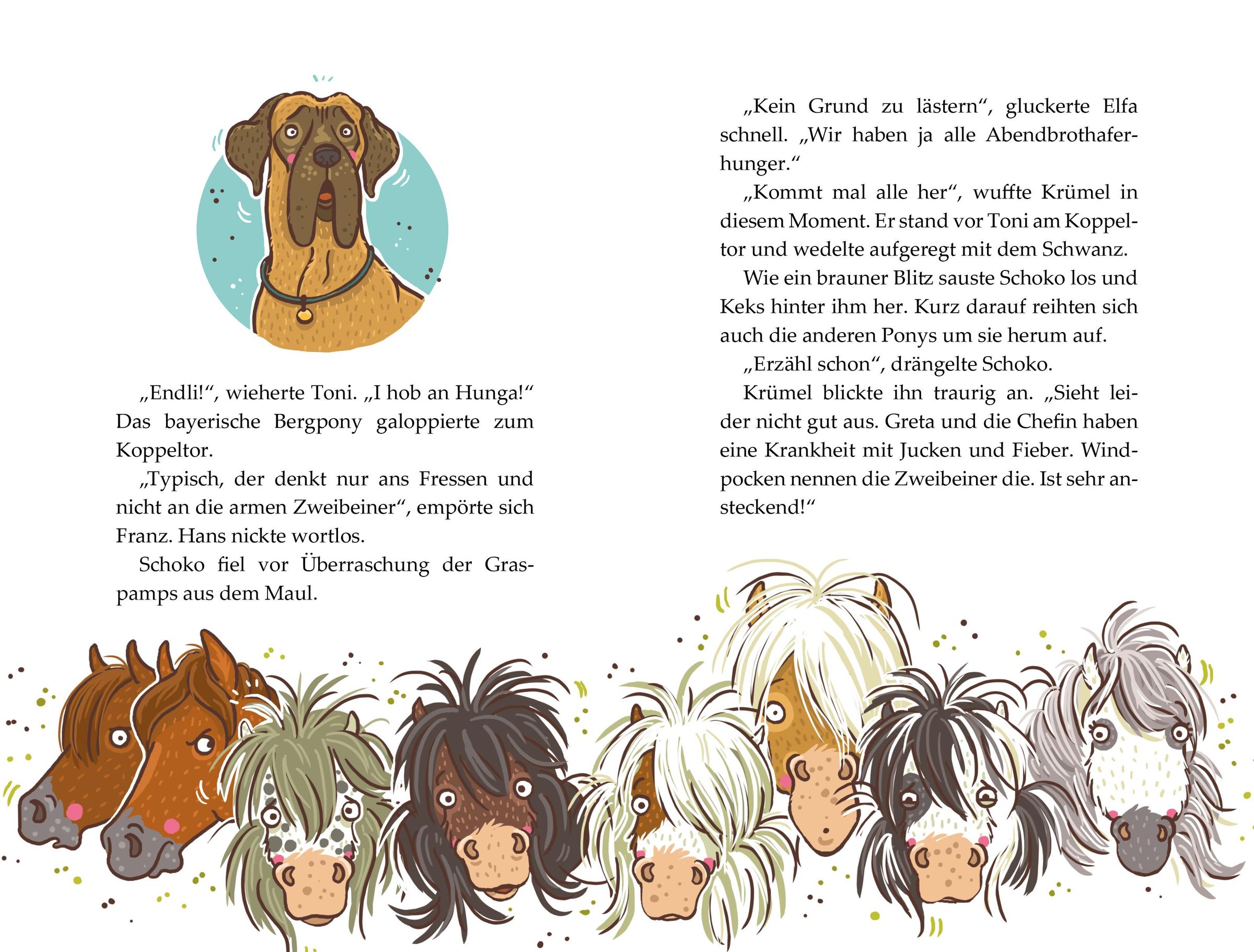 Juchu! Für Schoko und seine Freunde steht ein Kurzurlaub in ihrer alten Heimat Dammbüll an. Doch gleich nach der Ankunft geht alles schief: Die Zweibeiner erkranken an Windpocken und nun sollen die Ponys die Zeit allein auf einer einsamen Insel verbringen. Dabei soll dort ein merkwürdiges Meeresungeheuer hausen. Und was hat es mit dem Müll am Strand auf sich, sind da etwa skrupellose Umweltverbrecher am Werk?