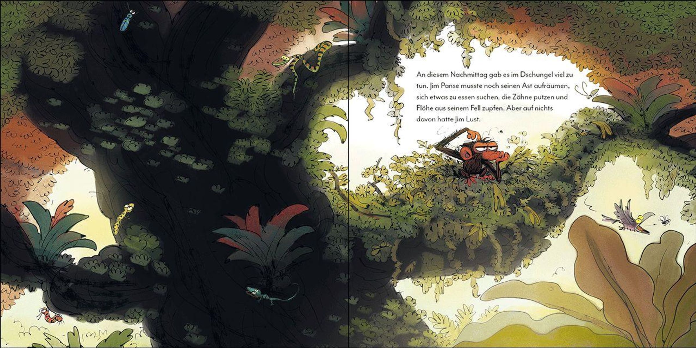 "Ich will immer nur Spaß haben!", ruft er und singt mit den Vögeln, tobt mit den Affen und wälzt sich mit den Zebras über die Wiesen. Bis Jim doch langsam Hunger bekommt. Und plötzlich ziemlich müde wird. Ist es etwa doch nicht so schön, den ganzen Tag lang zu spielen?