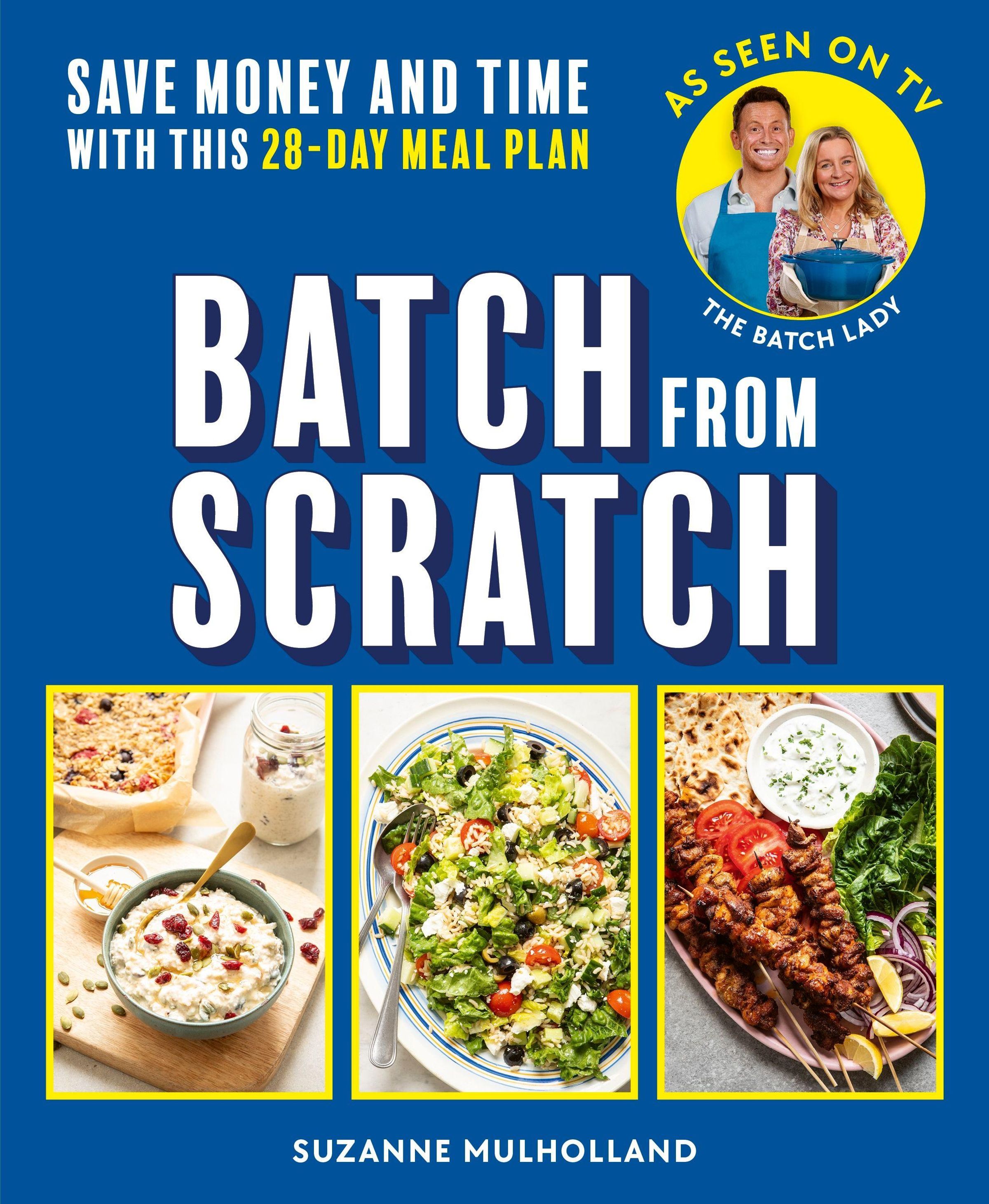 Text: "Save money and time with this 28-day meal plan. Batch from Scratch. As seen on TV. The Batch Lady. Suzanne Mulholland." Oben ist ein rundes Logo mit zwei lachenden Personen und darunter drei Essensfotos: Müsli, Salat und Kebabs., Buch