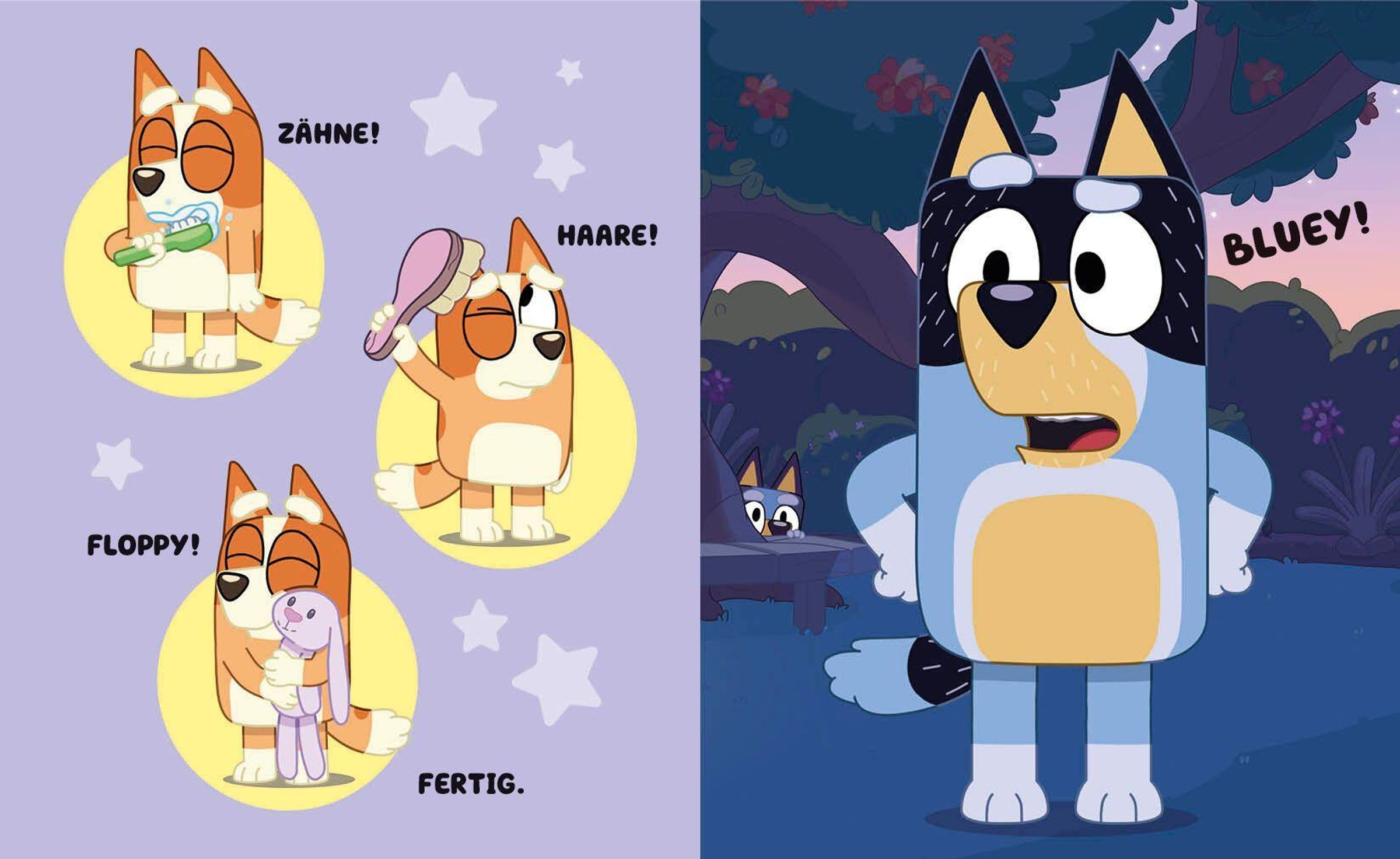 Bingo putzt sich brav die Zähne, klemmt Floppy unter den Arm und tapst folgsam ins Bett. Während Mum Bingo eine Gutenachtgeschichte vorliest, hat Dad eine schwierigere Aufgabe: Bluey will nicht ins Bett! Sie rennt in den dunklen Garten und versteckt sich. Nachdem Dad Bluey gefunden hat, muss er sie ins Haus schleppen. Fürs Zähneputzen braucht sie eine spezielle Zahnpasta. Auf der Toilette dauert alles ewig. Und als sie endlich im Bett liegt, muss Dad ihr ein Glas Wasser und Polly Wuffi holen. Doch für Bluey ist Dad nichts zu viel. Als sie sich vor dem Einschlafen fürchtet, legt er sich neben sie, um sie zu beschützen. An Dad gekuschelt, kann Bluey endlich zur Ruhe kommen und einschlafen.