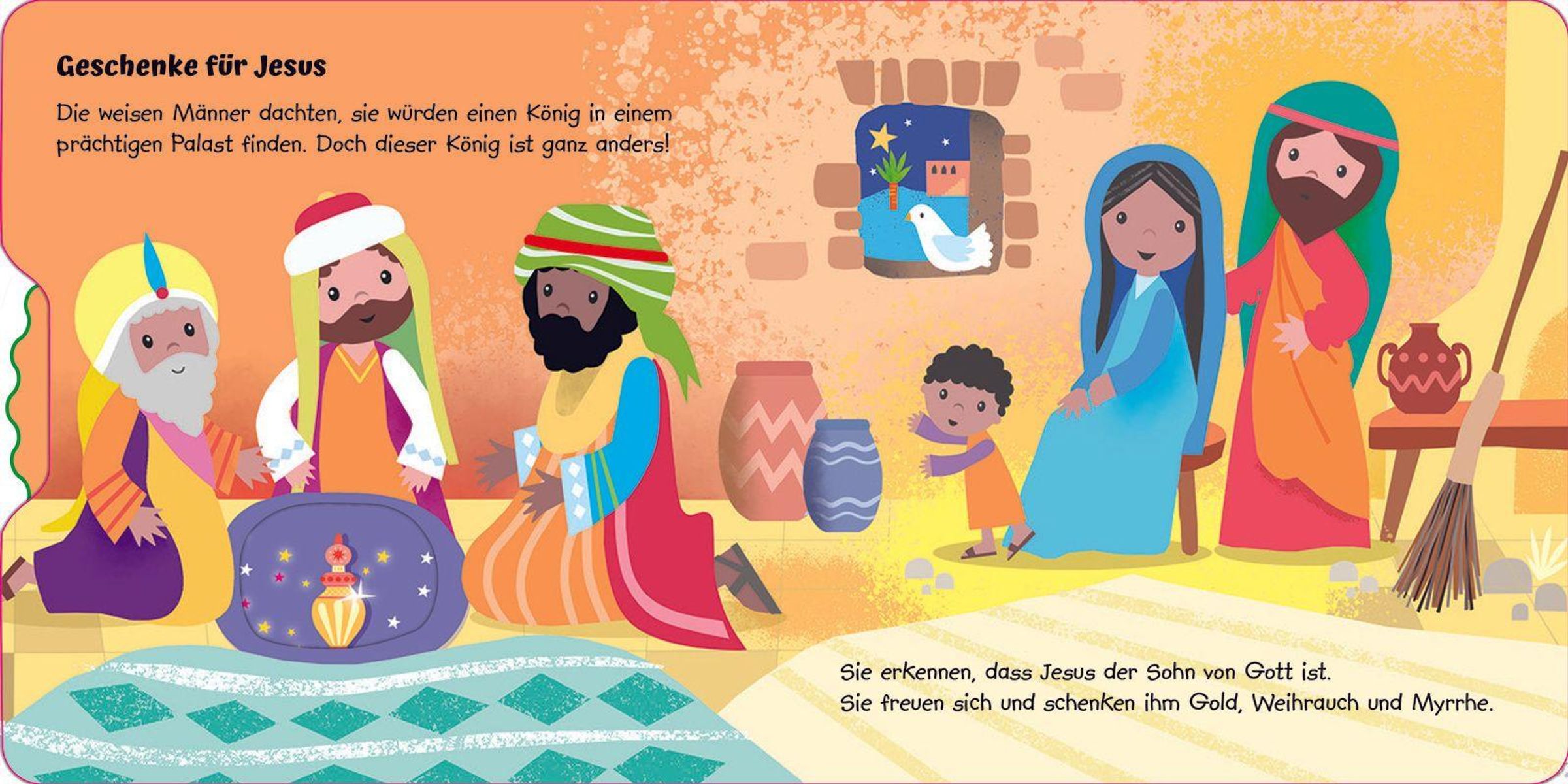 Die Weihnachtsgeschichte zum Spielen und Entdecken! Mit Klappen zum Öffnen, Schiebern zum Bewegen und Rädern zum Drehen können kleine Hände aktiv dabei sein und spielerisch erfahren, wie Jesus in Bethlehem geboren wurde. Mit kurzen Texten, farbenfrohen Illustrationen und stabilen Seiten perfekt geeignet, um mit den Kleinsten die Weihnachtsgeschichte zu erleben.