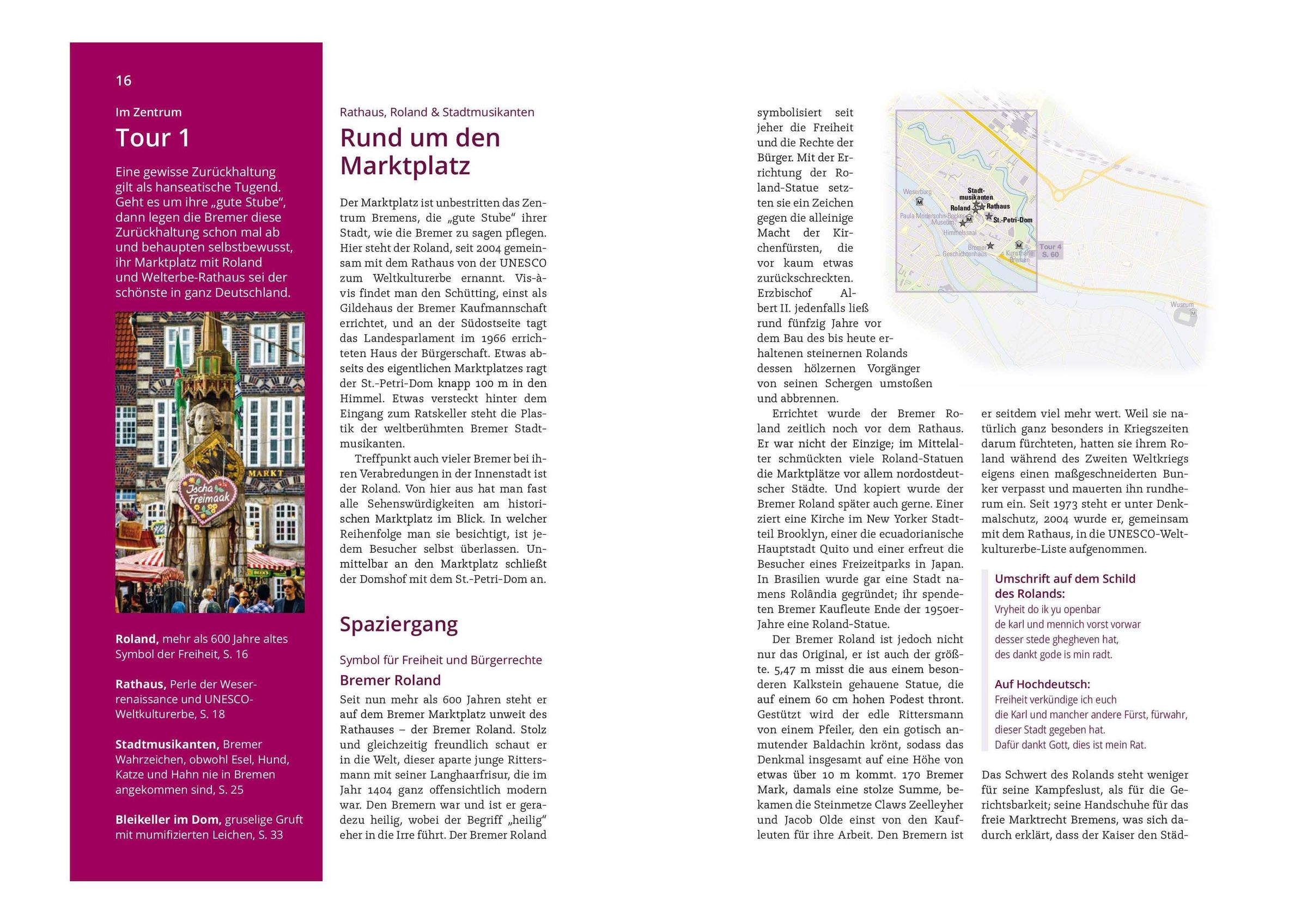 Erkunden Sie Bremens 'Gute Stube' rund um den Marktplatz im historischen Zentrum. Es grüßt der Bremer Roland, der wie das Rathaus zum UNESCO-Welterbe erhoben wurde. Weiter geht es zum Dom und den Bremer Stadtmusikanten. Eine Straße als expressionistisches Gesamtkunstwerk: die Böttcherstraße wurde Anfang des 20. Jahrhunderts komplett neugestaltet. Die Bremer Schlachte ist maritime Flanier- und Gastromeile. Dank der kompakten Restaurantliste in unserem 'Bremen'-Reiseführer finden Sie die leckersten Spezialitäten!