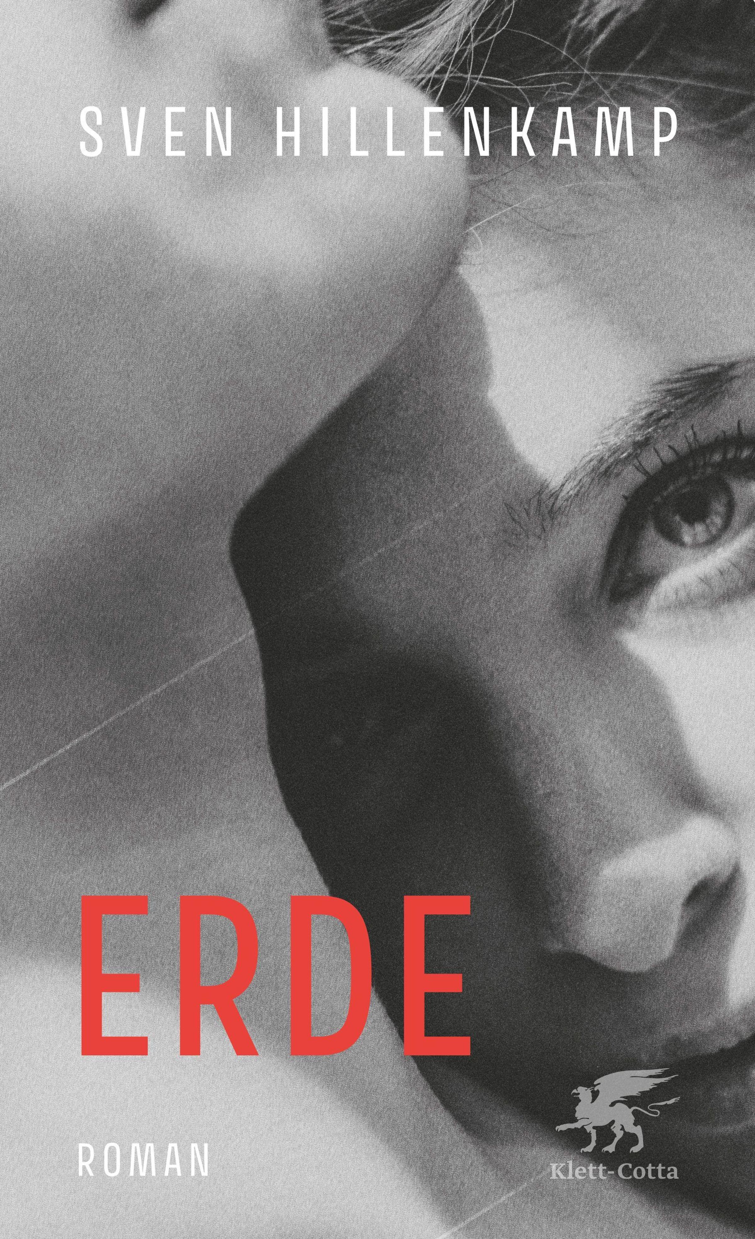 "Sven Hillenkamp, ERDE, Roman. Ein Schwarzweißfoto eines nachdenklichen Gesichts und ein Klett-Cotta-Logo unten.", Buch