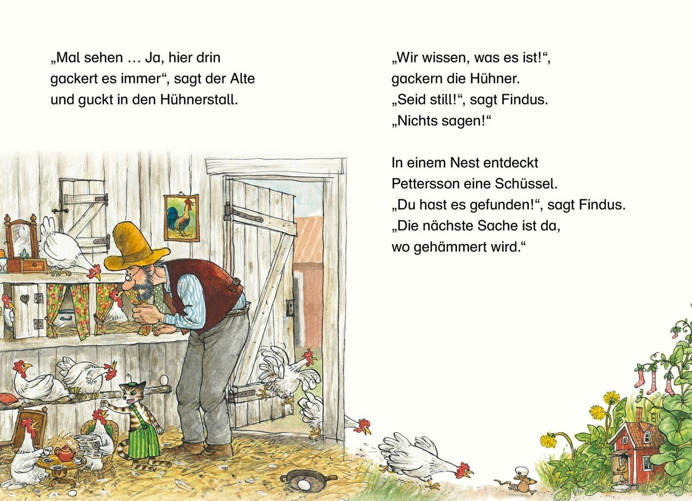Findus hat ein tolles Spiel erfunden: Er hat fünf Dinge versteckt, und der alte Pettersson soll sie suchen. Das erste Versteck ist in einem Haus, in dem es gackert, das zweite dort, wo gehämmert wird - und so geht es weiter, bis Pettersson eine Schüssel, drei Eier, Mehl, Milch und eine Pfanne gefunden hat. Was er darin wohl für Findus backen soll?