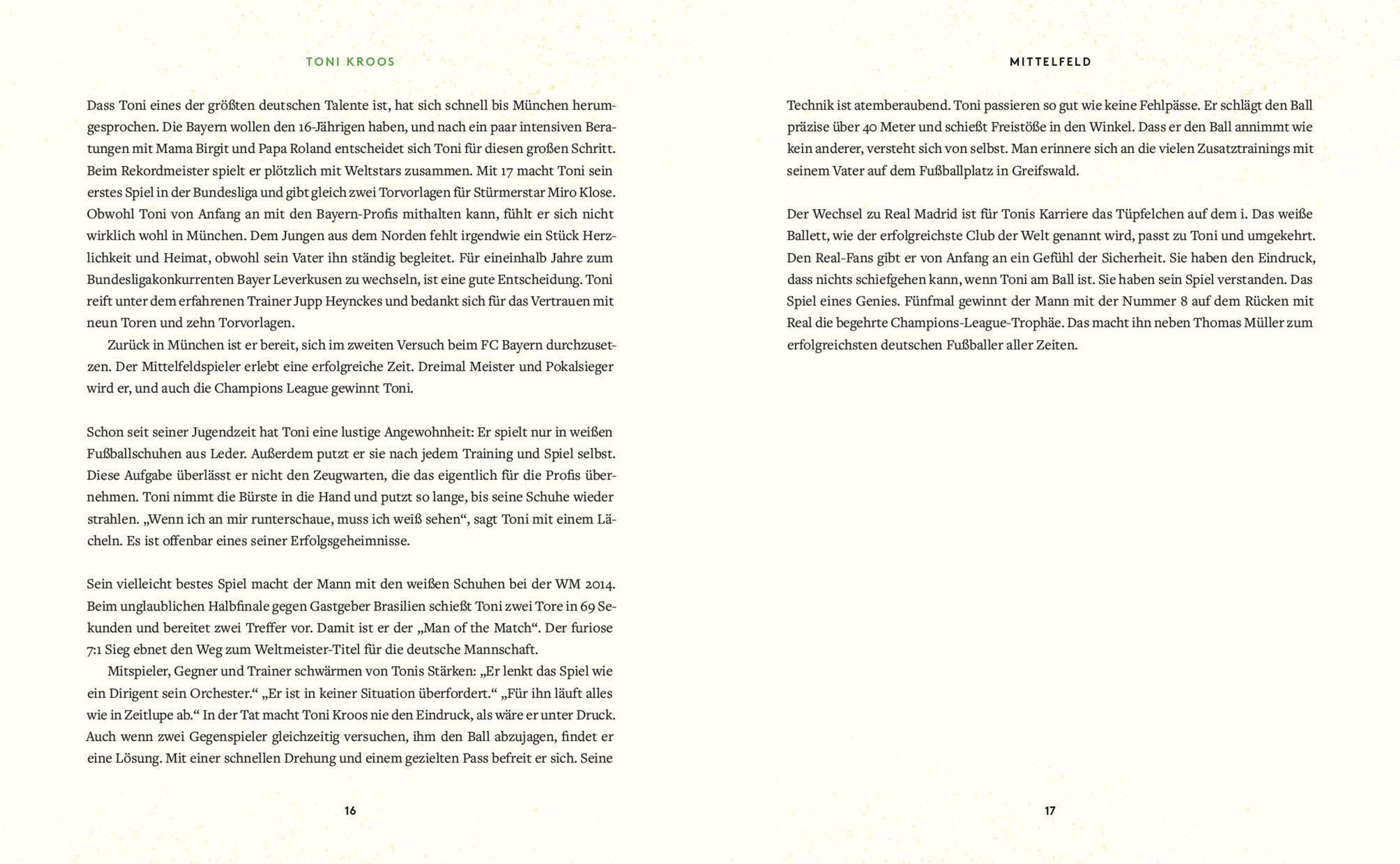 Sven Voss bringt Groß und Klein bereichernde Lebensgeschichten von Fußballer*innen mit besonderen Biografien nahe. Von Weltfußballer Lionel Messi und Superstar Cristiano Ronaldo über Ausnahmeerscheinung Marta undSchiedsrichterin Bibiana Steinhaus bis hin zur Fußballlegende Pelé und Trainer Jürgen Klopp sind alle dabei! In dieser Neuausgabe reihen sich auch fünf neue Persönlichkeiten ein**,** daruntereiner der beiden erfolgreichsten deutschen Fußballer , Tonis Kroos, und Trainer-Genie Xabi Alonso . Die Sportgeschichten dieser inspirierenden Persönlichkeiten sind nicht nur tolle Vorlesegeschichten, die Biografien ermutigendie kleinen Leser auch dazu, den Lieblingshelden nachzueifern. Sie führen ihnen außerdem vor Augen, dass Beharrlichkeit, Mut und Selbstbewusstsein oft ans Ziel führen.