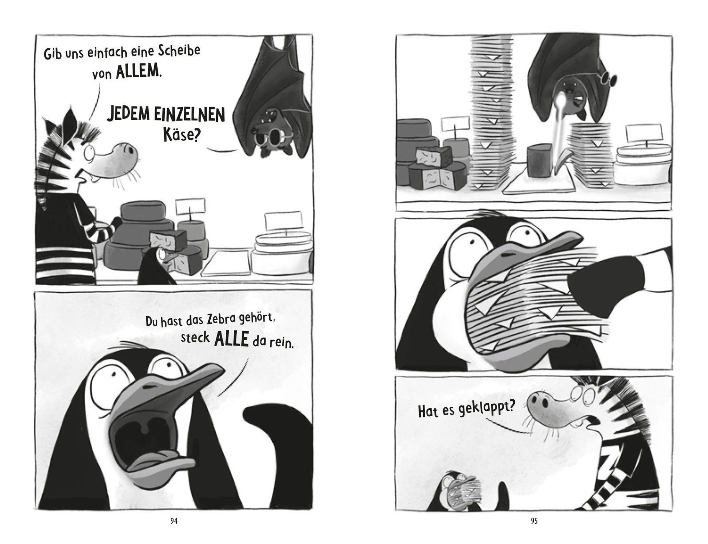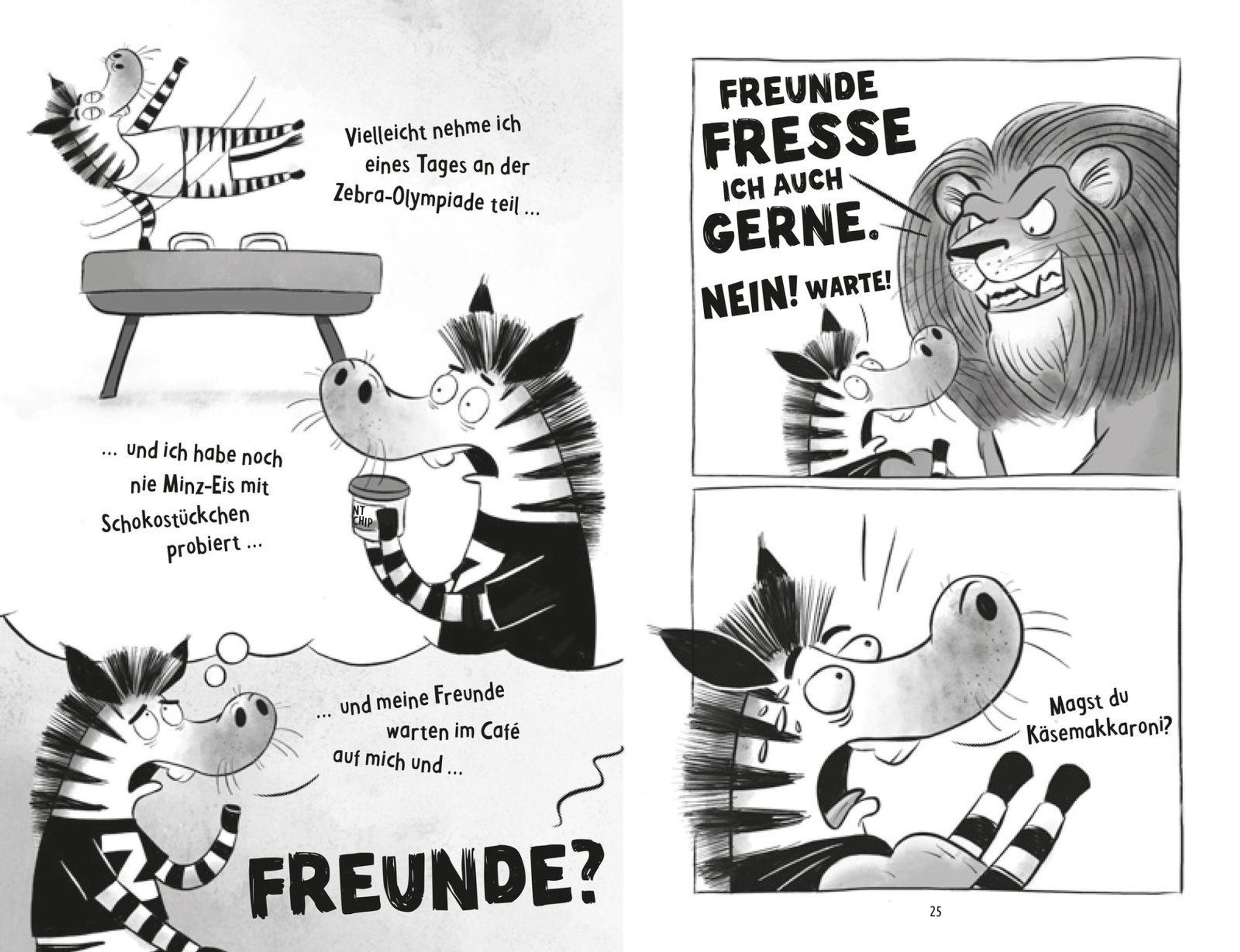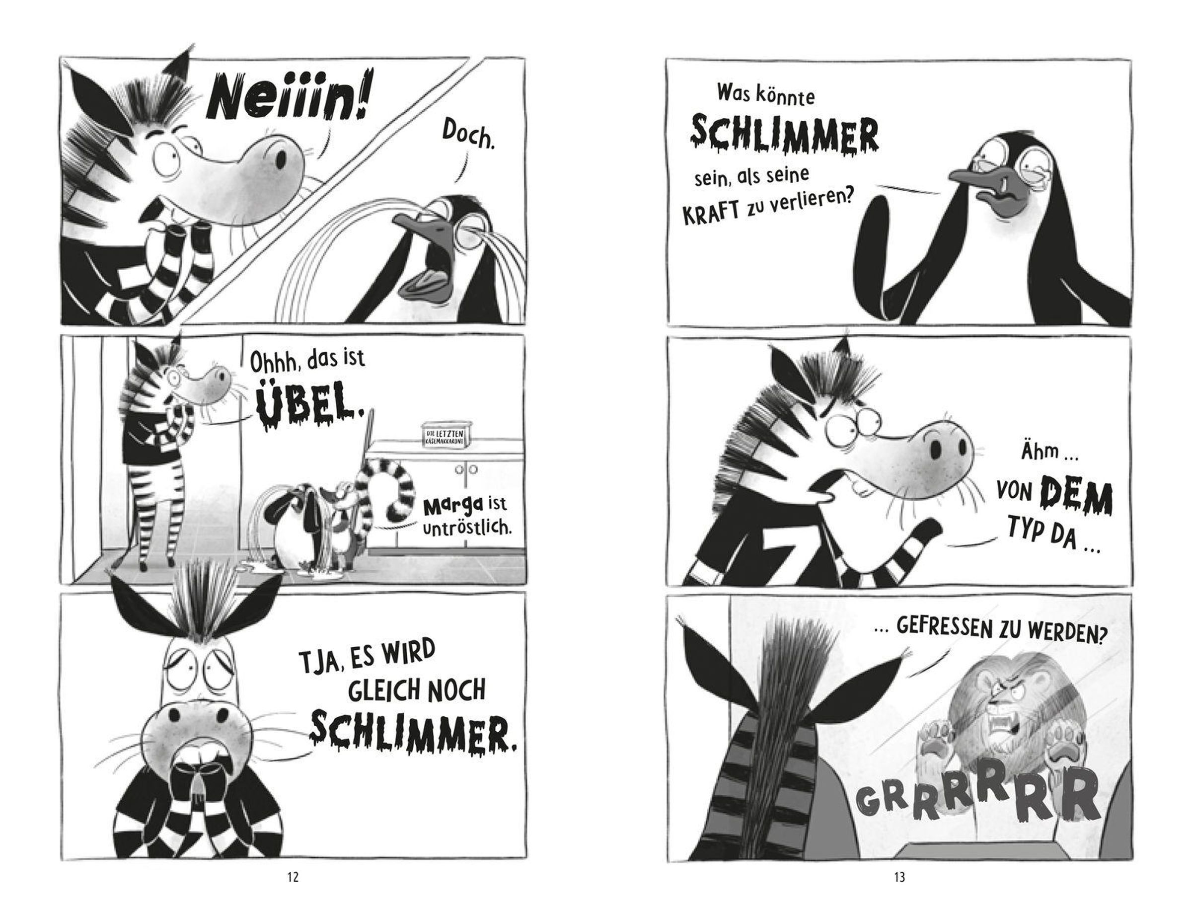 Im Superhelden-Café herrscht Panik: Pinguin Margarine hat ihre Fähigkeit verloren, Käsemakkaroni auf Knopfdruck zu zaubern - das beliebteste (und einzige) Gericht der Karte! Während Lemur Barry verzweifelt versucht, die Gäste zu bespaßen, setzt Zebra Zeb alles daran, Margarines Kräfte zurückzubringen - notfalls mit einer gefräßigen Löwenfamilie, die nur eines will: Käsemakkaroni. Und zwar sofort!