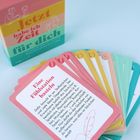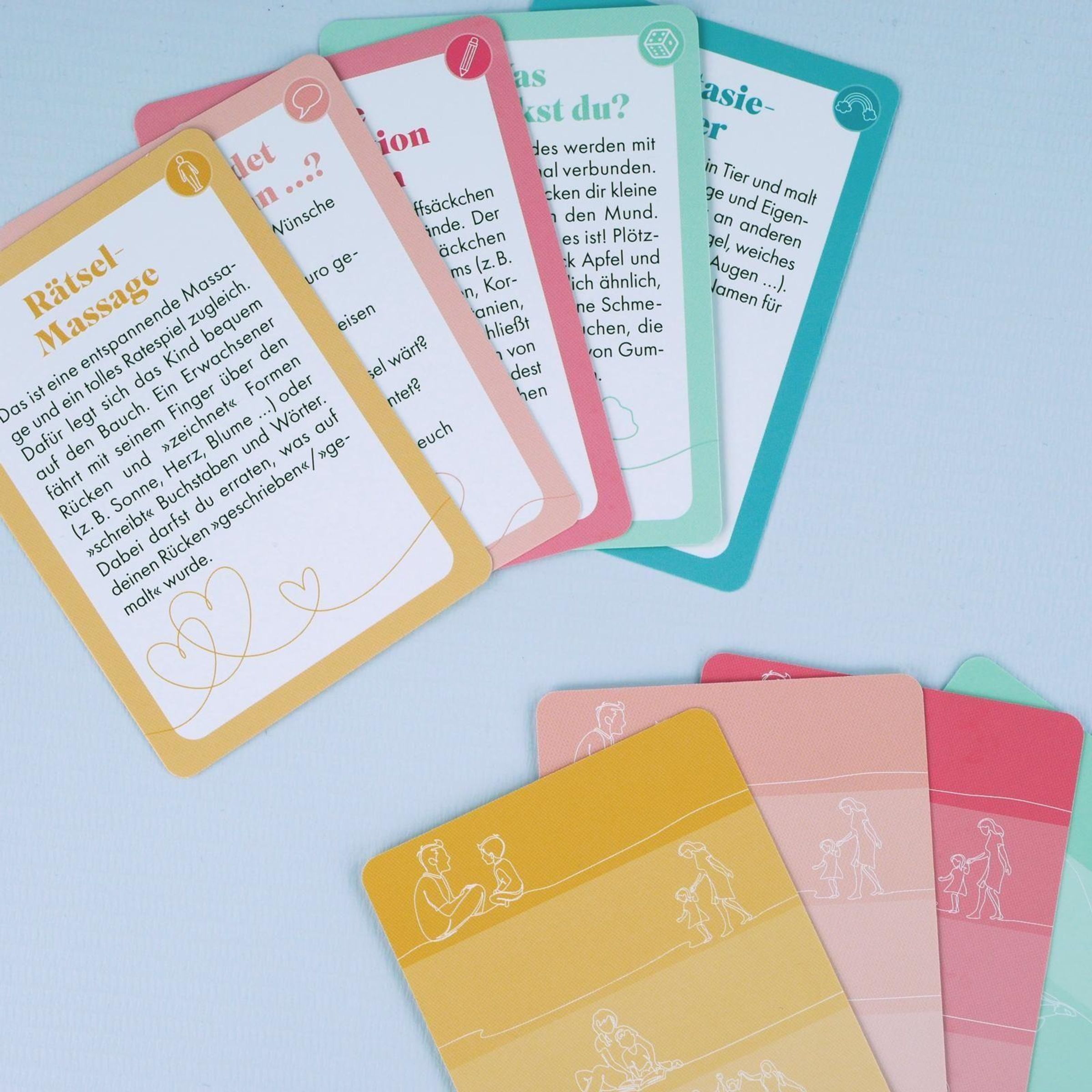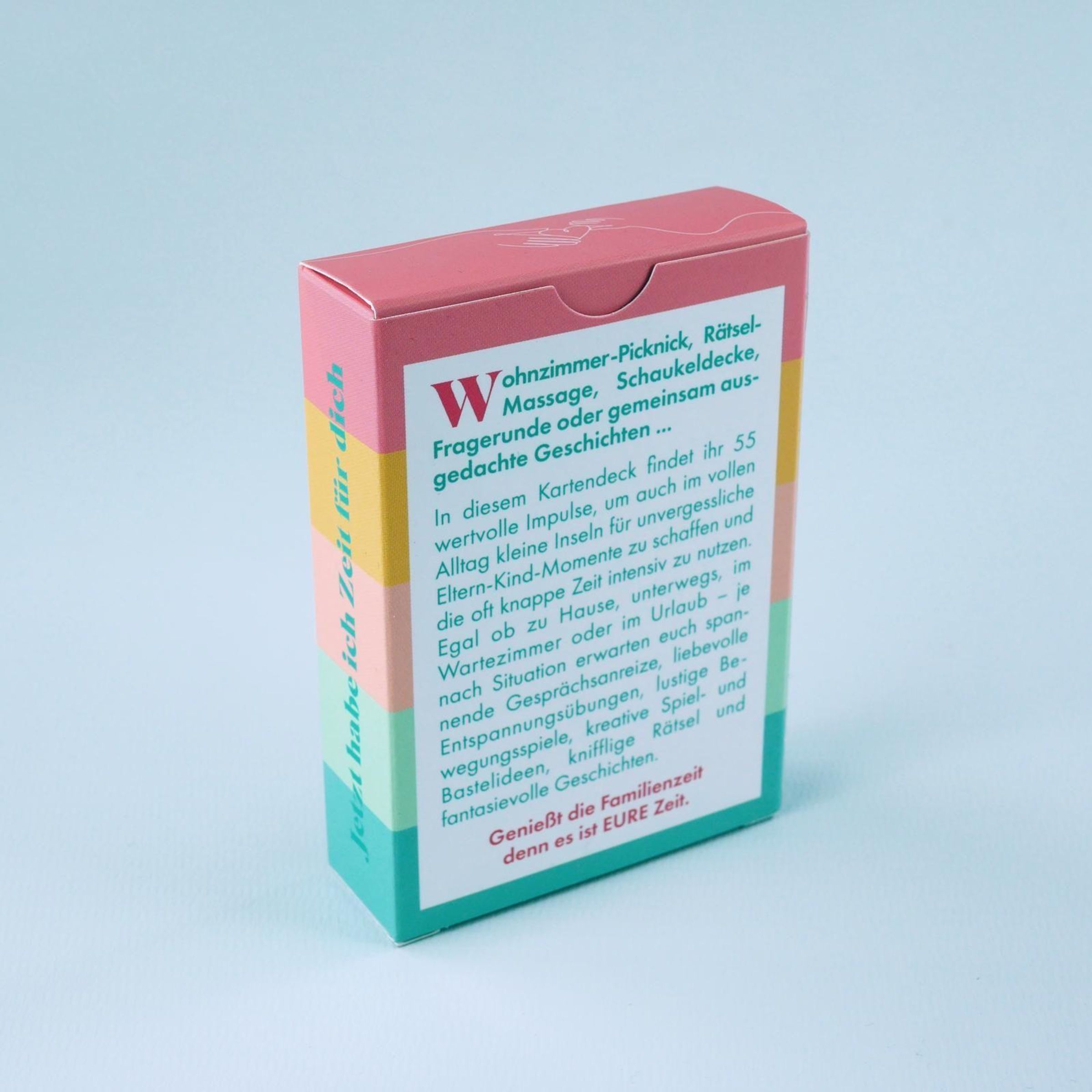Wohnzimmer-Picknick, Rätsel-Massage, Schaukeldecke, Fragerunde oder gemeinsam ausgedachte Geschichten ... In diesem Kartendeck findet ihr 55 wertvolle Impulse, um auch im vollen Alltag kleine Inseln für unvergessliche Eltern-Kind-Momente zu schaffen und die oft knappe Zeit intensiv zu nutzen. Egal ob zu Hause, unterwegs, im Wartezimmer oder im Urlaub - je nach Situation erwarten euch spannende Gesprächsanreize, liebevolle Entspannungsübungen, lustige Bewegungsspiele, kreative Spiel- und Bastelideen, knifflige Rätsel und fantasievolle Geschichten. Genießt die Familienzeit denn es ist EURE Zeit. - Für Familien mit Kinder zwischen 3 und 12 Jahren -