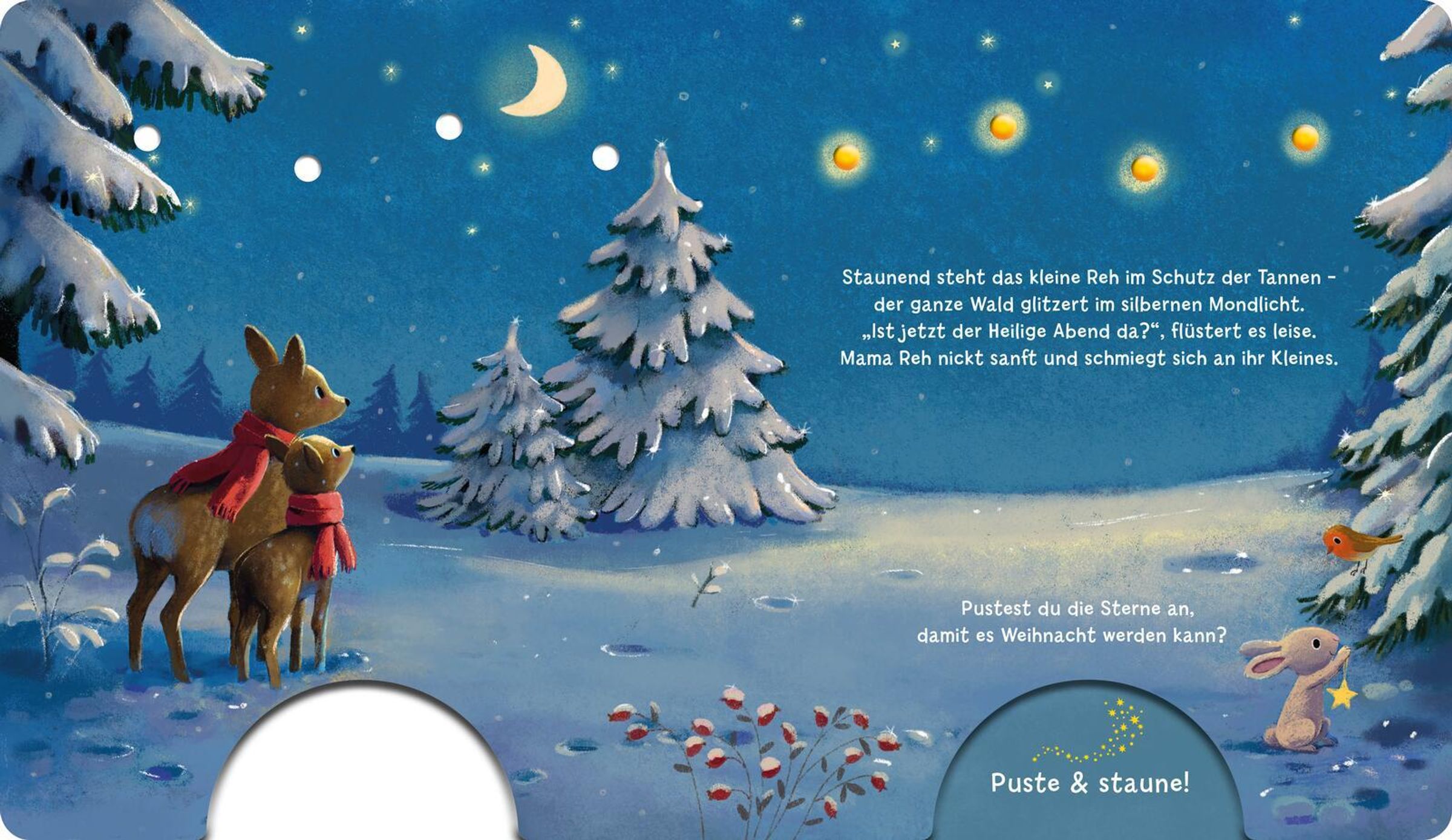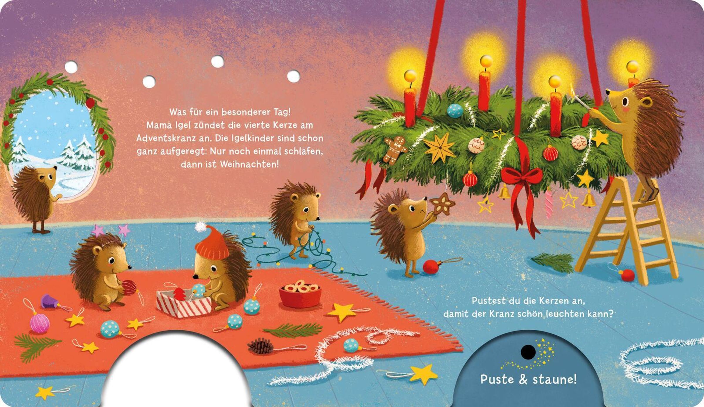 Die kleinen Leser ab 18 Monaten können auf jeder Seite mitmachen und die leuchtenden LED-Lichter durch Pusten zum Funkeln bringen. Ein zauberhaftes Puste-Buch zum Kennenlernen der Weihnachtsrituale.