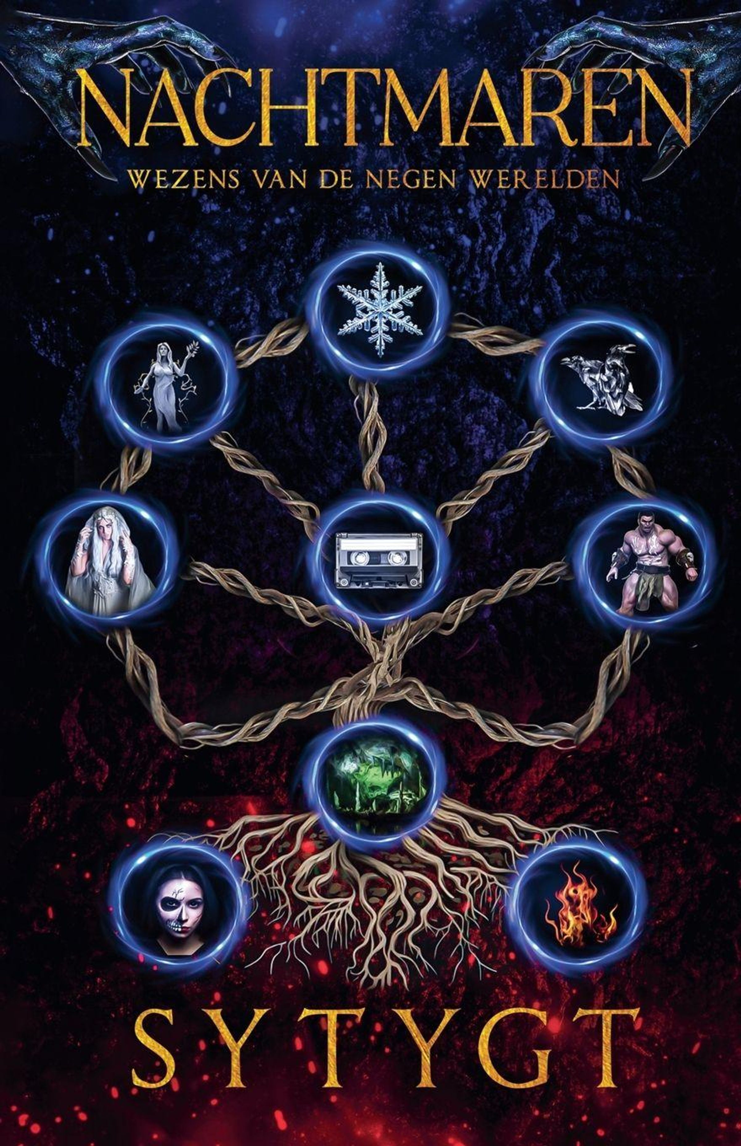 „Nachtmaren: Wezens van de Negen Werelden“ und „Sytygt“ in goldener Schrift. Illustration mit mythologischen Figuren und Symbolen., Buch