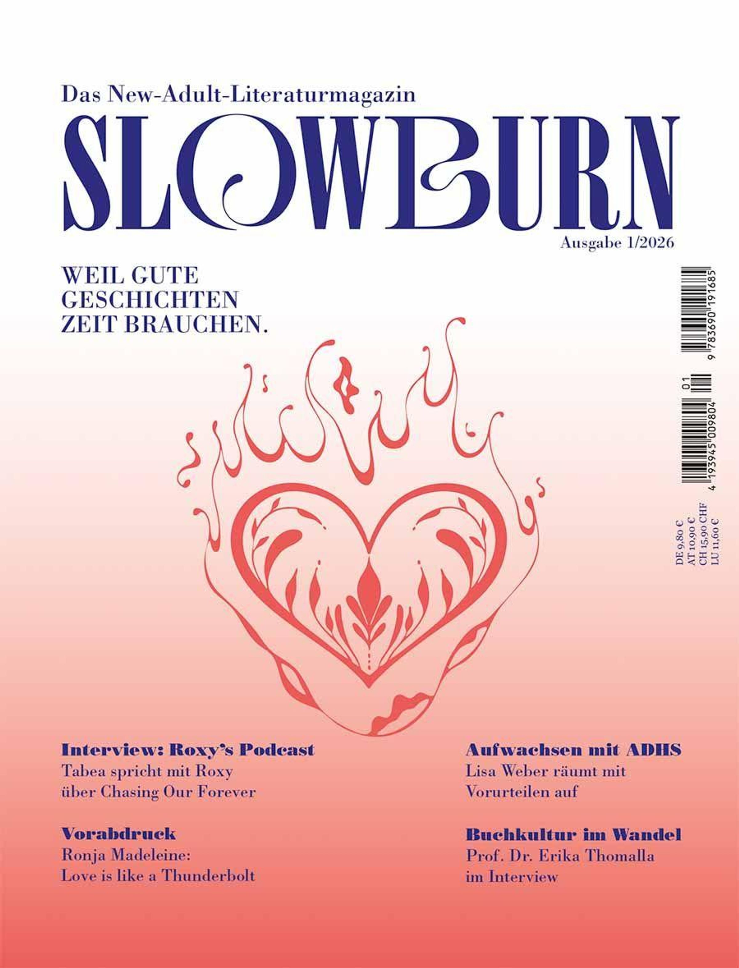 "Das New-Adult-Literaturmagazin SLOWBURN. Weil gute Geschichten Zeit brauchen." Oben Schrift, darunter stilisiertes Herz., Buch