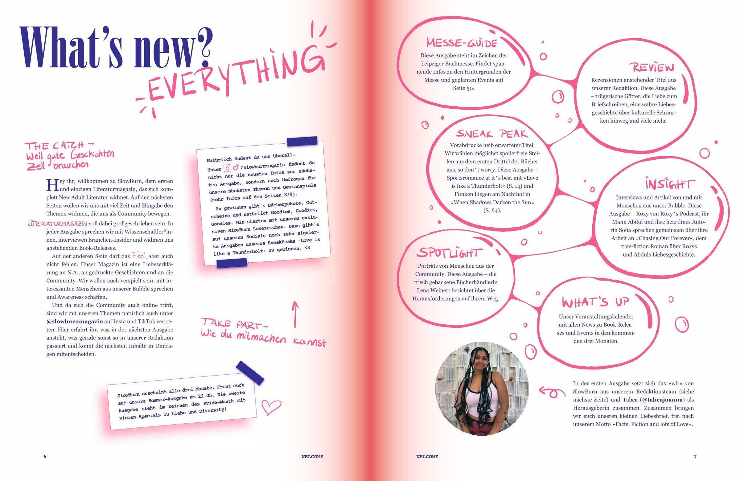 Das erste und einzige New-Adult-Literaturmagazin! Seit einiger Zeit herrscht in der New-Adult-Szene Überforderung. Welches Buch soll gelesen werden, welche Veranstaltungen gibt es in meiner Nähe, welche Themen sind gerade beliebt? SlowBurn - benannt nach dem New-Adult-Subgenre, in dem es um sich langsam entwickelnde Liebesgeschichten geht - hat sich zum Ziel gesetzt, das einordnende, mit viel Zeit und Leidenschaft in die Tiefe gehende Medium zu sein. Und das nicht nur für die Community, sondern auch von ihr. Wechselnde Influencerinnen unterstützen das Redaktionsteam nämlich inhaltlich und gestalten gleichzeitig den Onlineauftritt des Magazins mit. Die Redaktion arbeitet auf Hochtouren, frei nach dem Motto: Facts, Fiction and Lots of Love