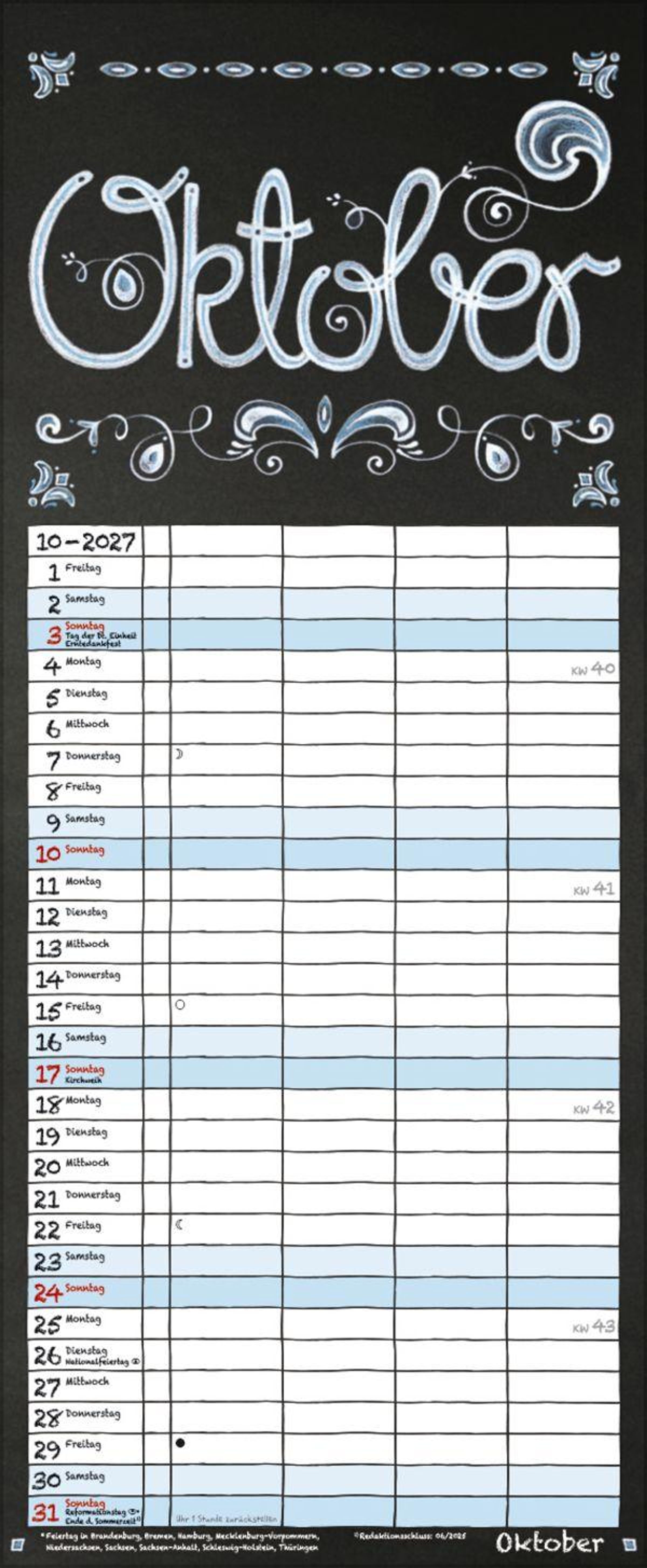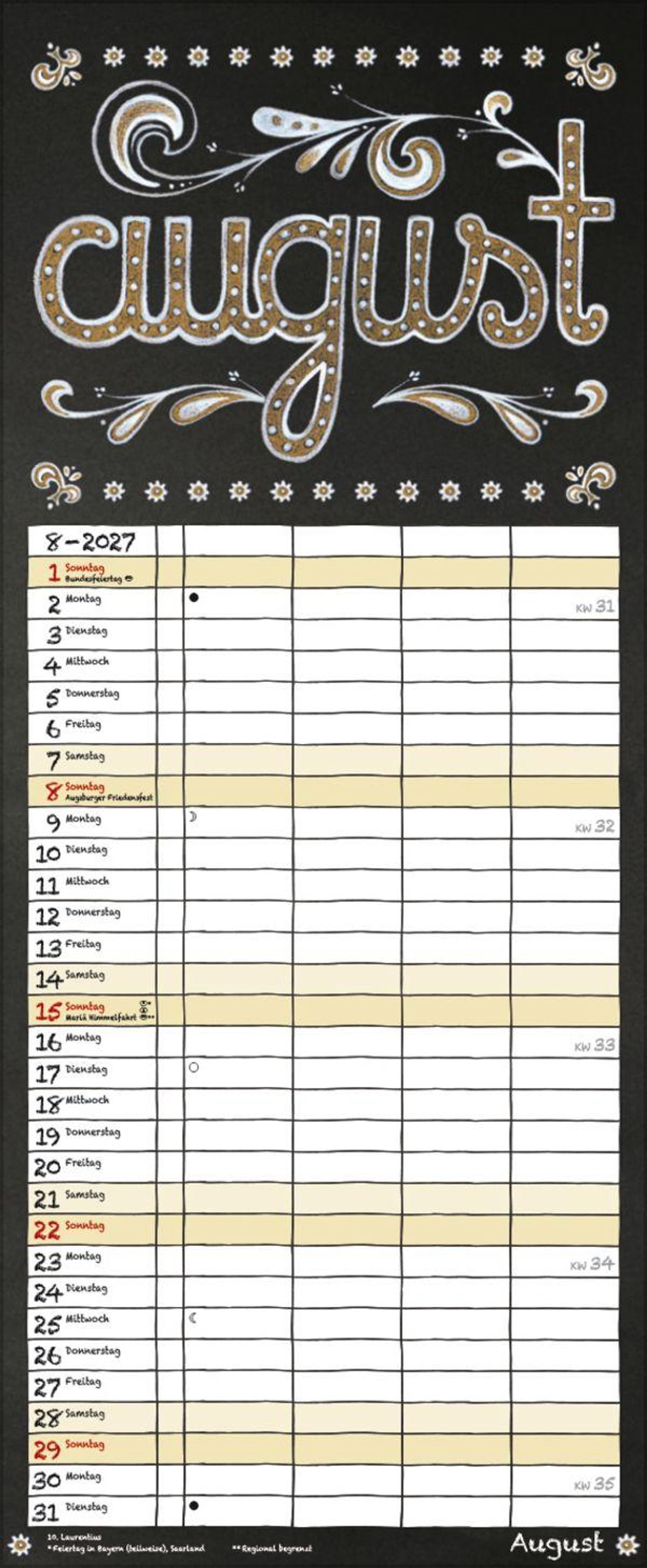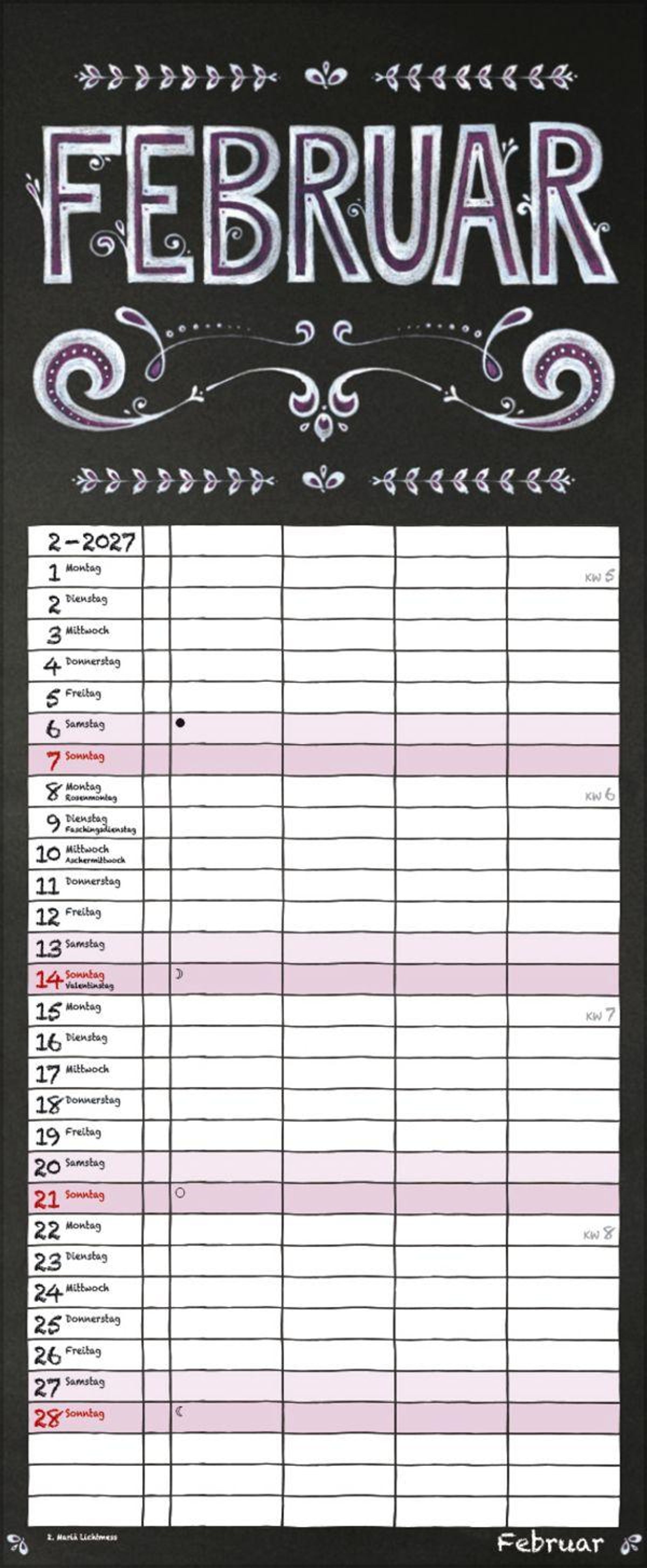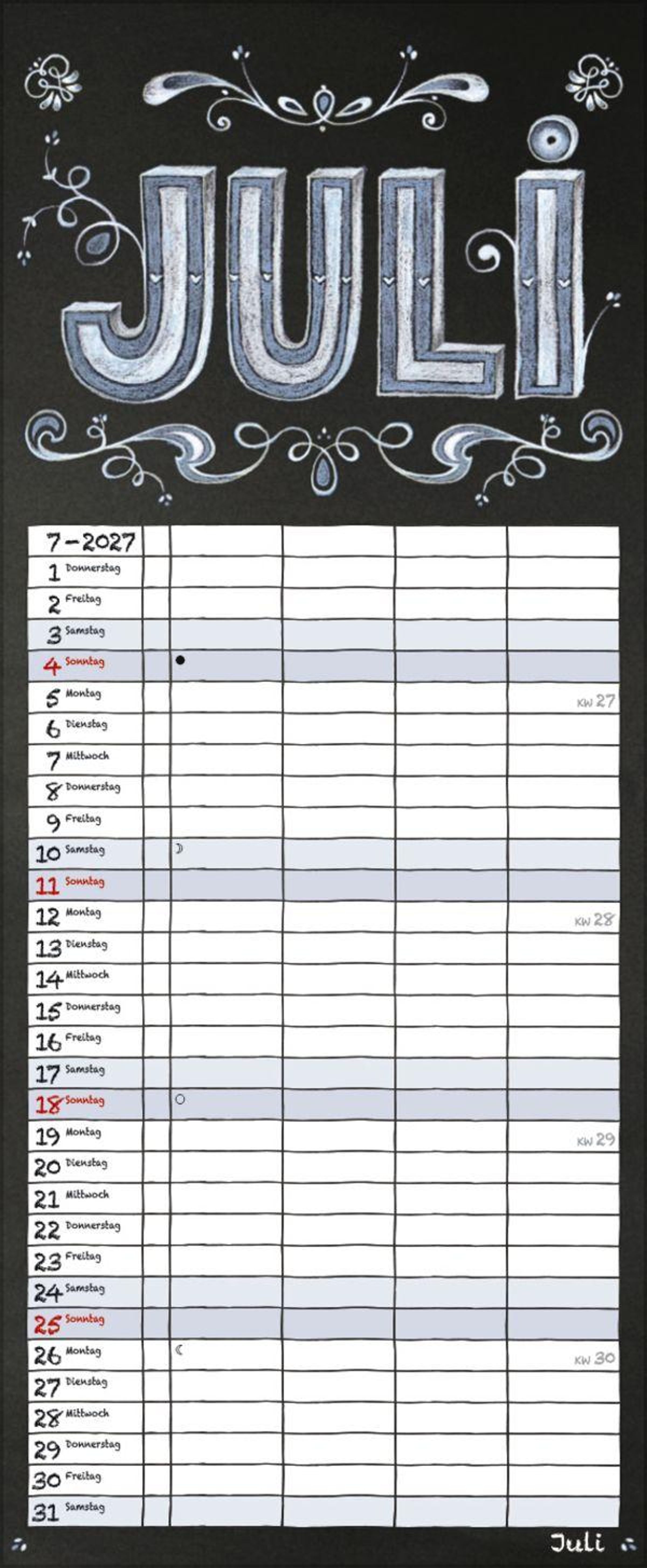 - Typo Art Familienkalender mit 4 breiten Spalten in Tafeloptik. Hochwertiger Familienplaner mit Ferienterminen, Vorschau bis März 2027.