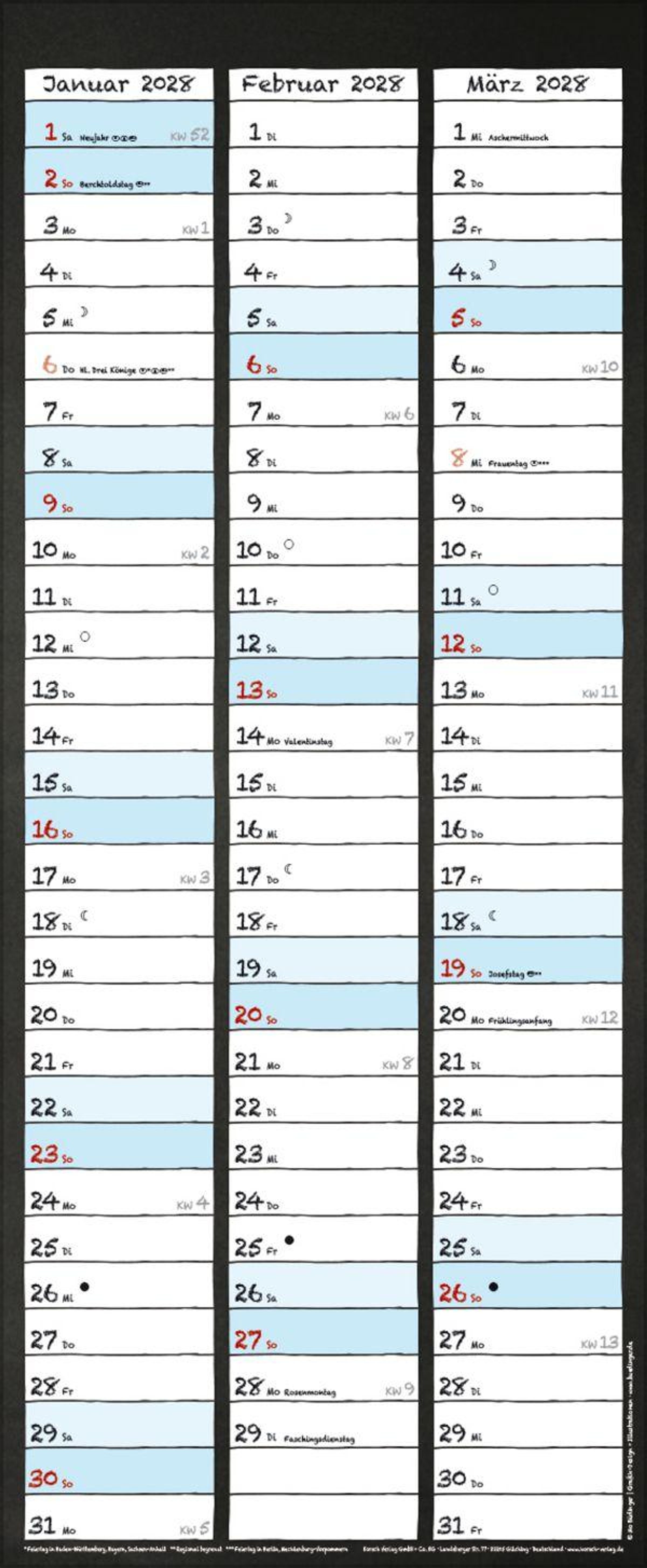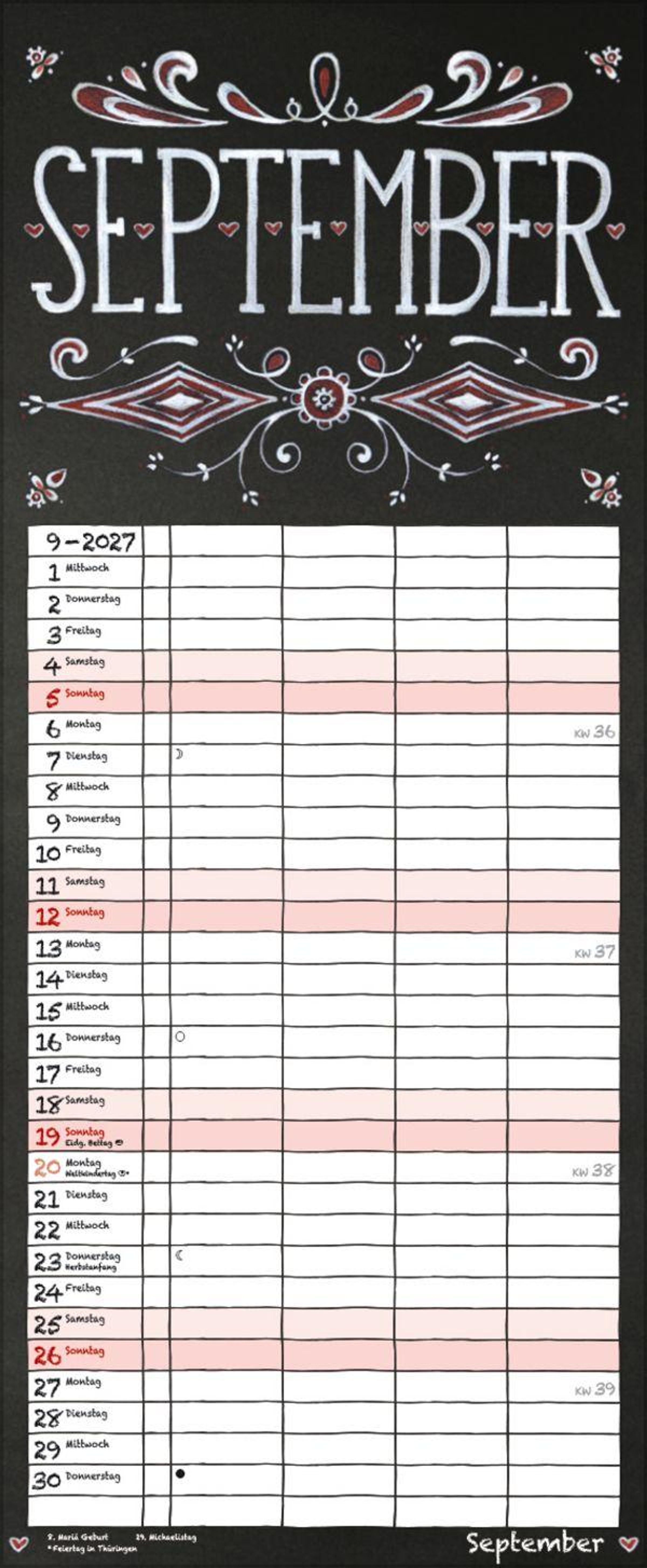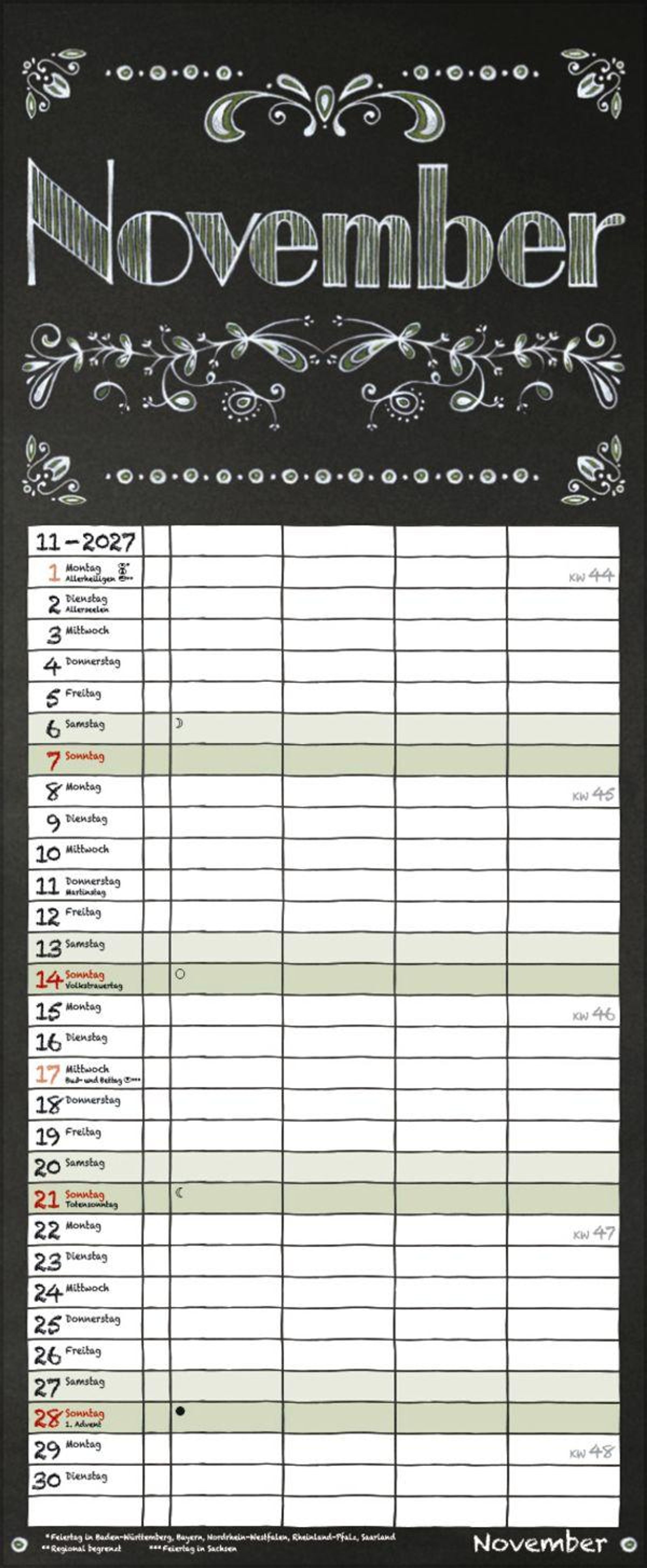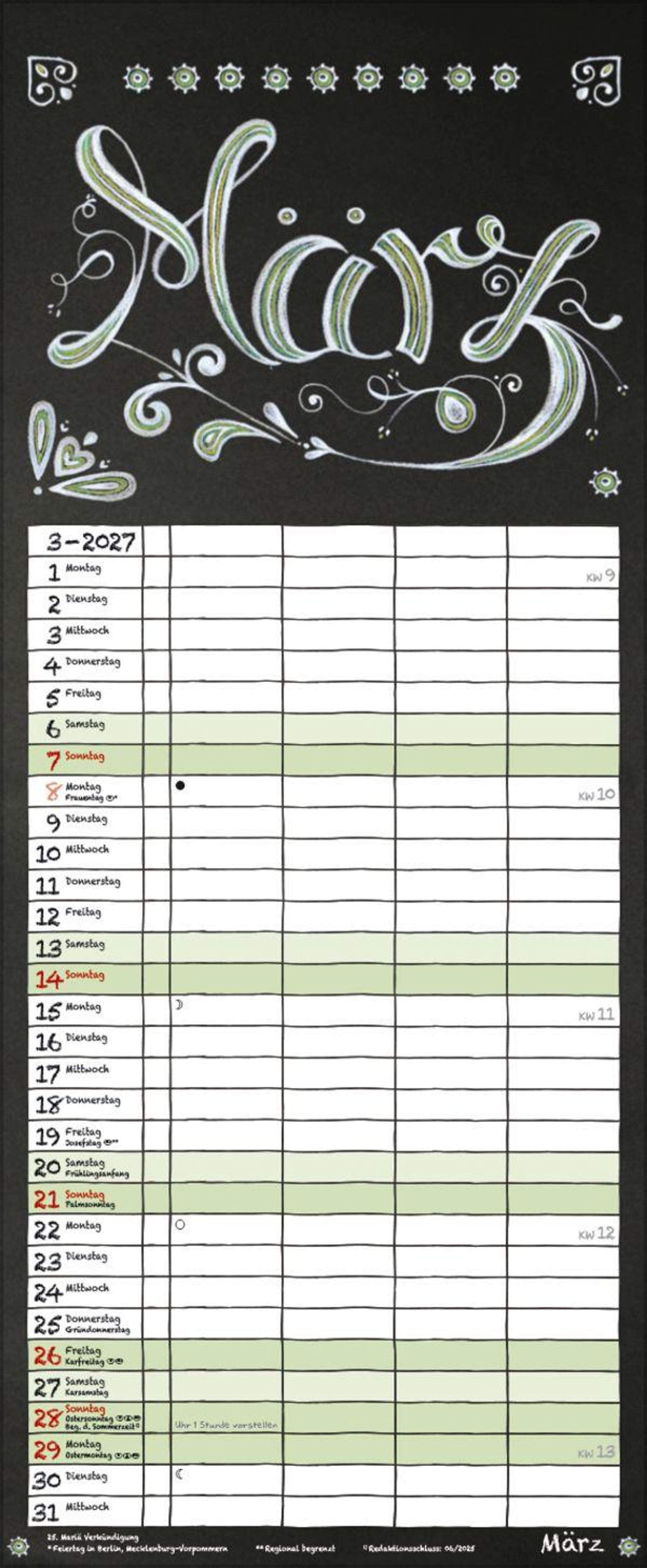 - Typo Art Familienkalender mit 4 breiten Spalten in Tafeloptik. Hochwertiger Familienplaner mit Ferienterminen, Vorschau bis März 2027.