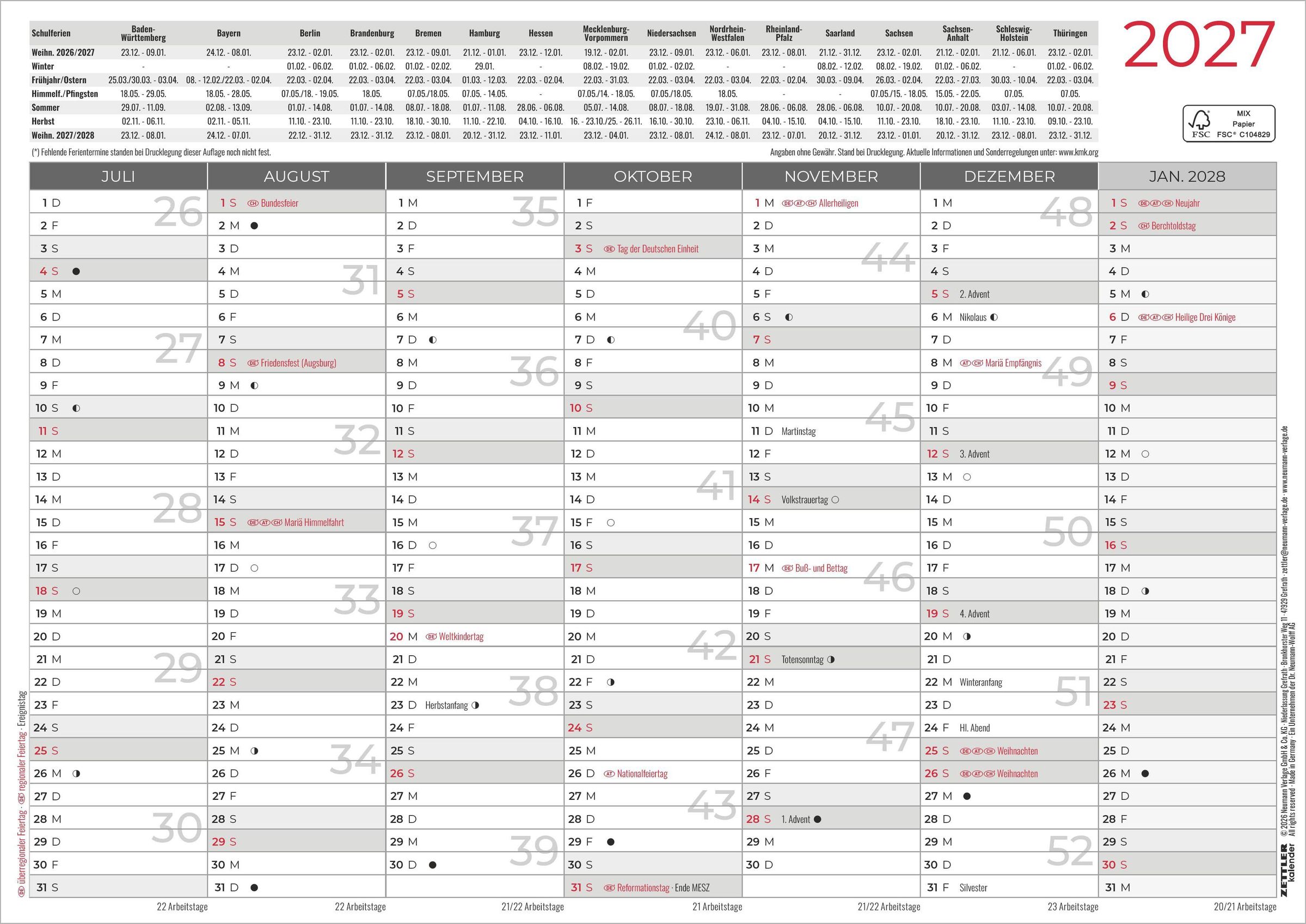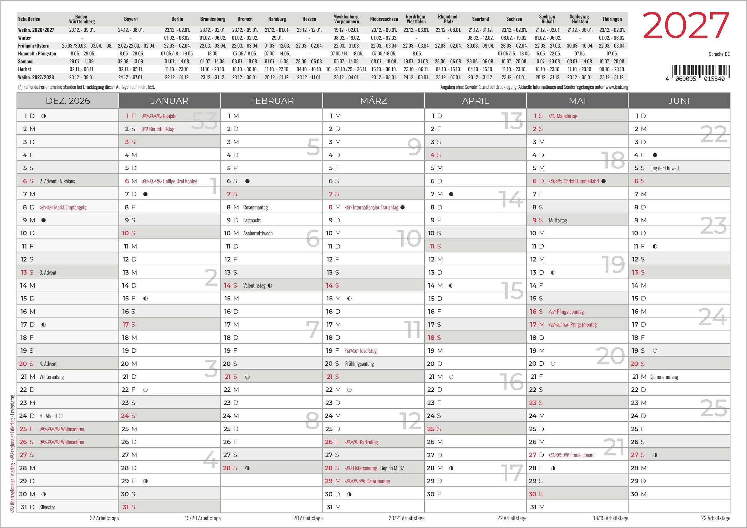 Kalenderwochen & Arbeitstagezählung: Pro Monat mit praktischer Arbeitstage-Übersicht.