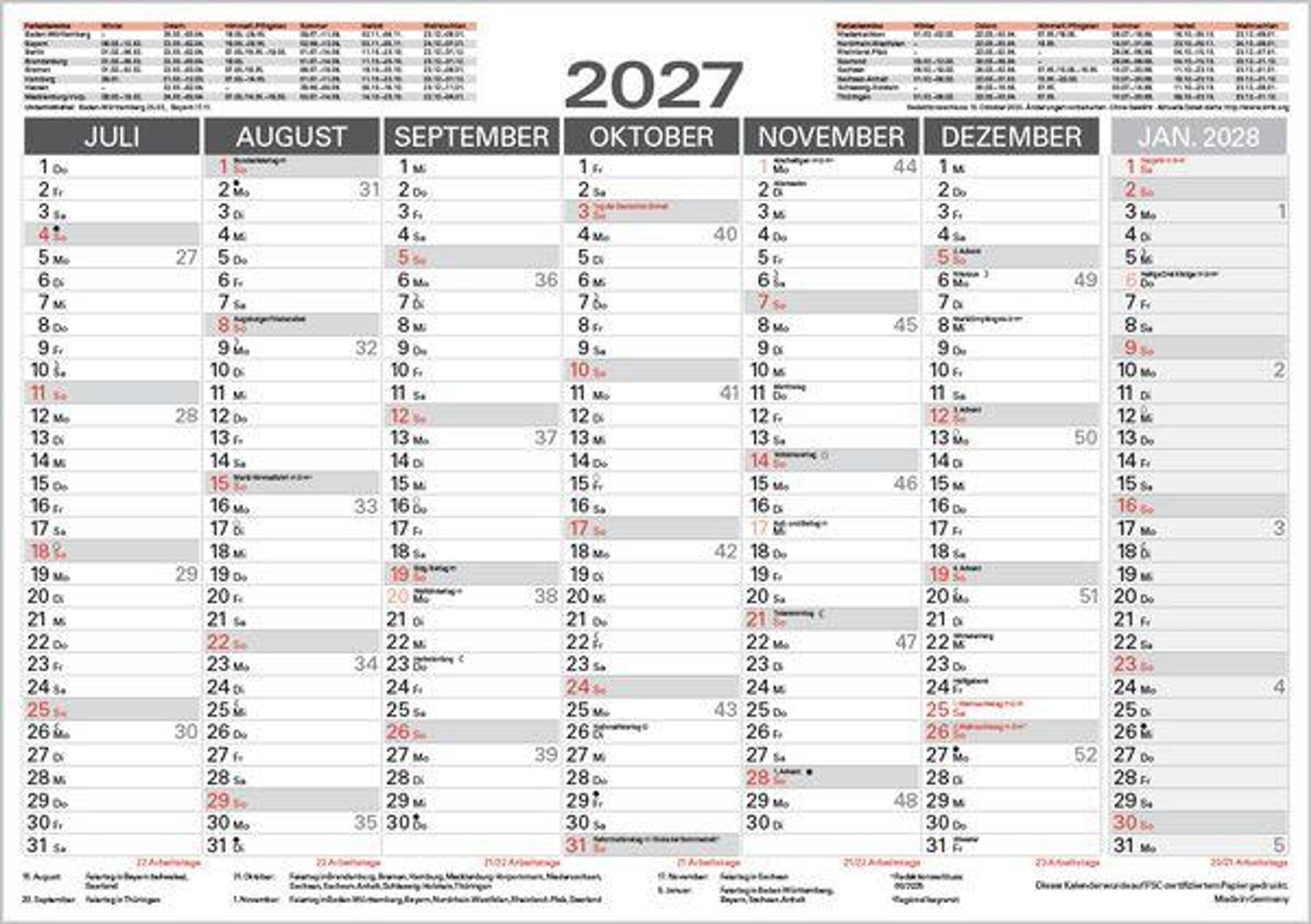 Kalendarium auf Deutsch mit hervorgehobenen Sonn- und Feiertagen für D, A und CH