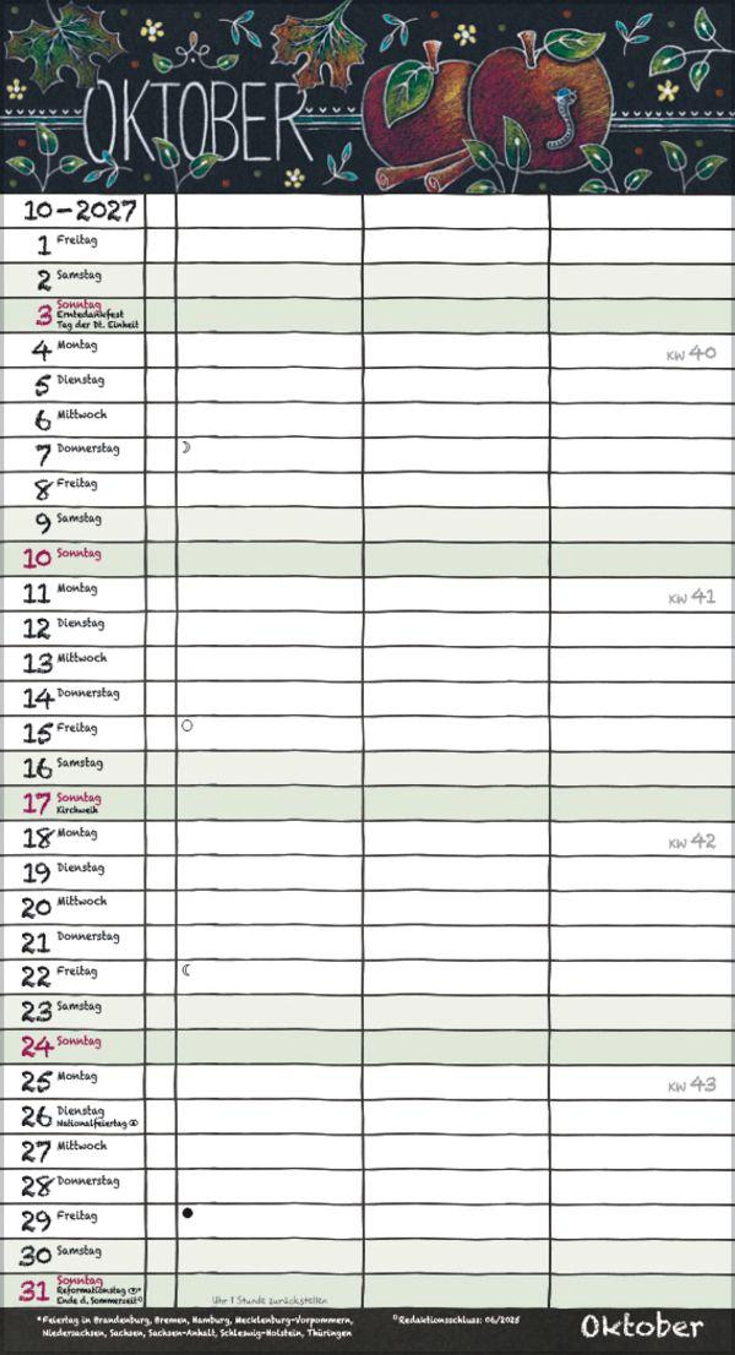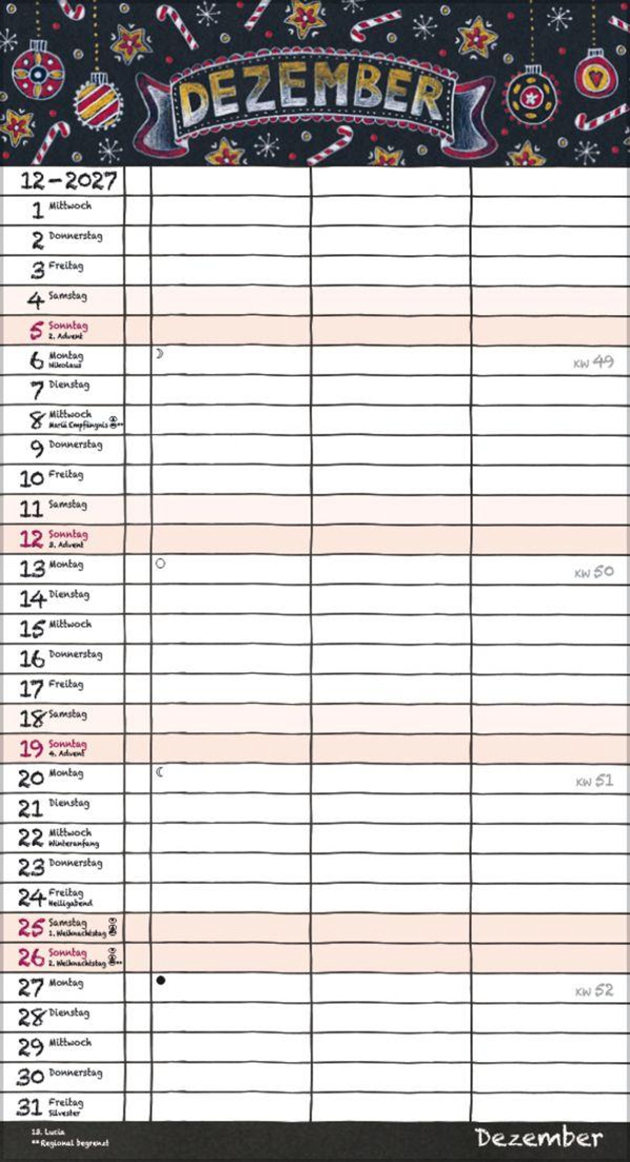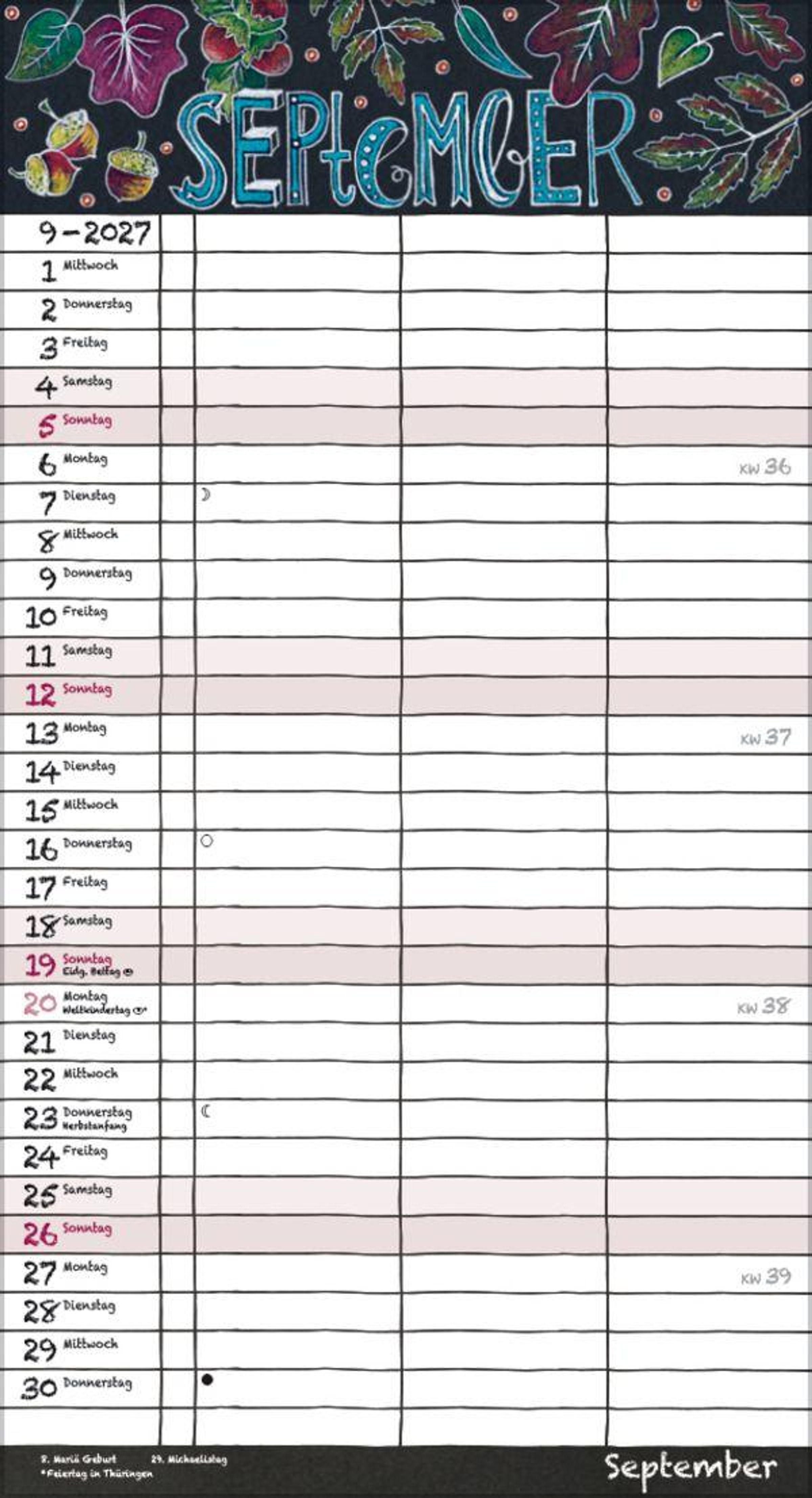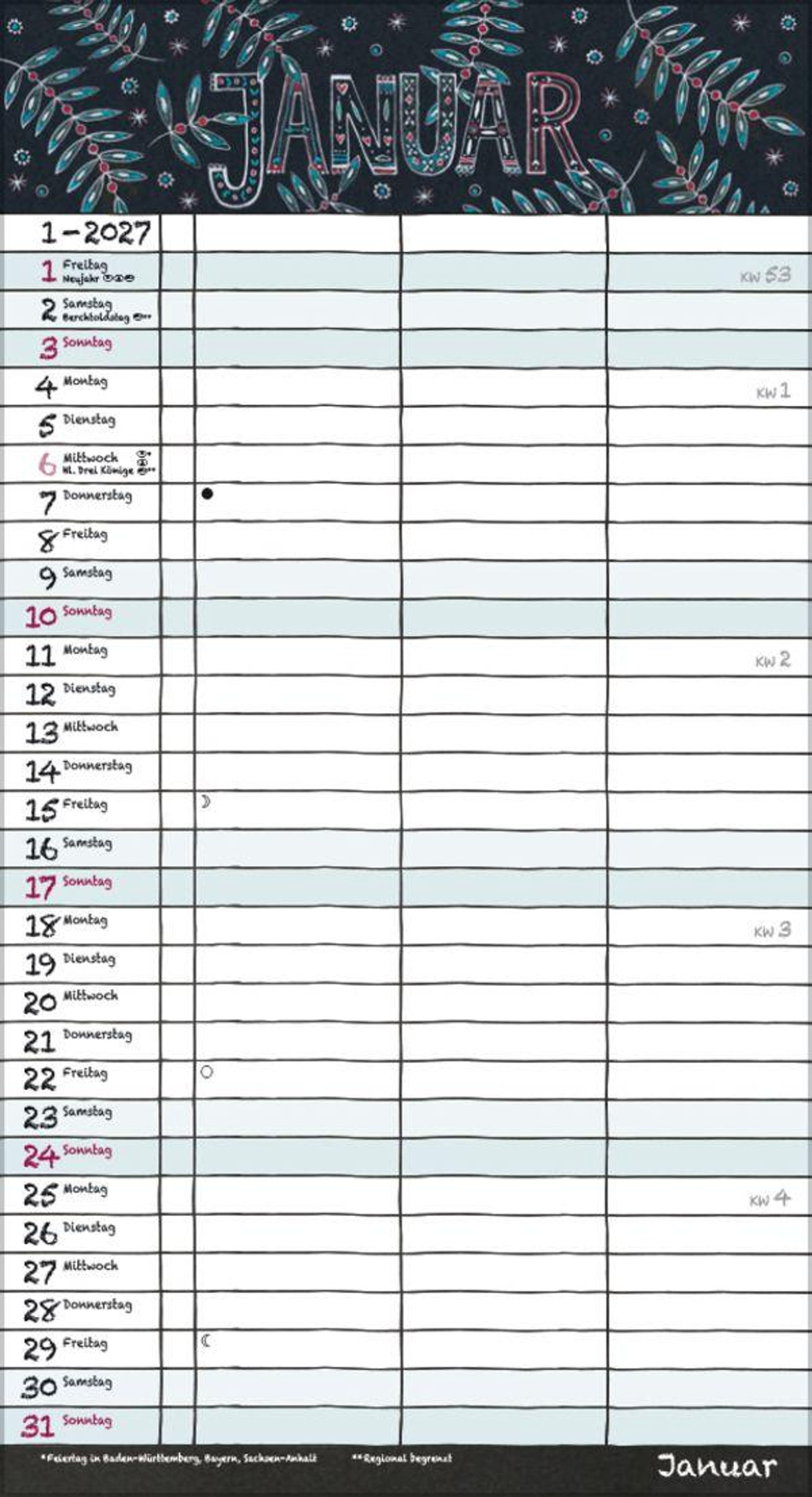 - Familientimer, 3 große Spalten. Mit Ferienterminen, extra Spalte und Vorschau bis März 2027 und vielem mehr. Format: 19 x 46 cm