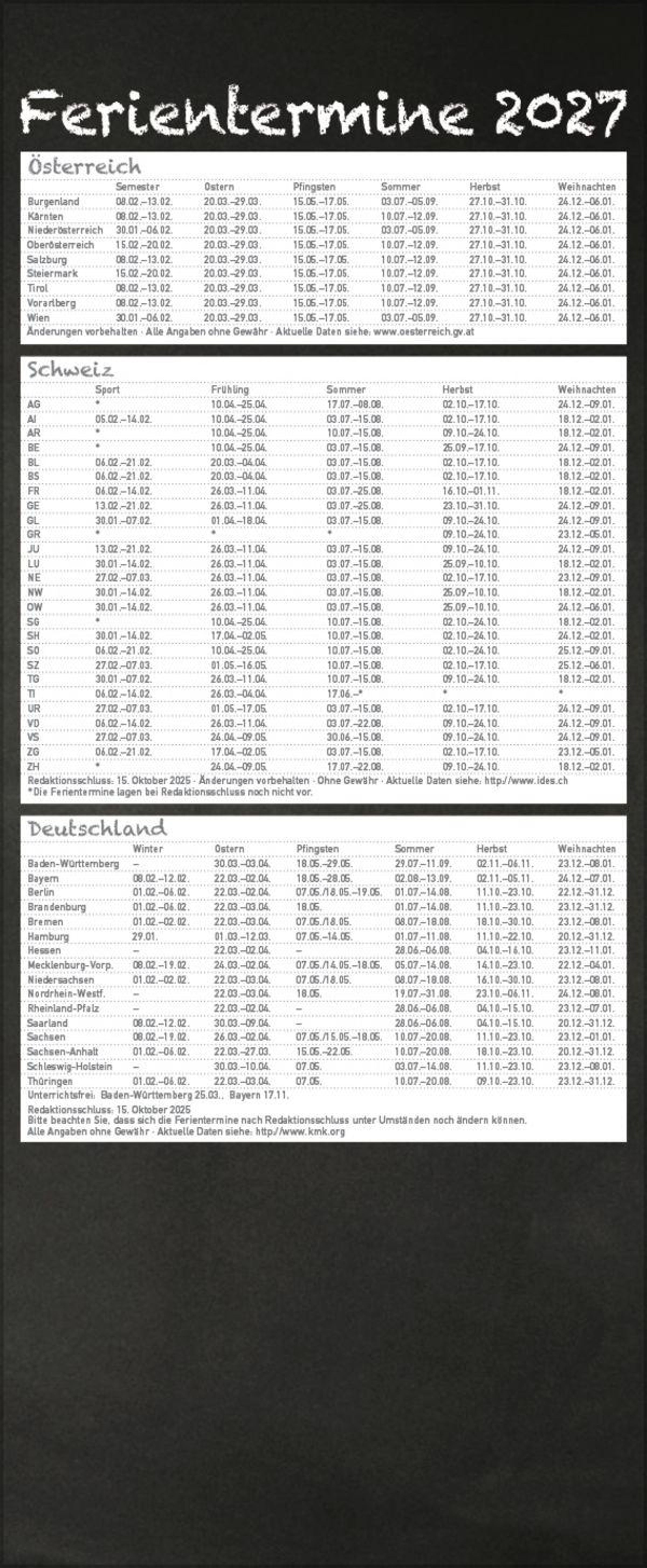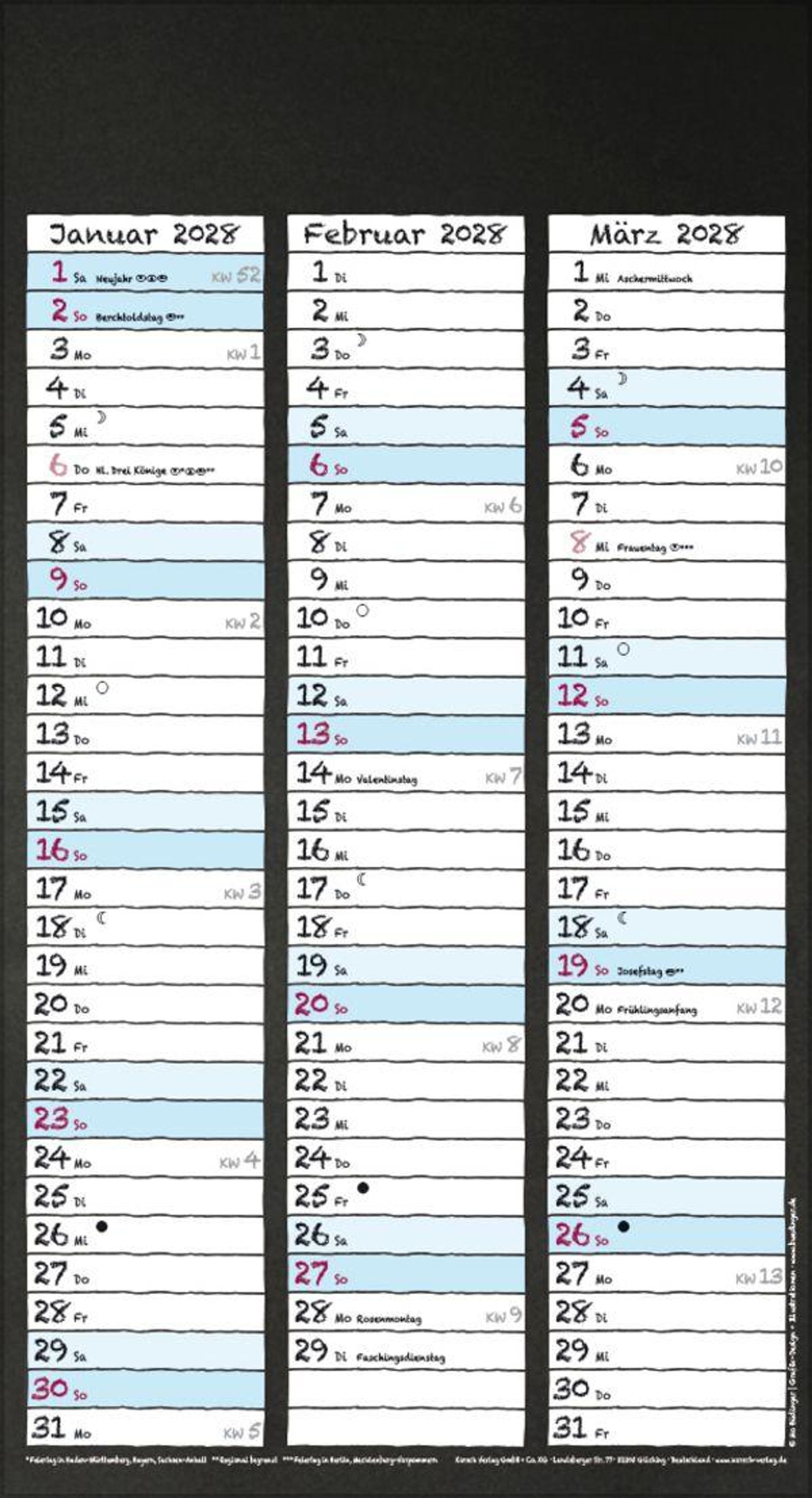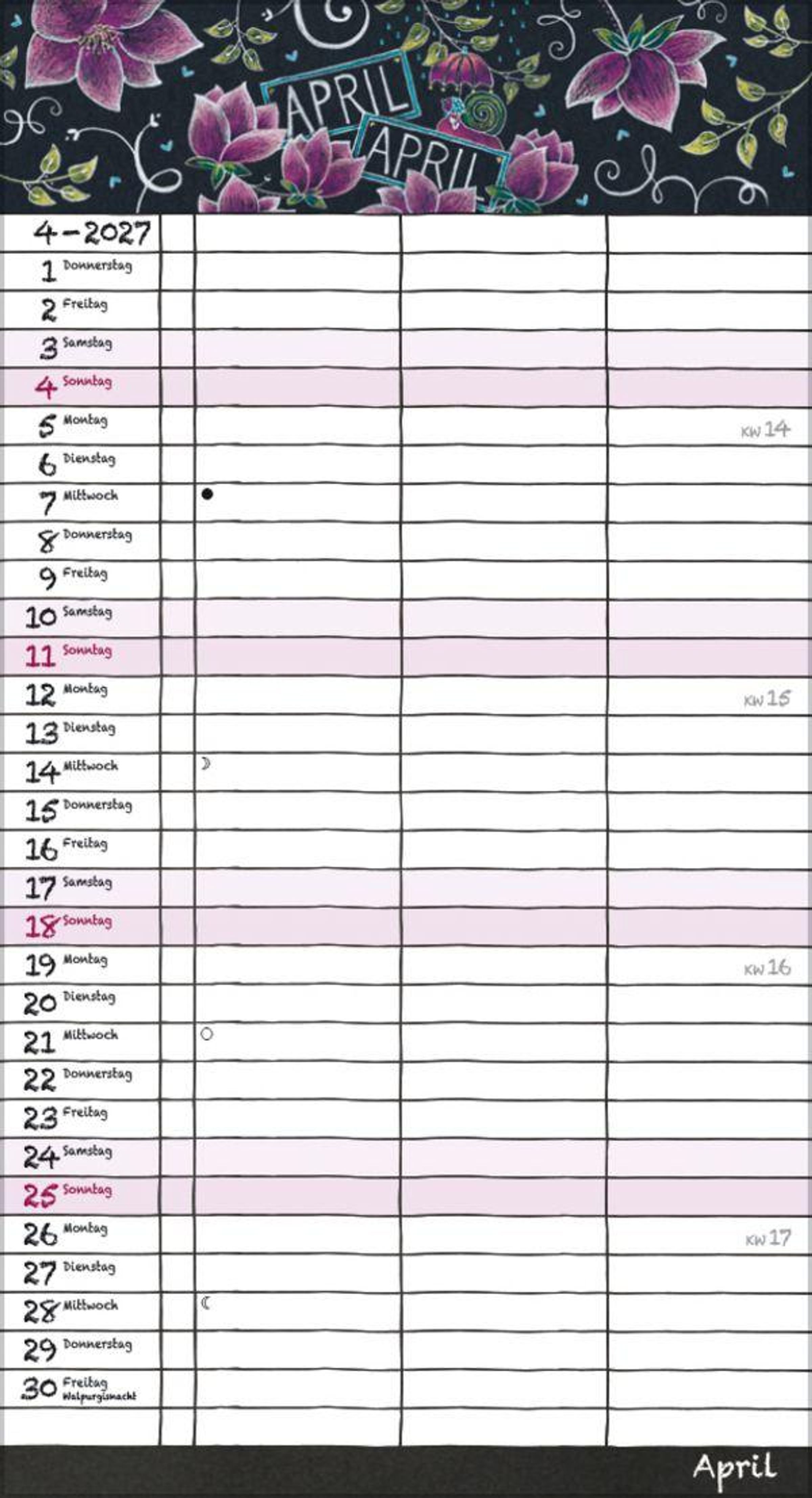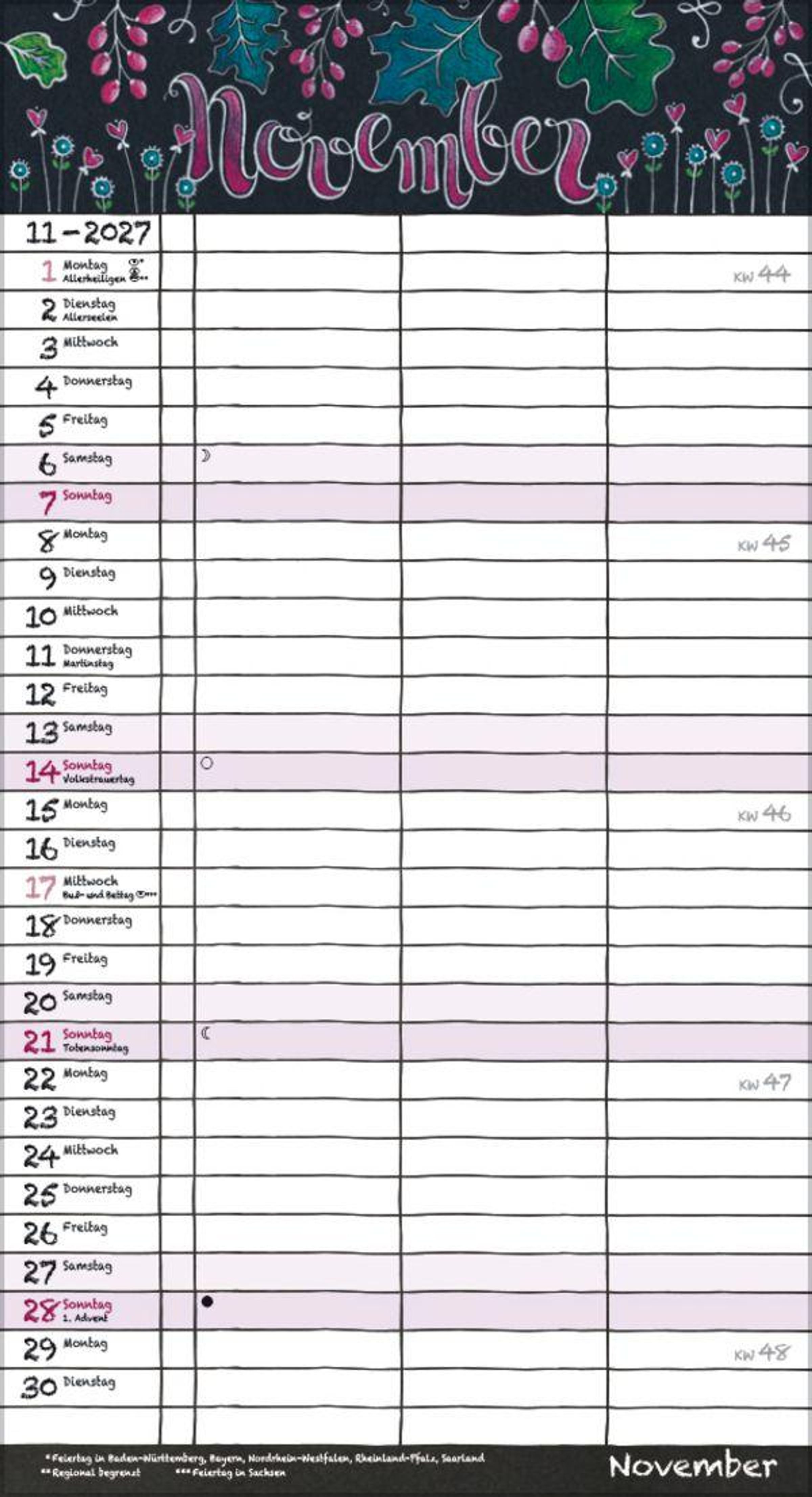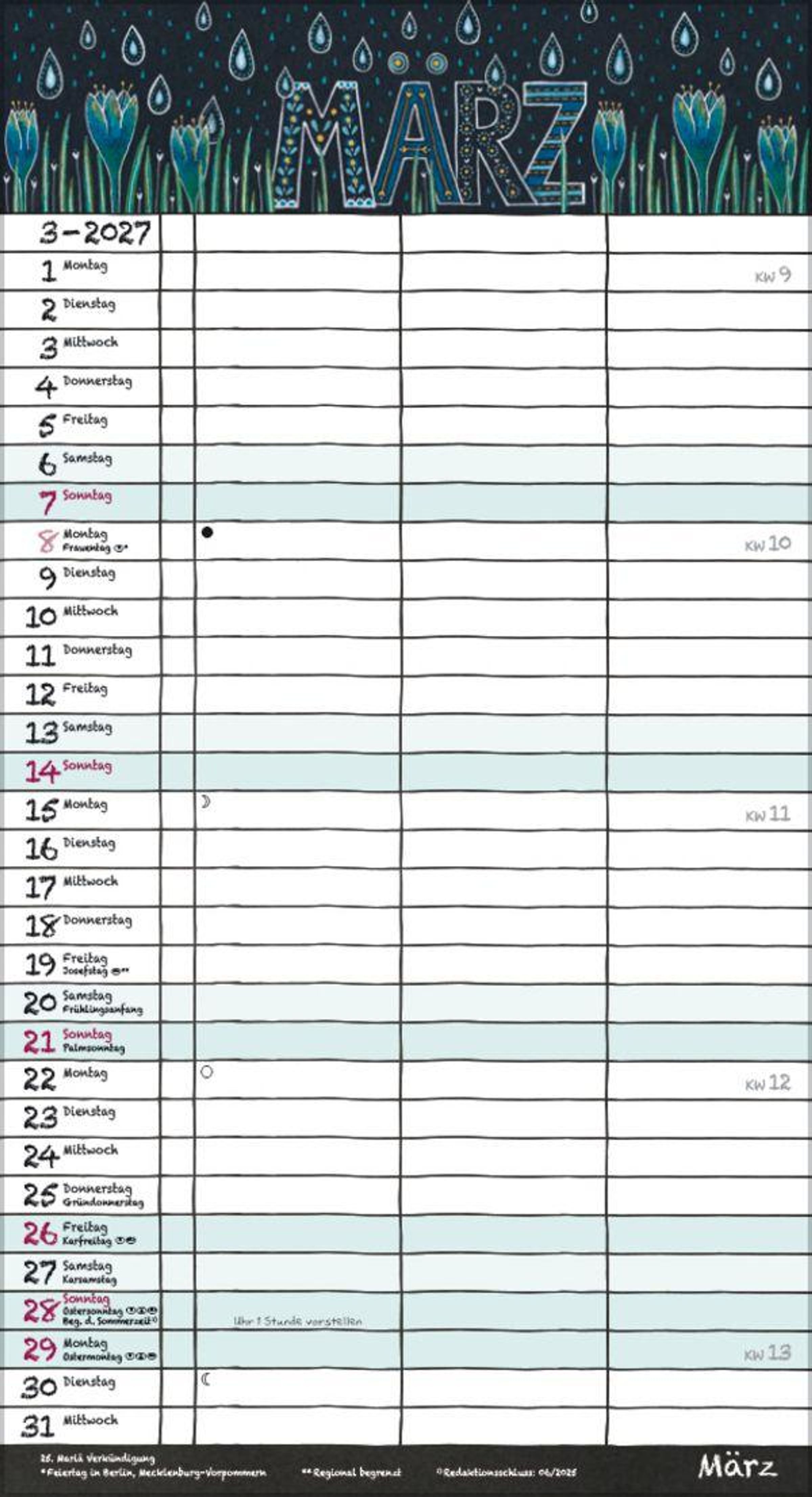 - Familientimer, 3 große Spalten. Mit Ferienterminen, extra Spalte und Vorschau bis März 2027 und vielem mehr. Format: 19 x 46 cm
