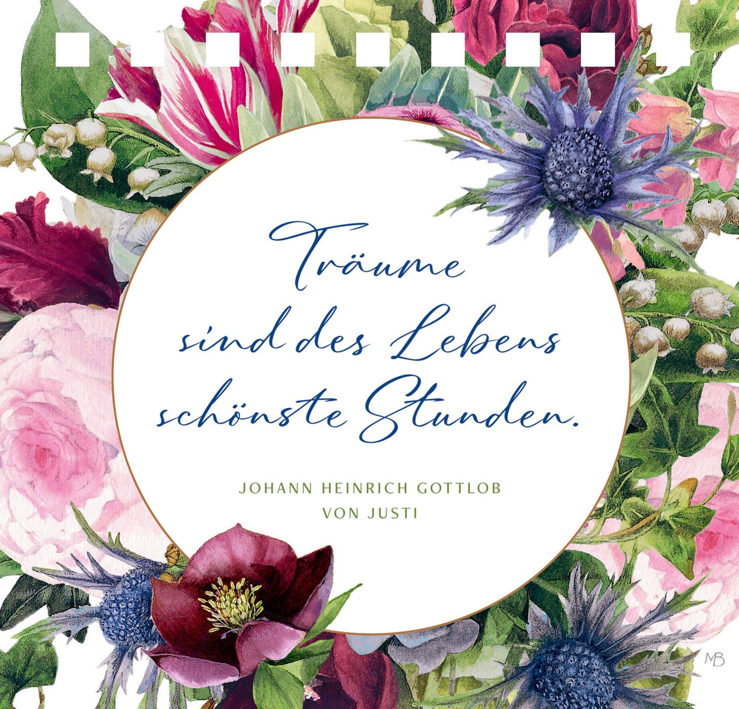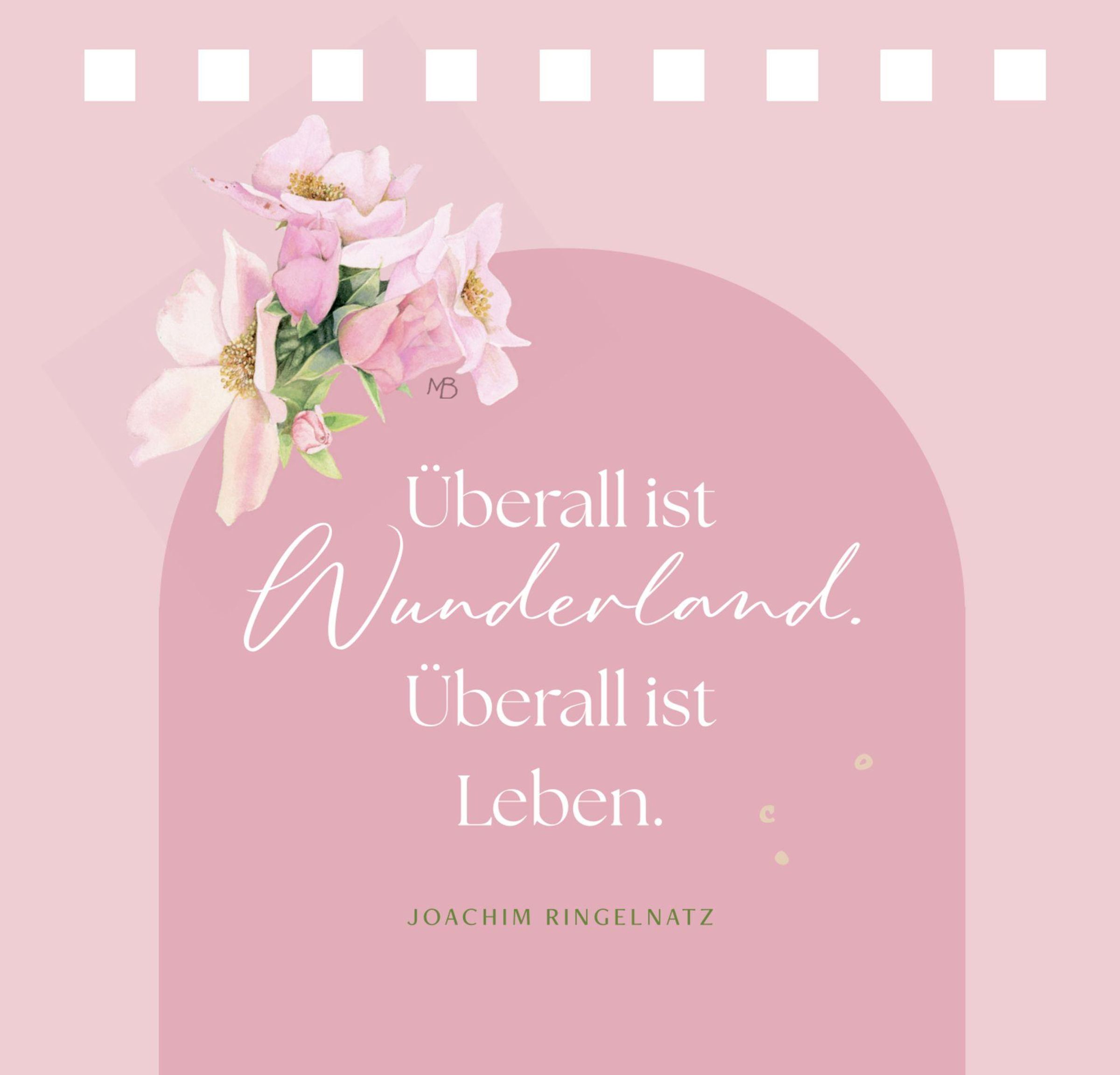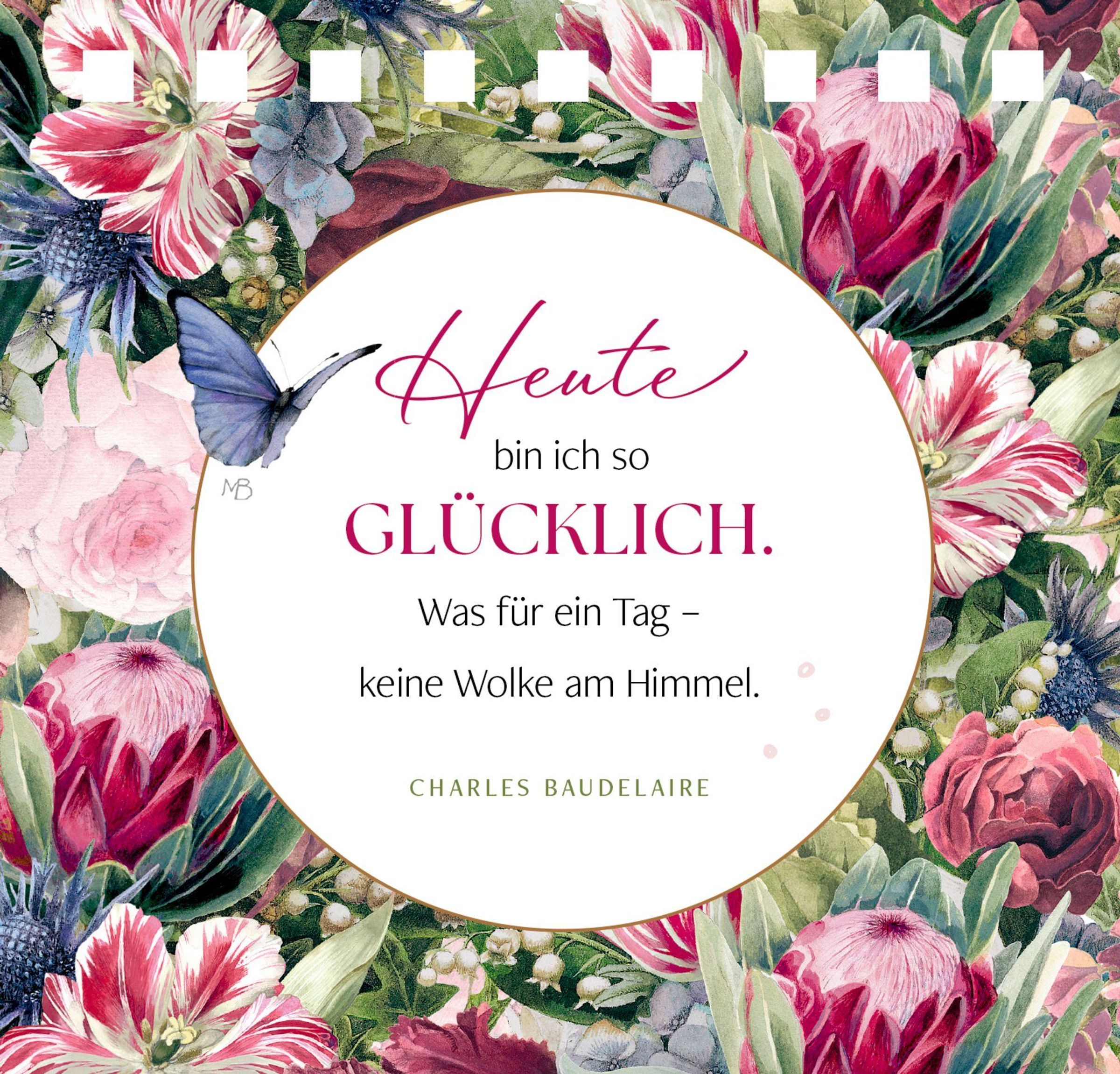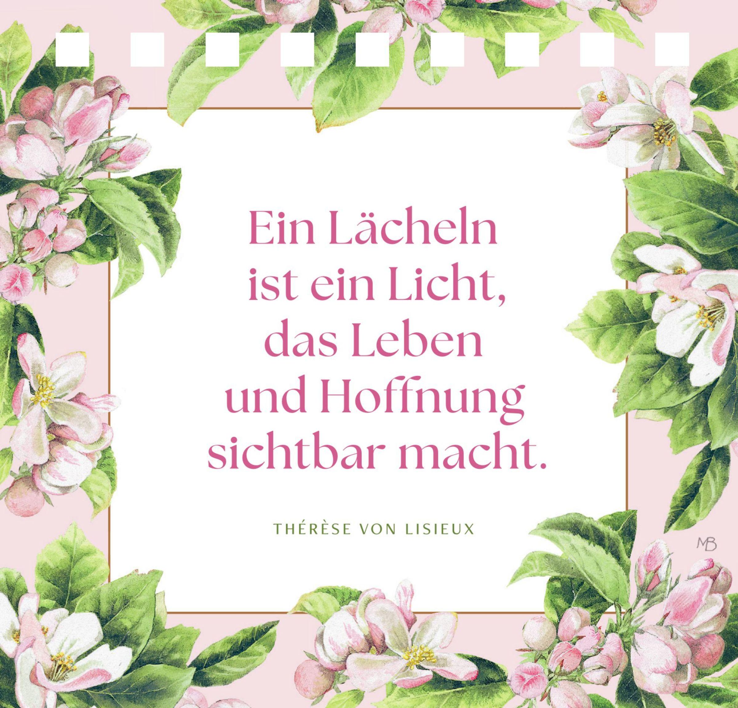 "Tag für Tag ein Grund zum Lächeln" in der Mitte. Illustration von Blumen, Schmetterling oben links, gebundene Spiralbindung., Buch
