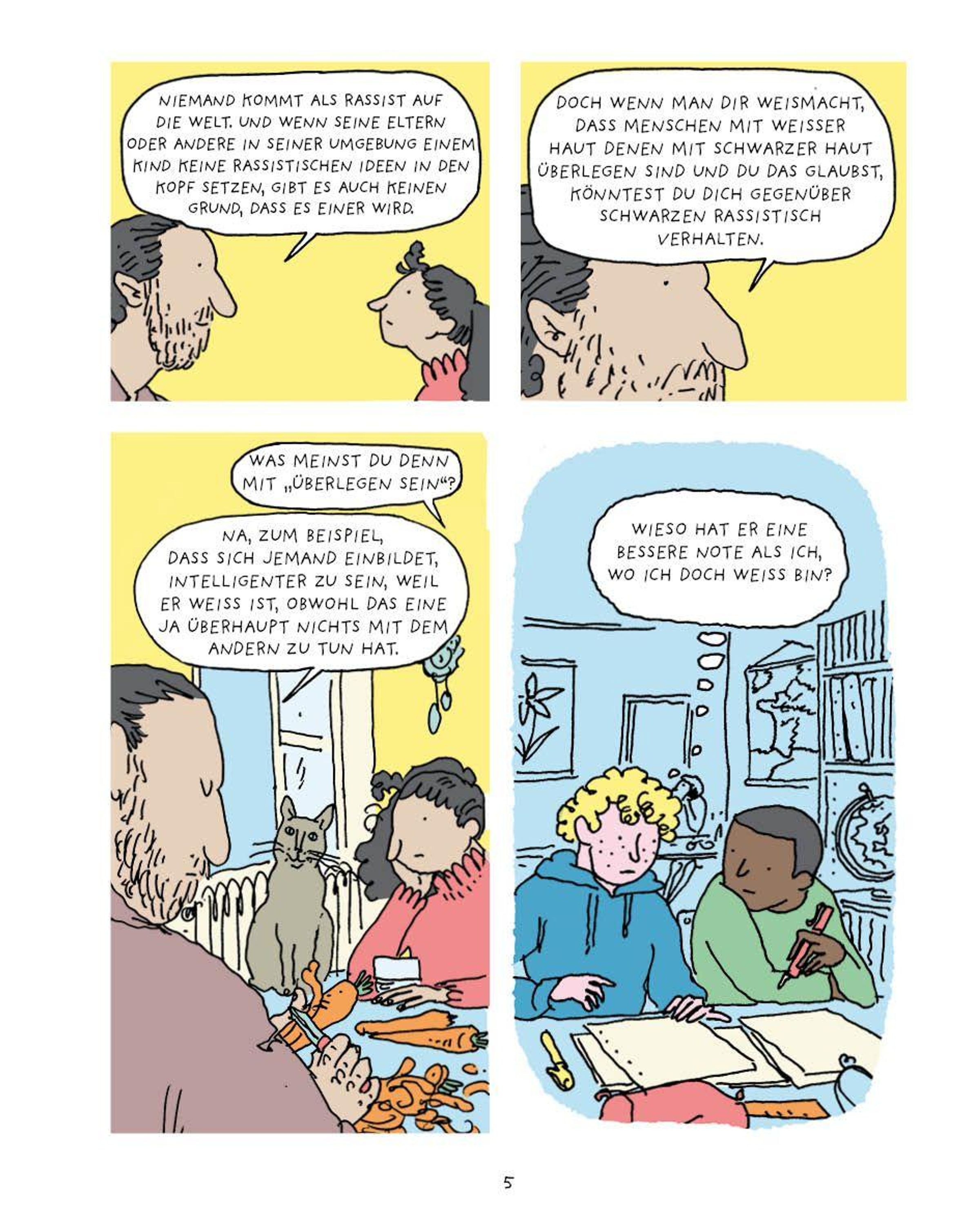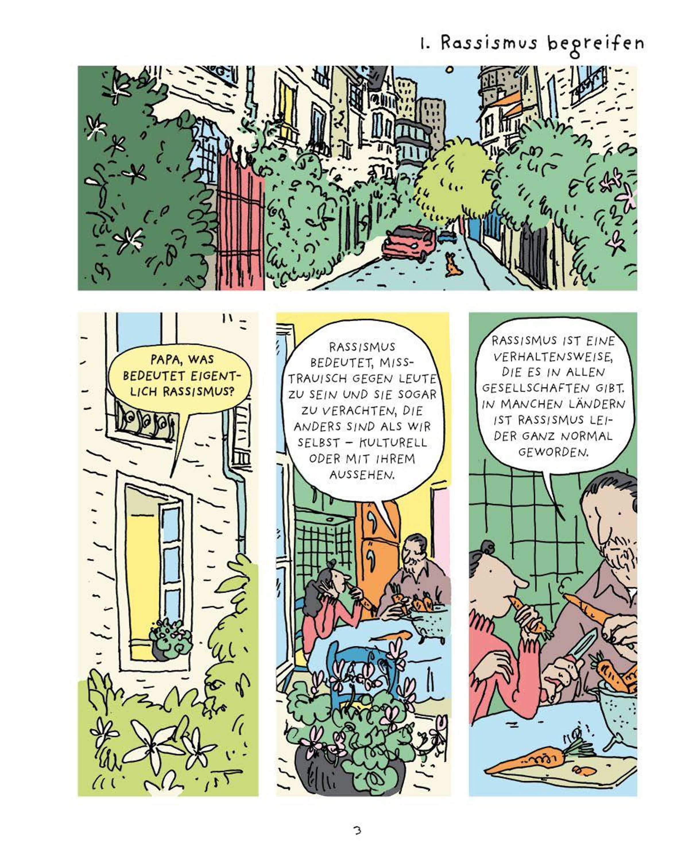 'Was bedeutet eigentlich Rassismus, Papa?', fragt Merjem ihren Vater, den sie auf einer Demonstration gegen neue Einwanderungsgesetze begleitet hat. Und der Papa, der bekannte marokkanisch-franzo¿sische Autor Tahar Ben Jelloun, antwortet, dass zwar niemand als Rassist geboren wird, da es auch keine menschlichen Rassen gibt, dass es unter Menschen aber ganz gewo¿hnlich ist, dass Fremde, die ins Dorf oder in die Nachbarschaft kommen, misstrauisch beäugt werden. Und dass diese gewo¿hnliche Reaktion auch ausgenutzt wird, um Menschen zu den Zugeho¿rigen zu erklären, die besser sind als Fremde und deshalb u¿ber die auch herrschen sollen. Und schon haben wir, je nach Kontext, kolonialen Rassismus, Antisemitismus oder Antiislamismus. Ben Jelloun hat sein Buch u¿ber die Frage seiner Tochter 1998 geschrieben, und es ist immer wieder aufgelegt worden. Vor zwei Jahren hatten die polnische Szenaristin Marzena Sowa und die Zeichnerin He¿le¿ne Le Cam die Idee, aus diesem wichtigen Erfolgsbuch einen Comic zu machen, und das Ergebnis hat dem urspru¿nglichen Autor sehr gefallen.