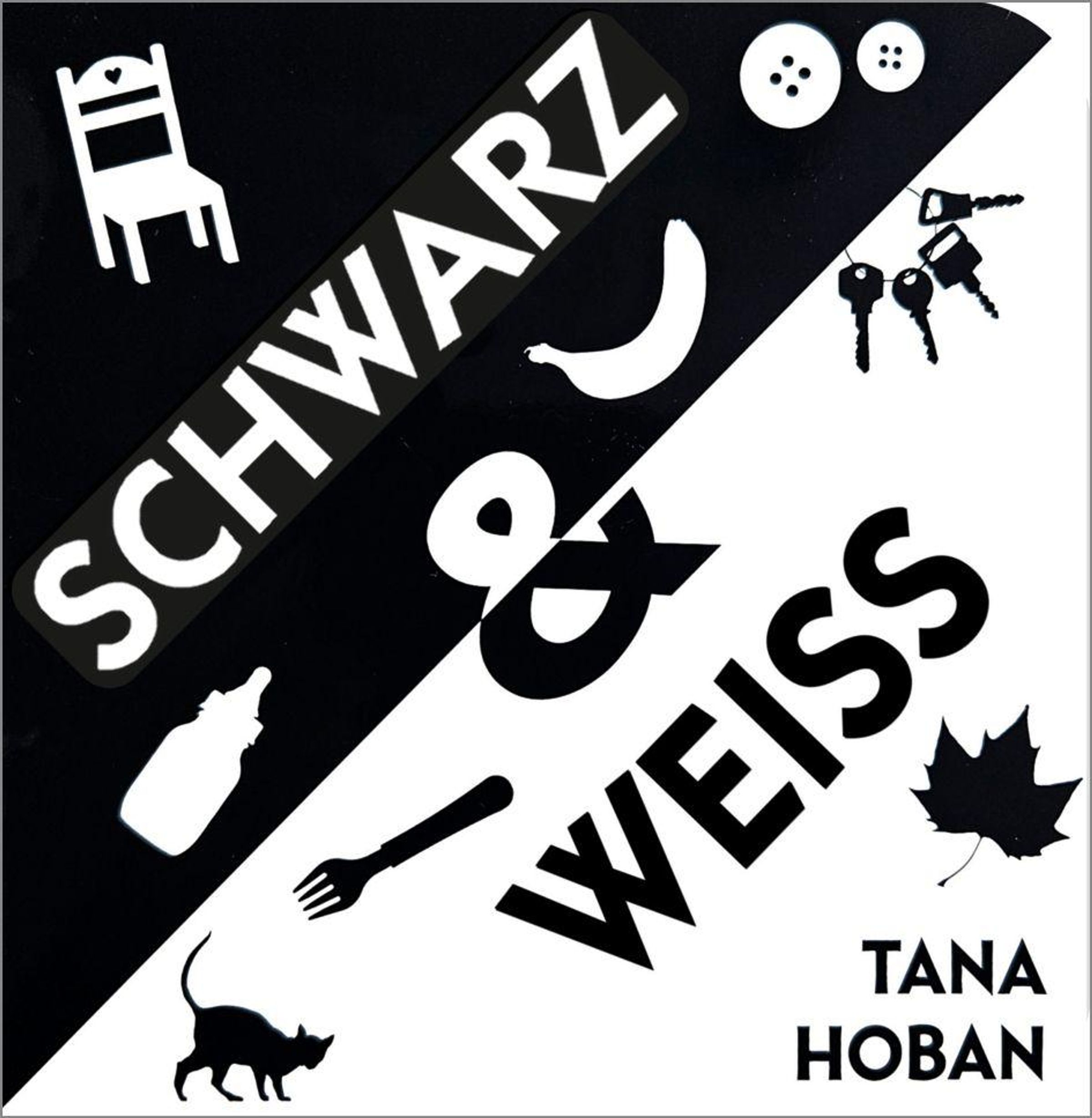 Schwarz-Weiß-Illustration: Stuhl, Bananen, Schlüssel, Knöpfe, Katze, Gabel, Flasche, Ahornblatt. Text: "SCHWARZ & WEISS" und "TANA HOBAN"., Buch