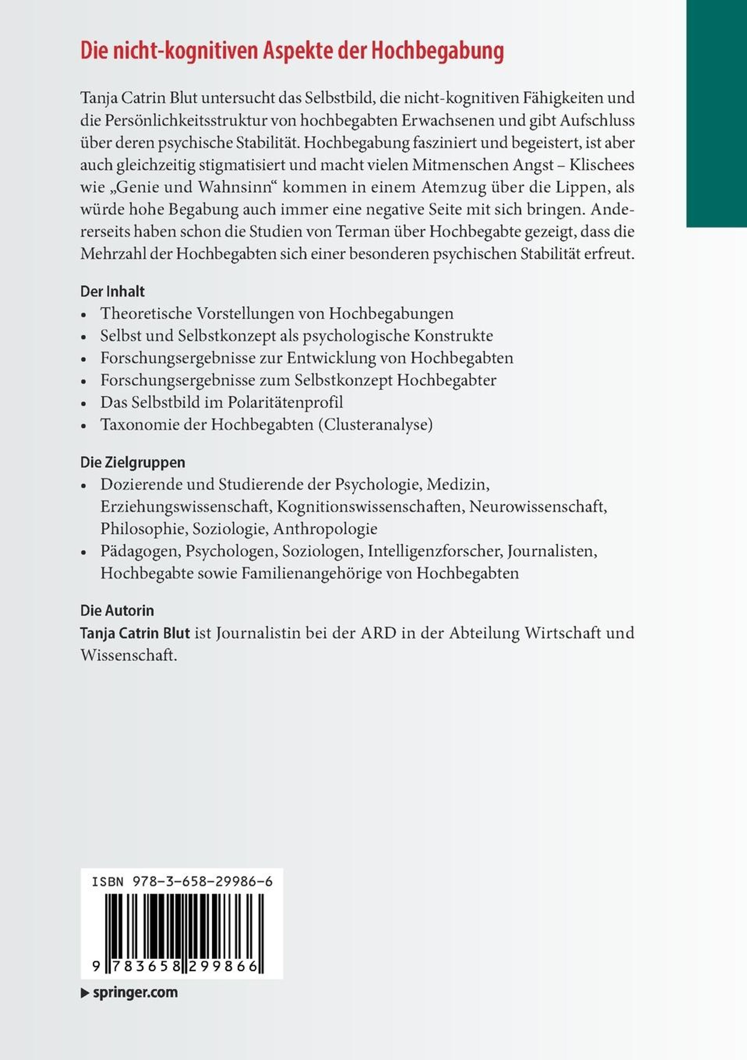 Tanja Catrin Blut untersucht das Selbstbild, die nicht-kognitiven Fähigkeiten und die Persönlichkeitsstruktur von hochbegabten Erwachsenen und gibt Aufschluss über deren psychische Stabilität. Hochbegabung fasziniert und begeistert, ist aber auch gleichzeitig stigmatisiert und macht vielen Mitmenschen Angst ¿ Klischees wie ¿Genie und Wahnsinn¿ kommen in einem Atemzug über die Lippen, als würde hohe Begabung auch immer eine negative Seite mit sich bringen. Andererseits haben schon die Studien von Terman über Hochbegabte gezeigt, dass die Mehrzahl der Hochbegabten sich einer besonderen psychischen Stabilität erfreut.